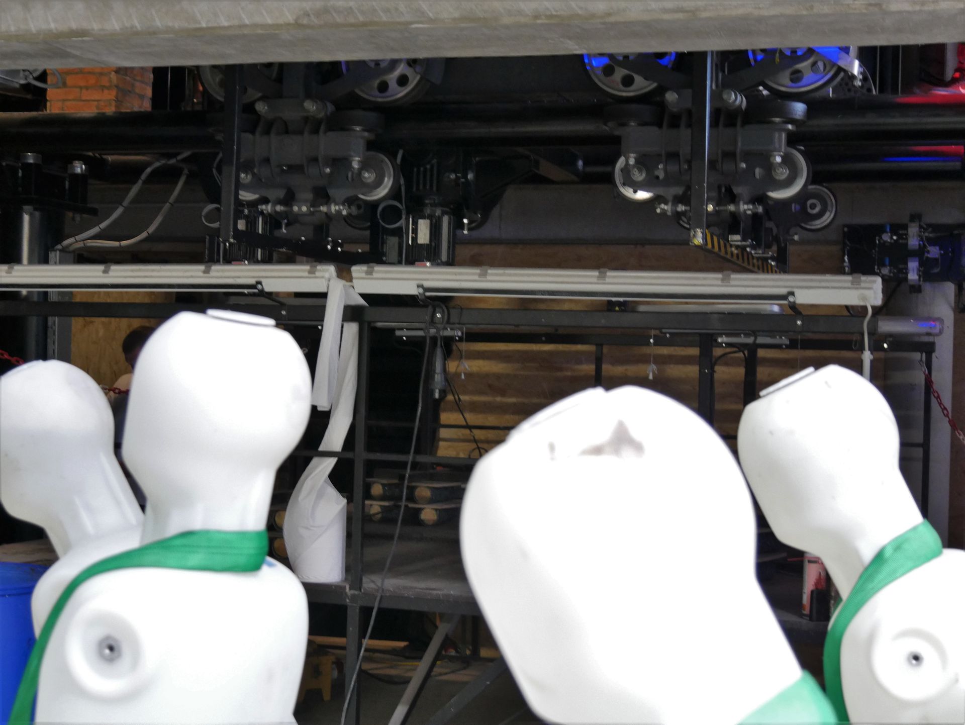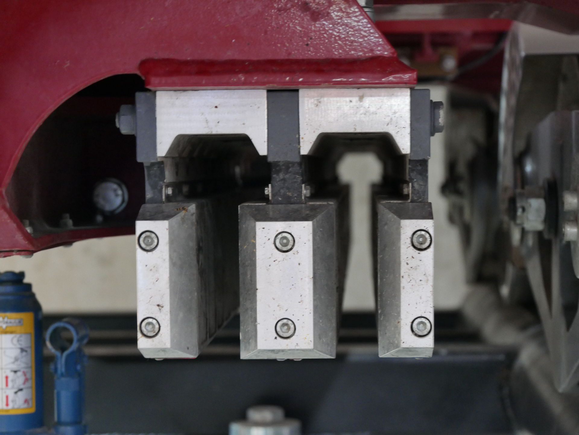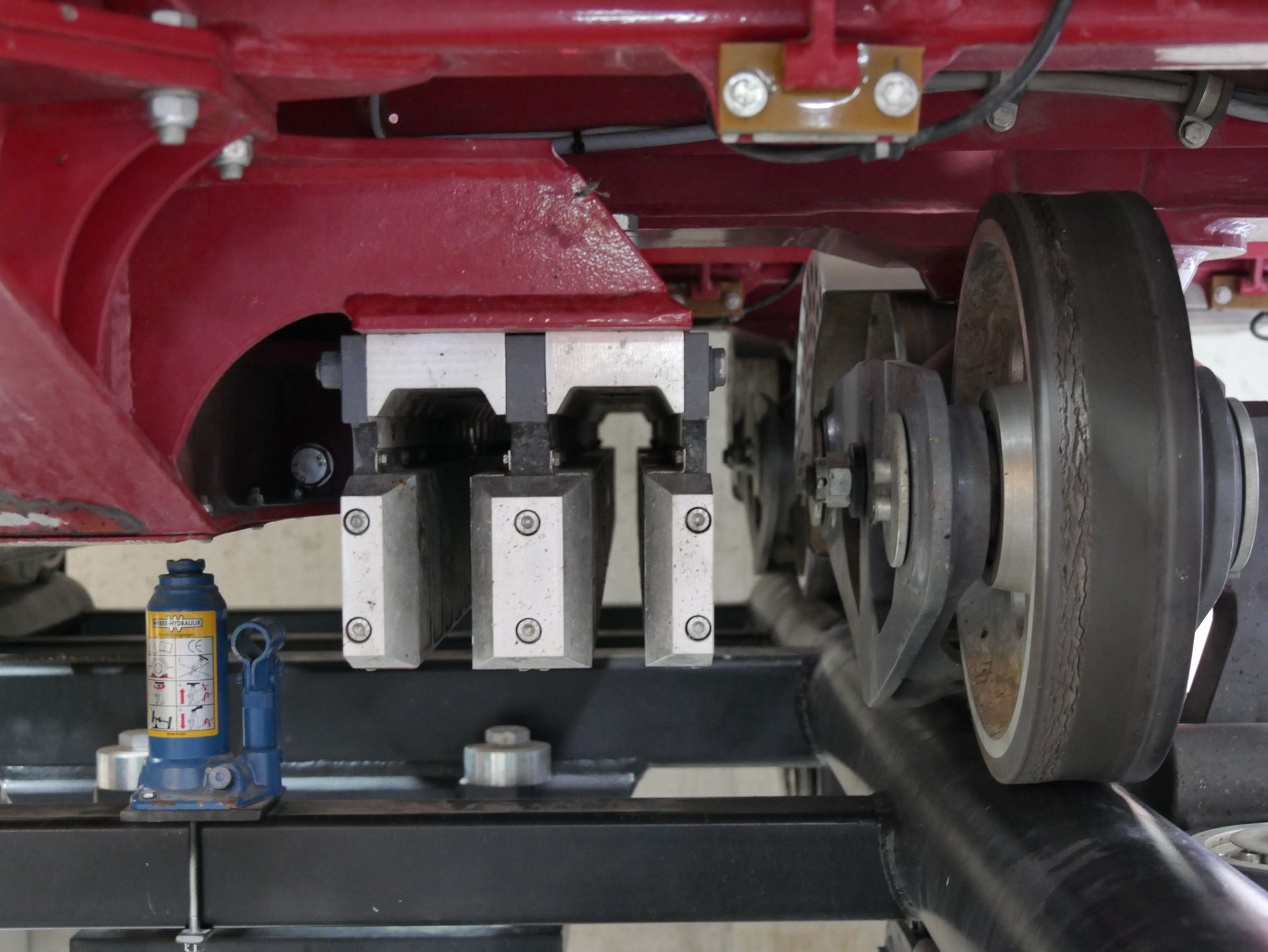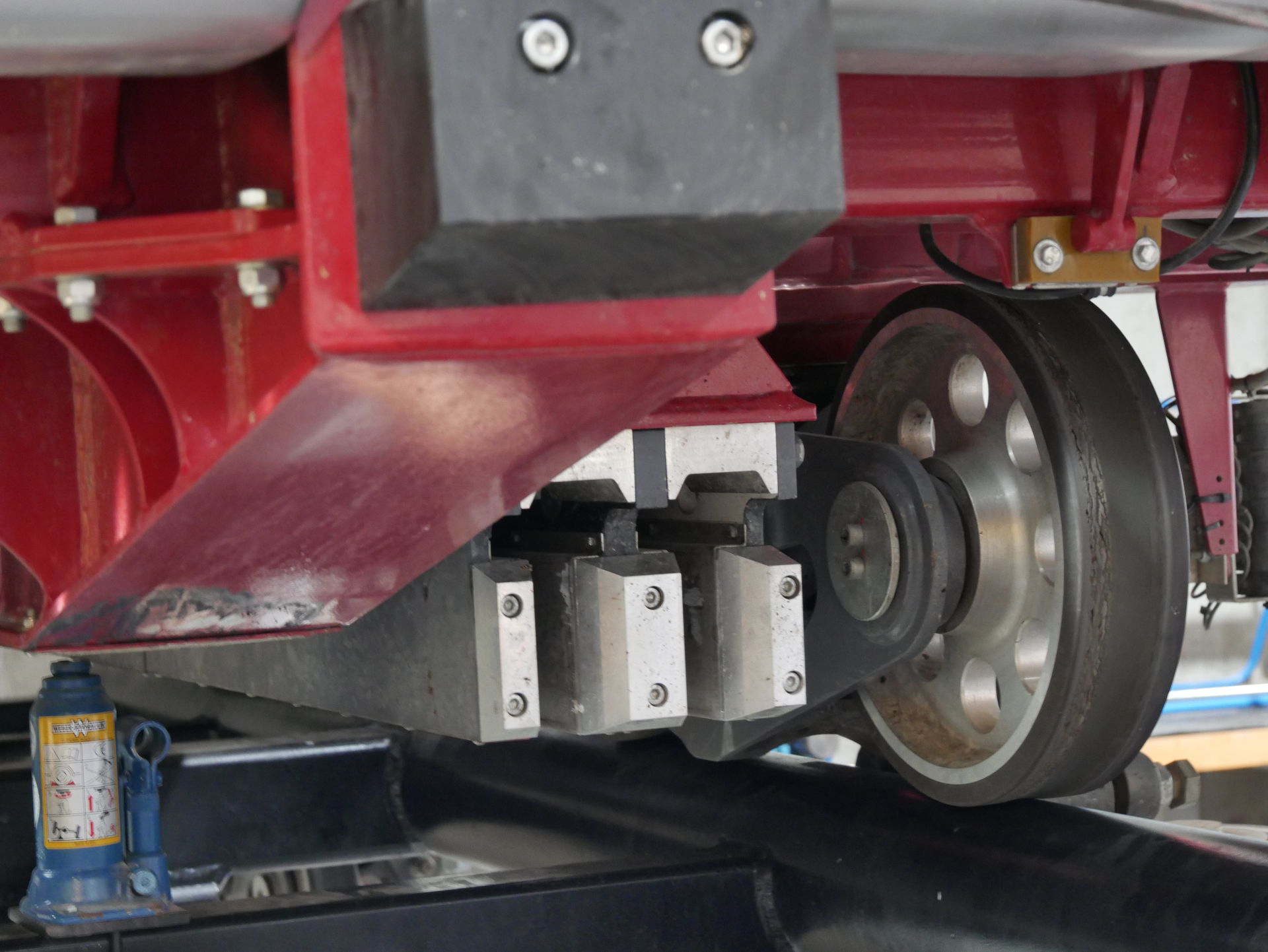 Bei den dreiteileigen Schwertern handelt es sich um den Rotor des LSM-Antriebs. Das Gegenstück dazu, den Stator, bilden die weißen auf der Schiene verbauten Elemente.