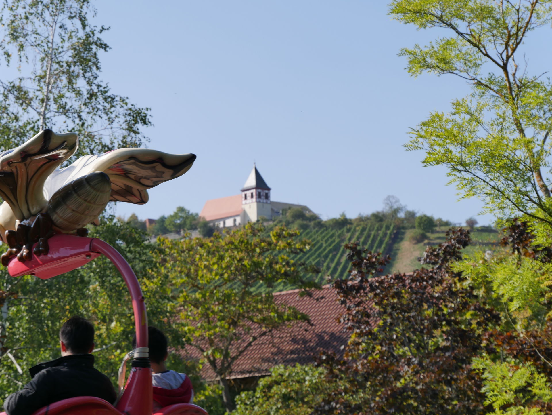 Bereits auf den letzten Kilometern kann man die tolle Lage des Parks erkennen. Das Areal liegt im Tal zu Füßen des Michaelsberg, auf dem Wein angebaut wird. Der Spaß hat schon auf dem Parkplatz begonnen, denn man kann sein Auto hier komplett kostenlos abstellen!