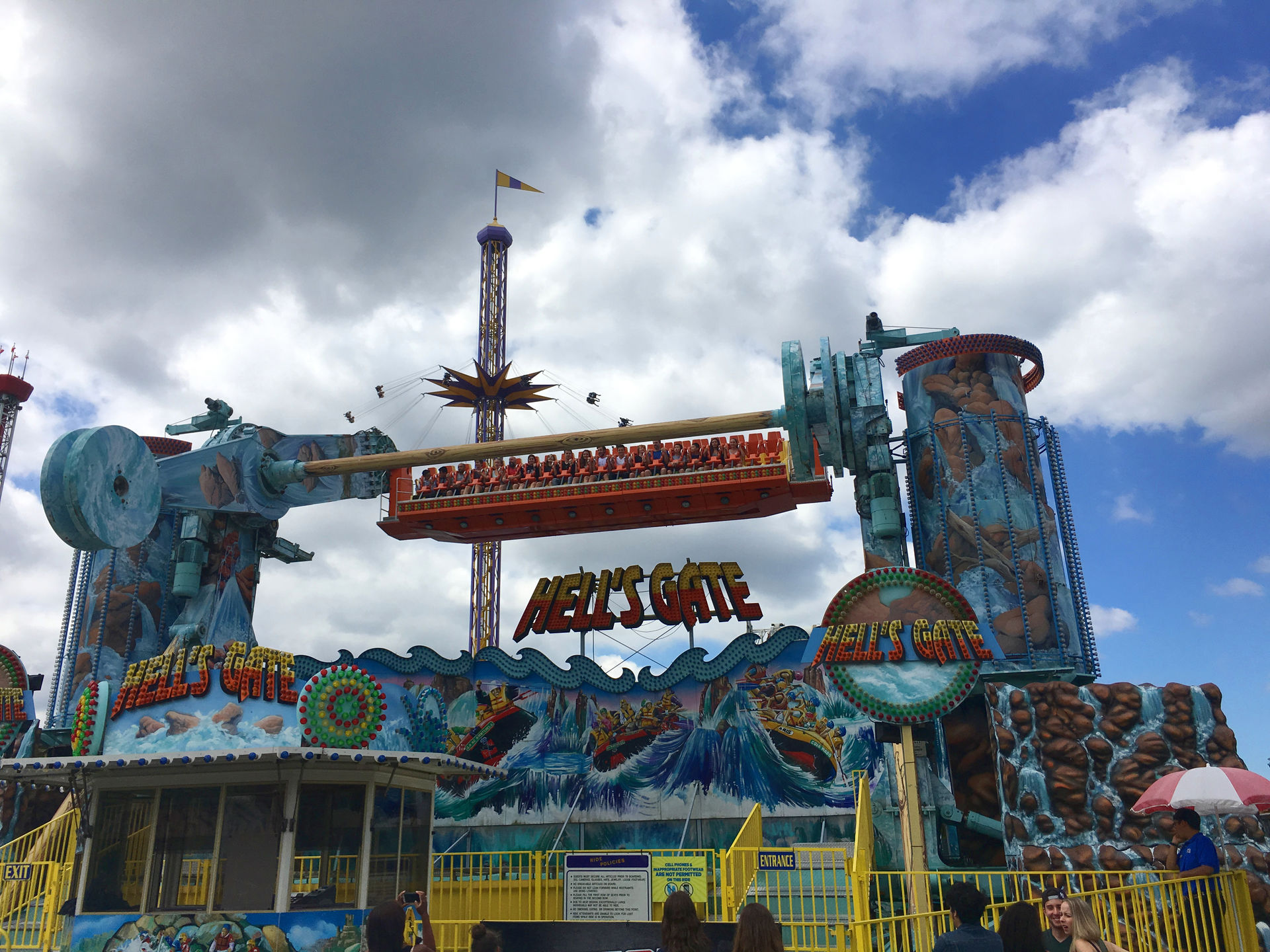 Weiter geht's, am Woodie vorbei, in den hinteren Parkteil auf die geschlossene Loopingbahn zu. Das Geisterhaus auf der linken Seite sollte man sprichwörtlich, auch wegen des zusätzlichen Eintritts, links liegen lassen. Was dann folgt, ist ein Top Spin aus dem Hause Huss. Sieht beeindruckend aus, erinnert etwas an eine damals in Deutschland reisende Anlage und hat den Namen "Hells Gate".