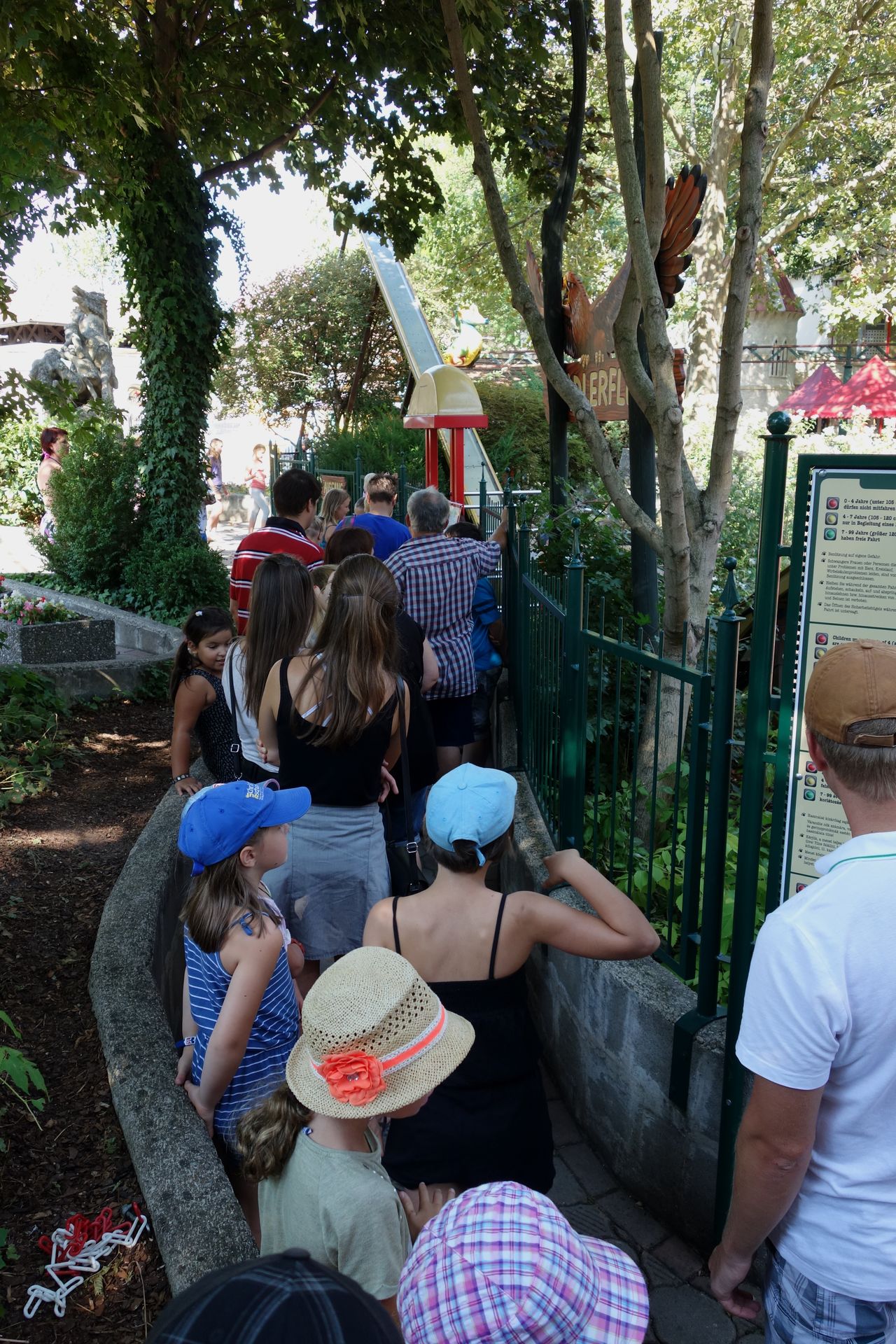 Die Warteschlange befindet sich sonnengeschützt hinter den Rundbögen. Wir standen wieder etwa 20 Minuten.