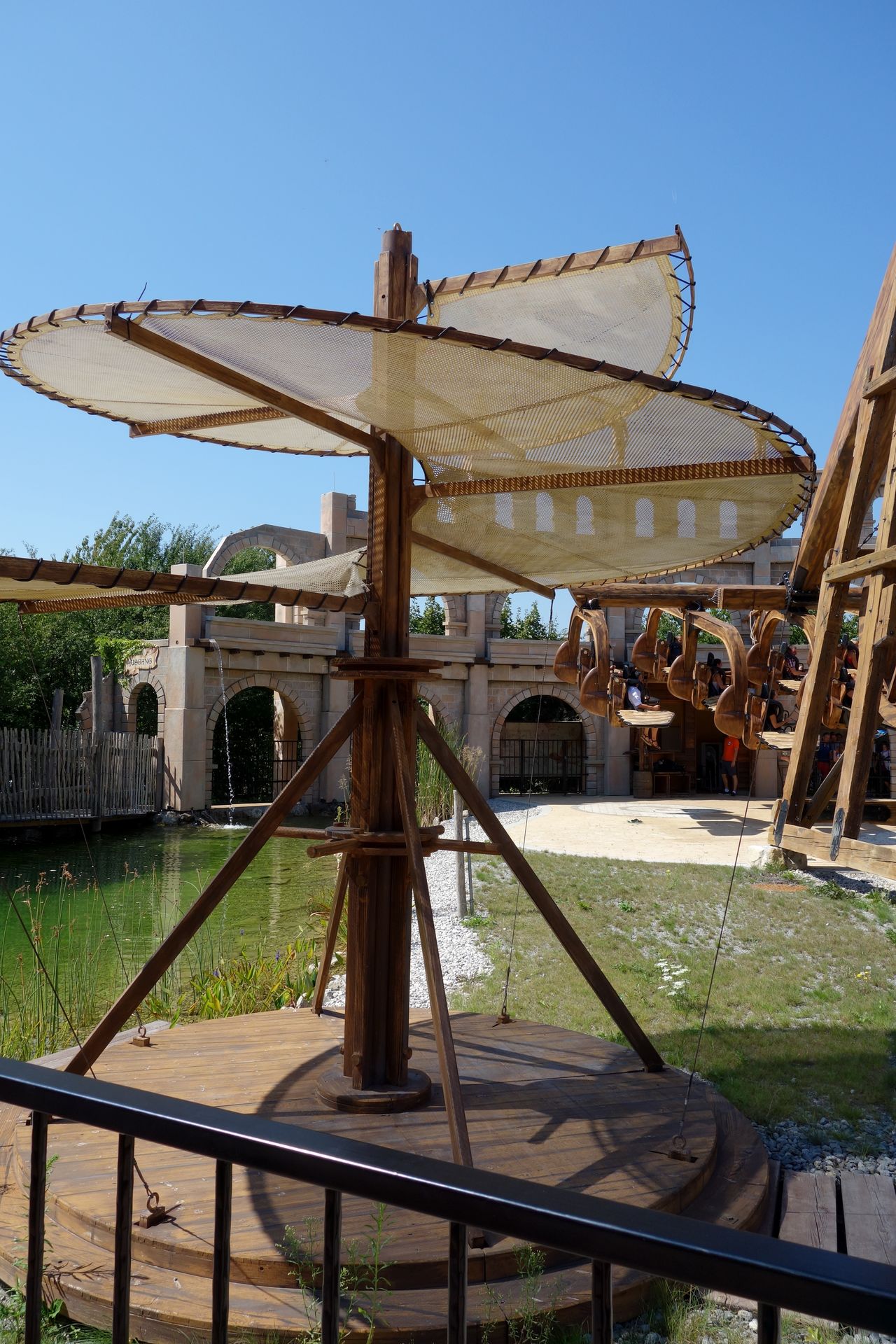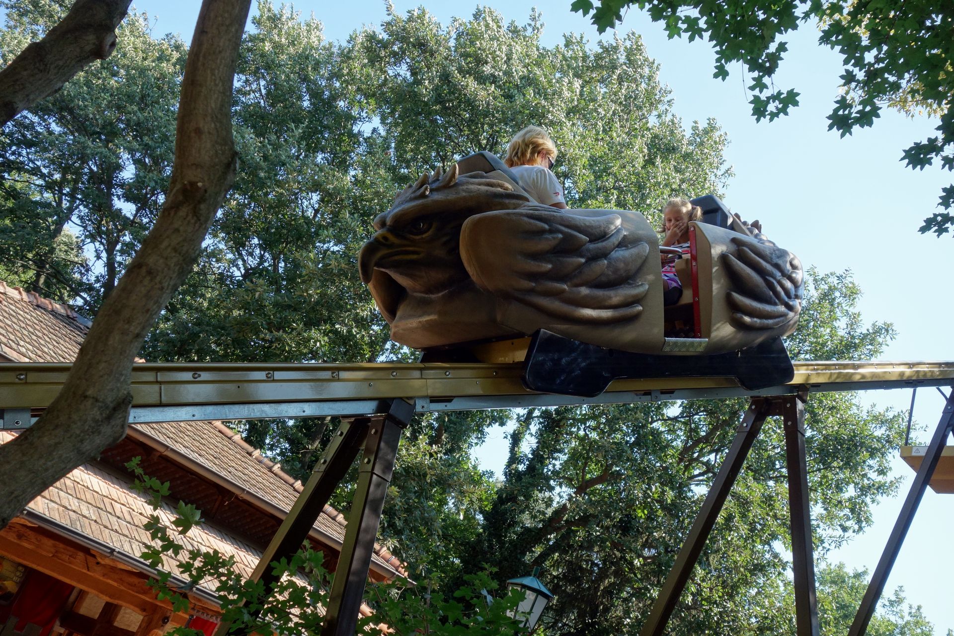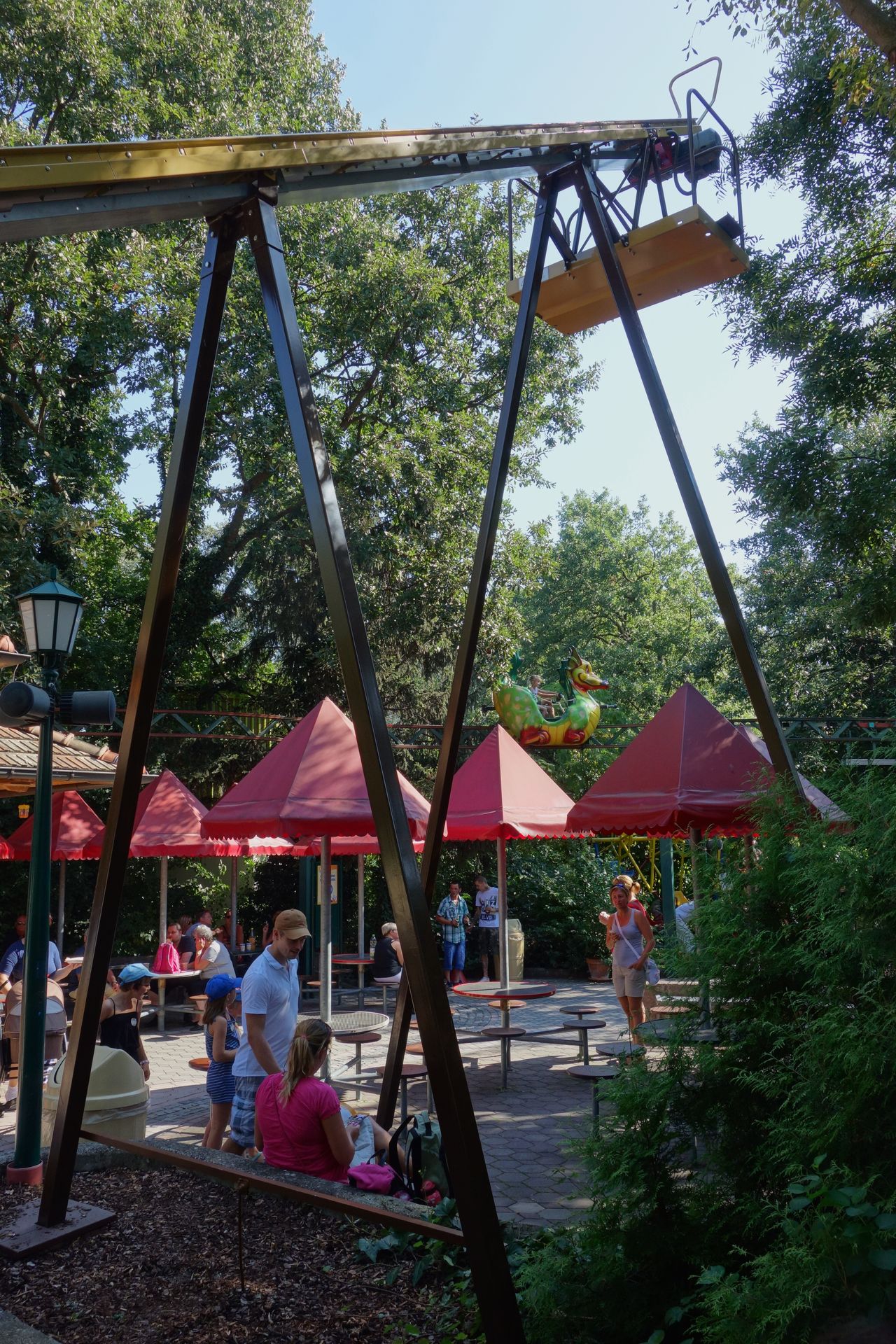 Es war also an der Zeit für Wiederholungsfahrten. Den Anfang machte die Rattenmühle, gleich nebenan tobten Nicolas und ich uns noch an den Riesenschaukeln aus. Dann gönnten wir uns mal ein Eis und entspannten etwas im Schatten. Schließlich begaben wir uns nochmal zum Götterblitz und drehten zum Finale noch eine überschlagsreiche Fahrt mit dem Sky Fly.