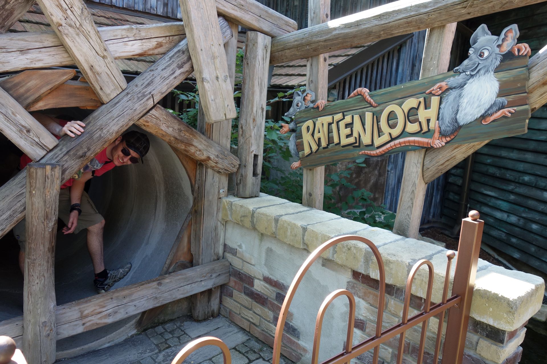Auch hier mussten wir natürlich etwas anstehen, letztlich saßen wir aber nach guten 10-15 Minuten in einem der als Ratten gestalteten Wagen, um die 19 Meter hohe und 430 Meter lange Fahrt zu absolvieren.