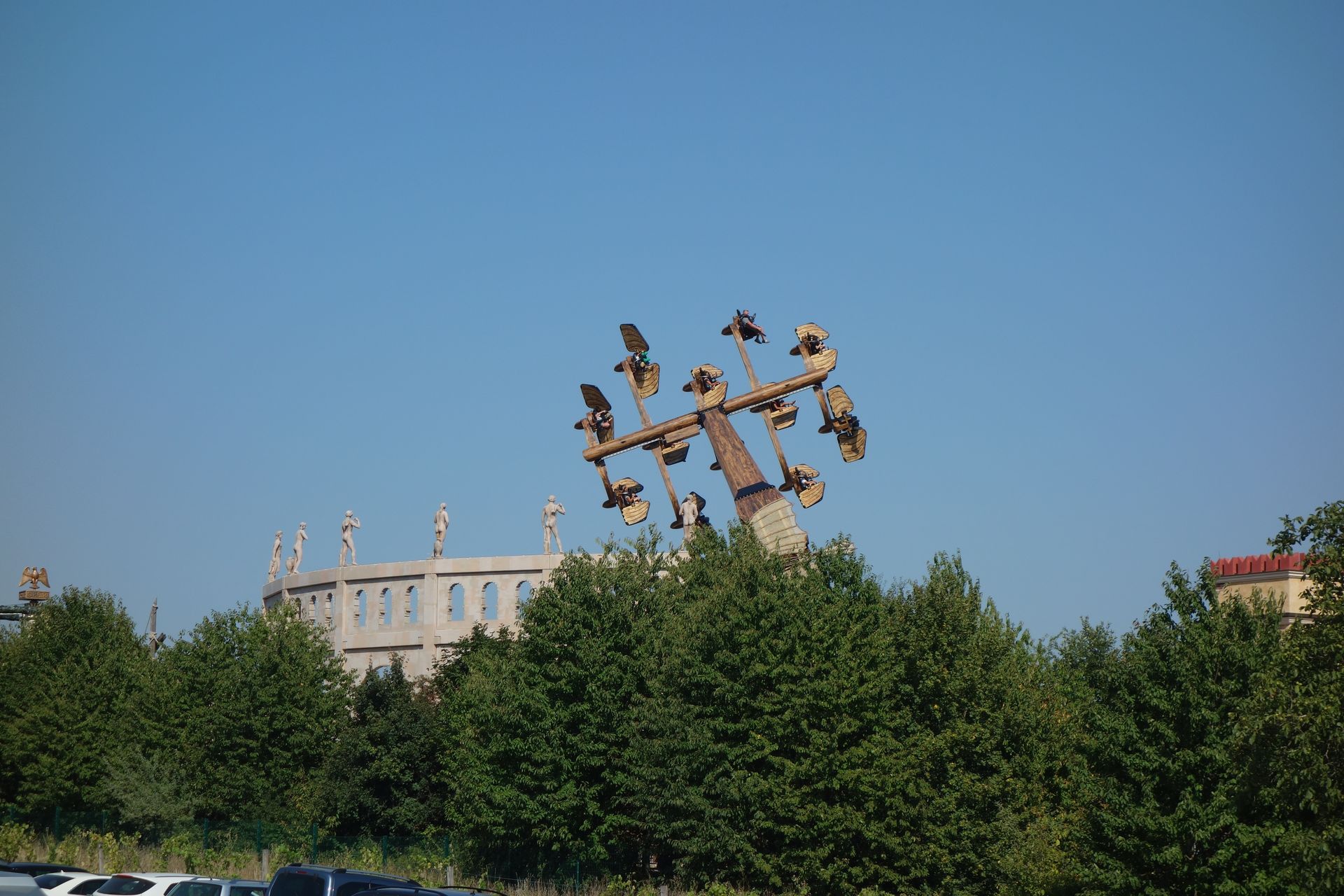 Gerstlauer ist mit großem Abstand die bestthematisierteste Anlage dieses Typs. Unfassbar, wie schön diese Dinger aussehen können, wenn man sich ein bisschen Mühe gibt. Auch von der Fahrt her spielt dieser Sky Fly in der oberen Liga mit. Nach meinem eher mäßigen Start mit den beiden Sky Rollern auf der Skandi-Tour und einigen Runden auf dem Sky Fly im Holiday Park war das hier nochmals eine ganz andere Erfahrung. Dank der Lage auf den Bergen am Neusiedlersee weht hier öfters mal ein laues Lüftchen, welches den drehfreudigen Mitfahrern gerne behilflich ist. So beginnt man tatsächlich schon nach einer guten halben Runde mit den Überschlägen und ist auch nicht mehr so einfach aufzuhalten. Also wenn die schwitzigen Hände den Griff am Flügel bis zum Ende der Fahrt in Position halten können...