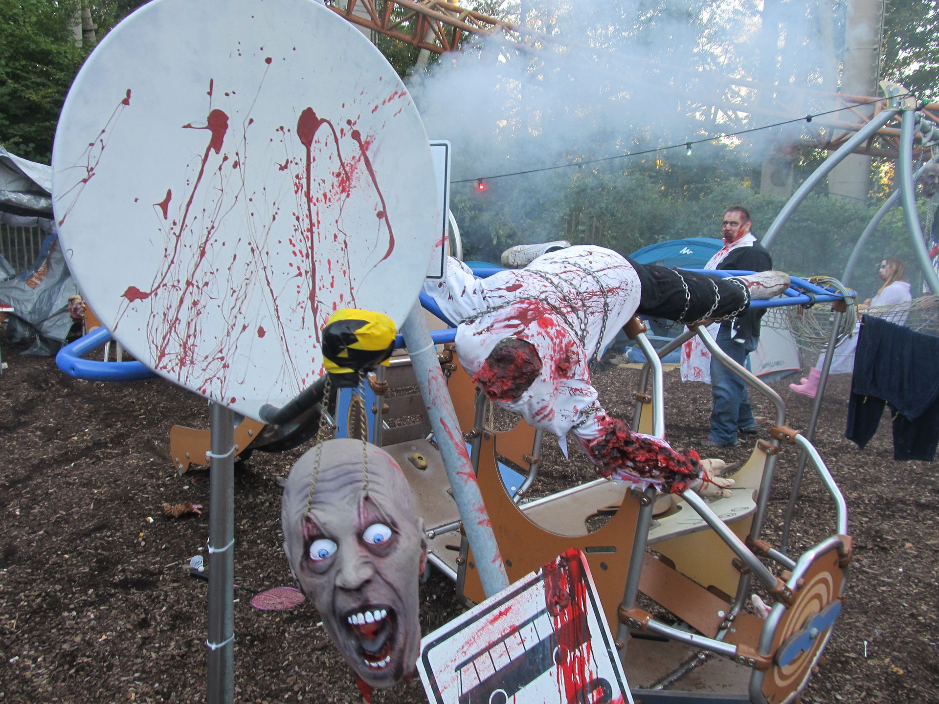 Es ist Mitte Oktober und damit ist in Deutschlands Freizeitparks die Halloweensaison wieder in vollem Gange. Mit dabei ist auch der pfälzische Holiday Park, der seine beliebte "Rocking Halloween"-Veranstaltung in diesem Jahr weiterführt und sogar ausgebaut hat. An insgesamt drei Samstagen (15., 22. und 29. Oktober) verwandelt sich der Park jeweils ab den Nachmittagsstunden in eine gruselige Welt voller Untoter. Der Park hat an diesen Tagen bis 22 Uhr geöffnet (Fahrattraktionen bis 21 Uhr), sodass die Parkgäste die schaurig schönen Stunden rund um den Sonnenuntergang und der nachfolgenden Dunkelheit ausgiebig genießen können. Natürlich findet das Event auch am Halloweentag selbst (31. Oktober) statt. Hier sind die Öffnungszeiten sogar etwas verlängert, der Park schließt erst um 23 Uhr. Neben vielen herbstlichen Dekorationen, welche den gesamten Park schmücken, werden den Besuchern noch weitere speziell für dieses Event eingerichtete Highlights geboten. So hat der Park in diesem Jahr zwei sogenannte Mazes eingerichtet, welche selbst hartgesottenen Zeitgenossen das Fürchten lehren werden. Gegenüber dem letzte Jahr wurde auch die Anzahl der Darsteller noch einmal von 25 auf 48 angehoben.