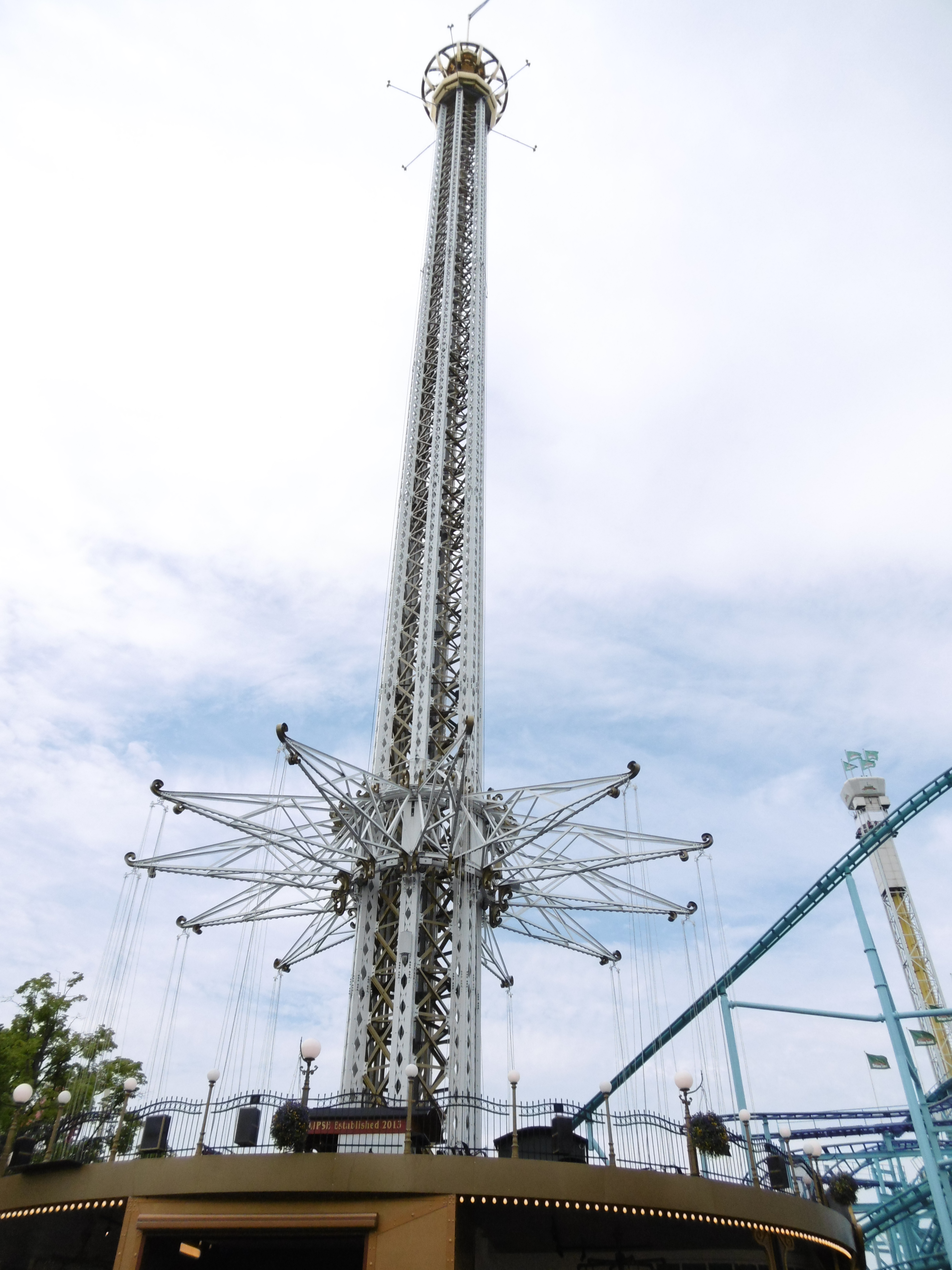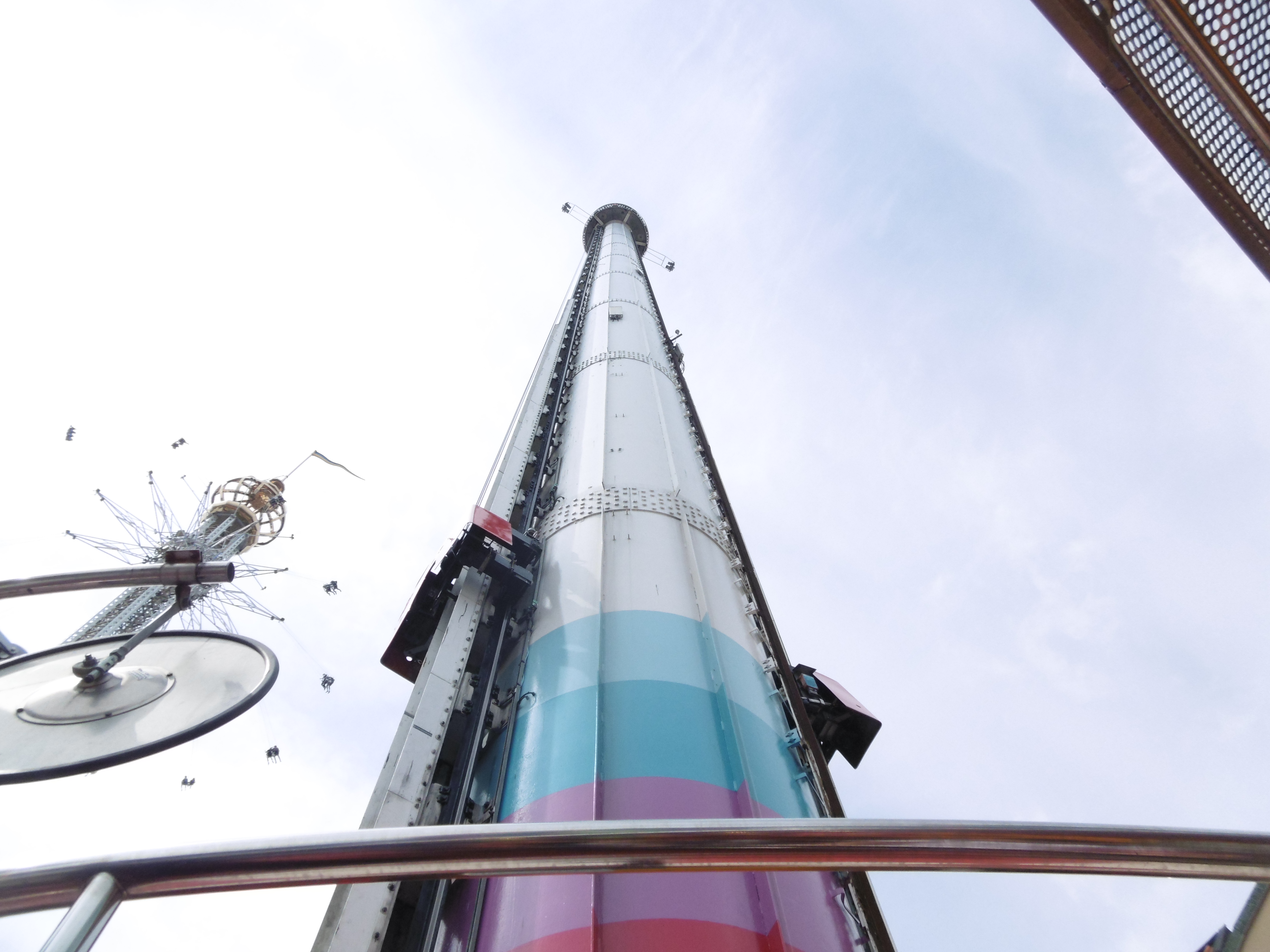 Davor bin ich nur den Lighthouse-Tower gefahren, der gegen diese Maschine der zweiten Starflyer-Generation aber im Nachinein mickrig wirkt. Dort oben hat der Fahrgast einen wunderschönen Blick auf Stockholm und Gröna Lund. Problematisch sind nur die Windbedingungen, die dazu führen, dass sich die Sitze weit nach außen drehen und meine Hand an den Kettengliedern festkrallen ließen. So wackelige Beine hatte ich nach einer Fahrattraktion noch nie, wodurch ich aber den etwas kleineren Praterturm ohne große Probleme meistern konnte. Für Leute mit Höhenangst ist dies aber eindeutig die Angstattraktion und der Adrenalinspender in Gröna Lund.