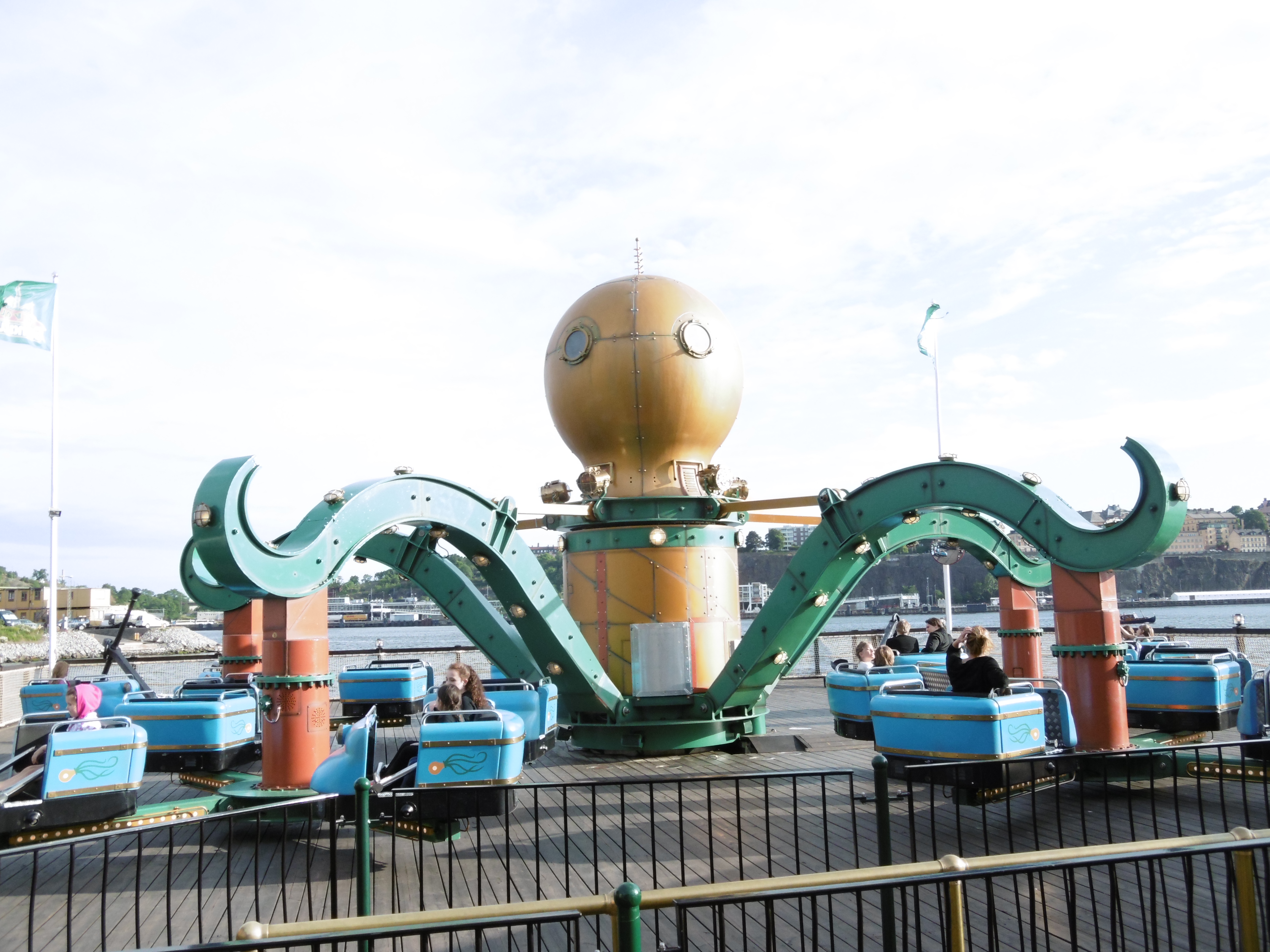 Anschließend stand eine Fahrt mit dem Flygande Mattan an, von dem ich leider kein Bild gemacht habe. Der Fliegende Teppich von Zierer sieht von außen sehr entspannend aus, aber an Bord bietet das Ding eine unglaublich lustige Fahrt. im Onride-Video vom Alex sind Simon und ich zu sehen, wie wir bei den Abfahrten ohne körperliches Zutun immer wieder aufgestanden sind. Irgendwann geht die Abfahrt dann in eine waagerechte Bewegung über, wodruch man sich ohne festhalten nicht mehr im Sitz halten könnte. Da es mein erster Fliegender Teppich war, hatte ich keine Ahnung gehabt, was mich hier erwarten wird, aber bekommen habe ich die wohl im positiven Sinne überraschenste Fahrt in Stockholm.