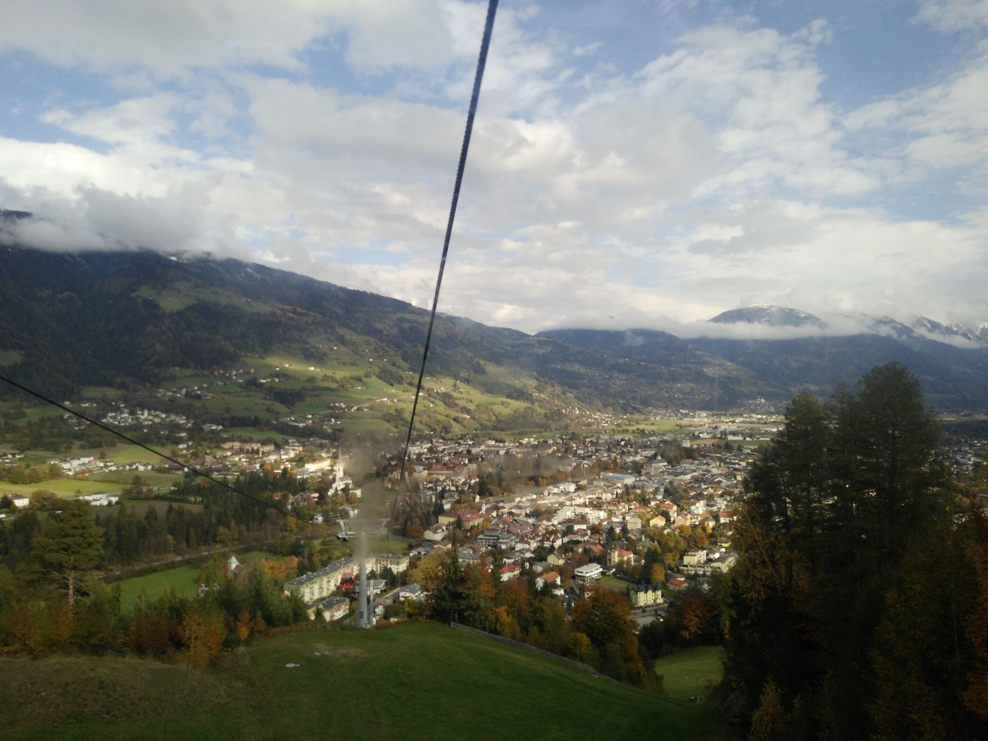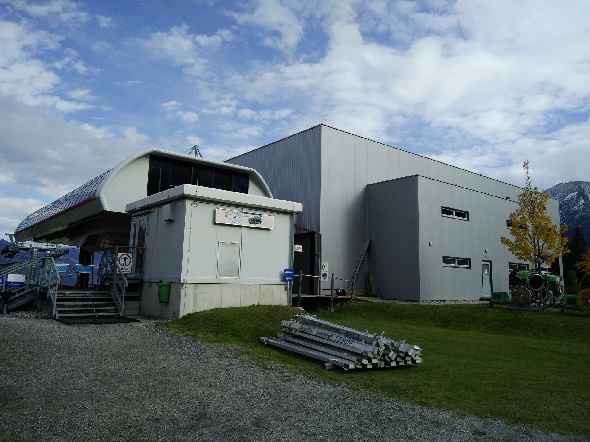 Mit der Gondelbahn geht es nach oben. Die offenen Sessel waren schon ausgehangen worden.