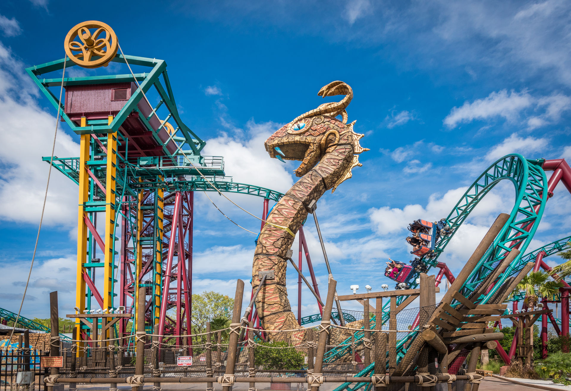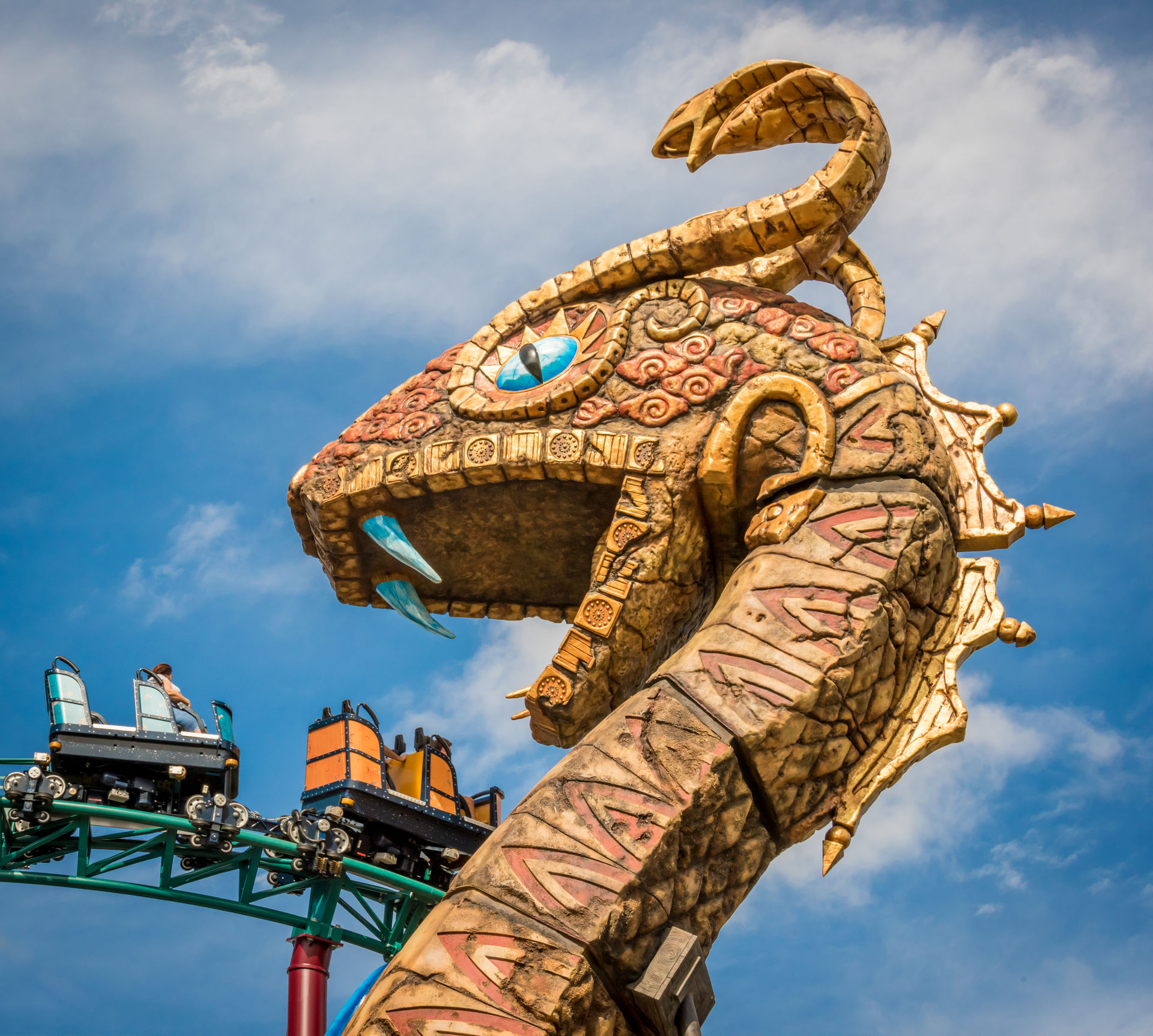 Mack. Was für ein schmucker Coaster, was für ein reizvolles Setting. Der Schwarzwald-Spinner mit Wüsten-Thema mag nicht den größer-schneller-weiter-Nerv treffen, begeistert aber Besucher von Busch Gardens mit liebevoller Aufmachung, einer aufwändigen Queue und einer spannenden Storyline. Auch technisch lässt sich der Fluch der Schlange nicht lumpen: Endlos-Laufband in der Station, Vertikal-Aufzug statt Lifthill, Außen-
