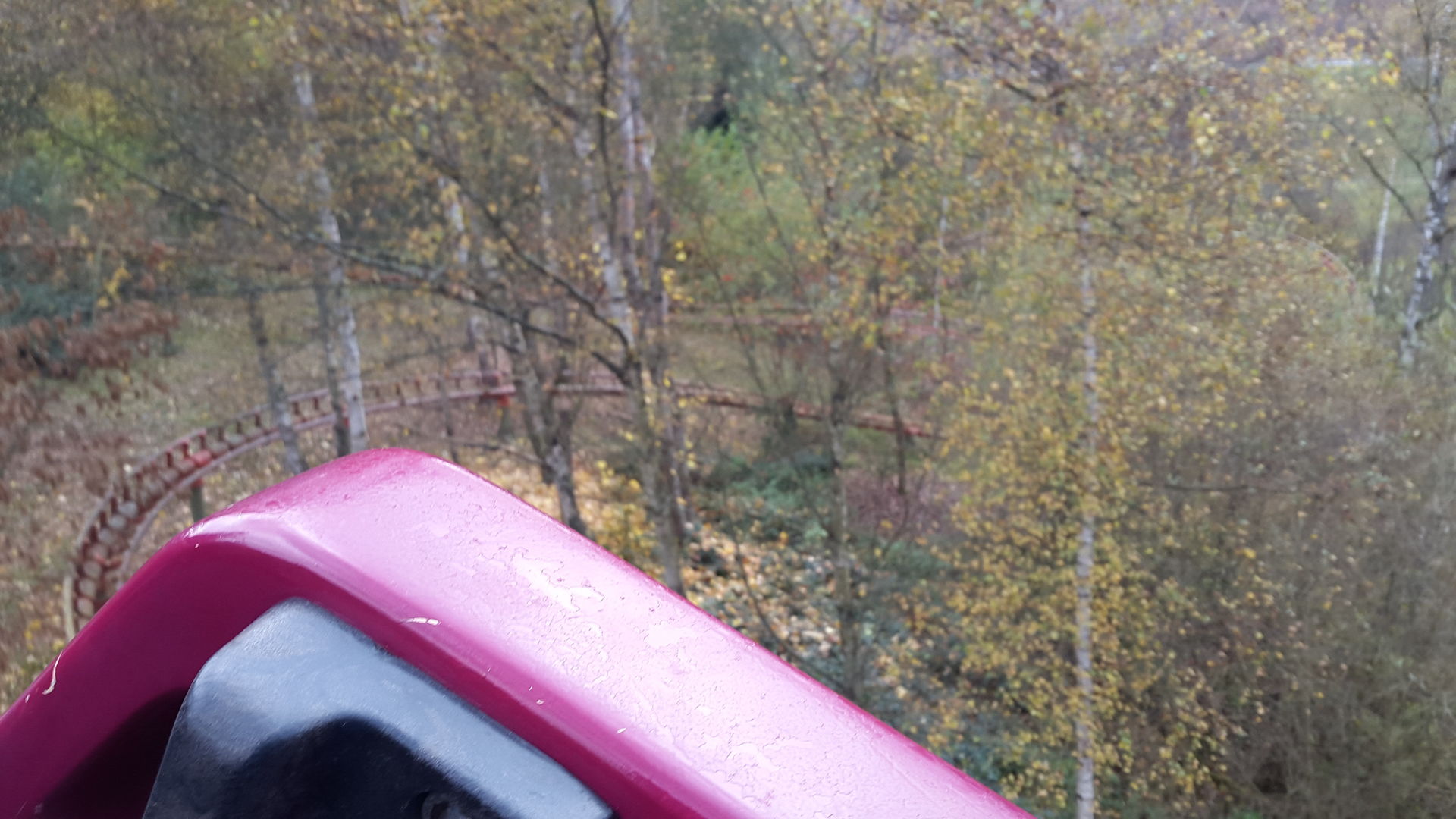 Der lange und träge Zug braucht etwas um in Gang zu kommen. Nach dem Predrop geht es dann einigermaßen flott durch die herbstliche Landschaft. Die Wagen bieten dabei sehr viel Bewegungsfreiheit.