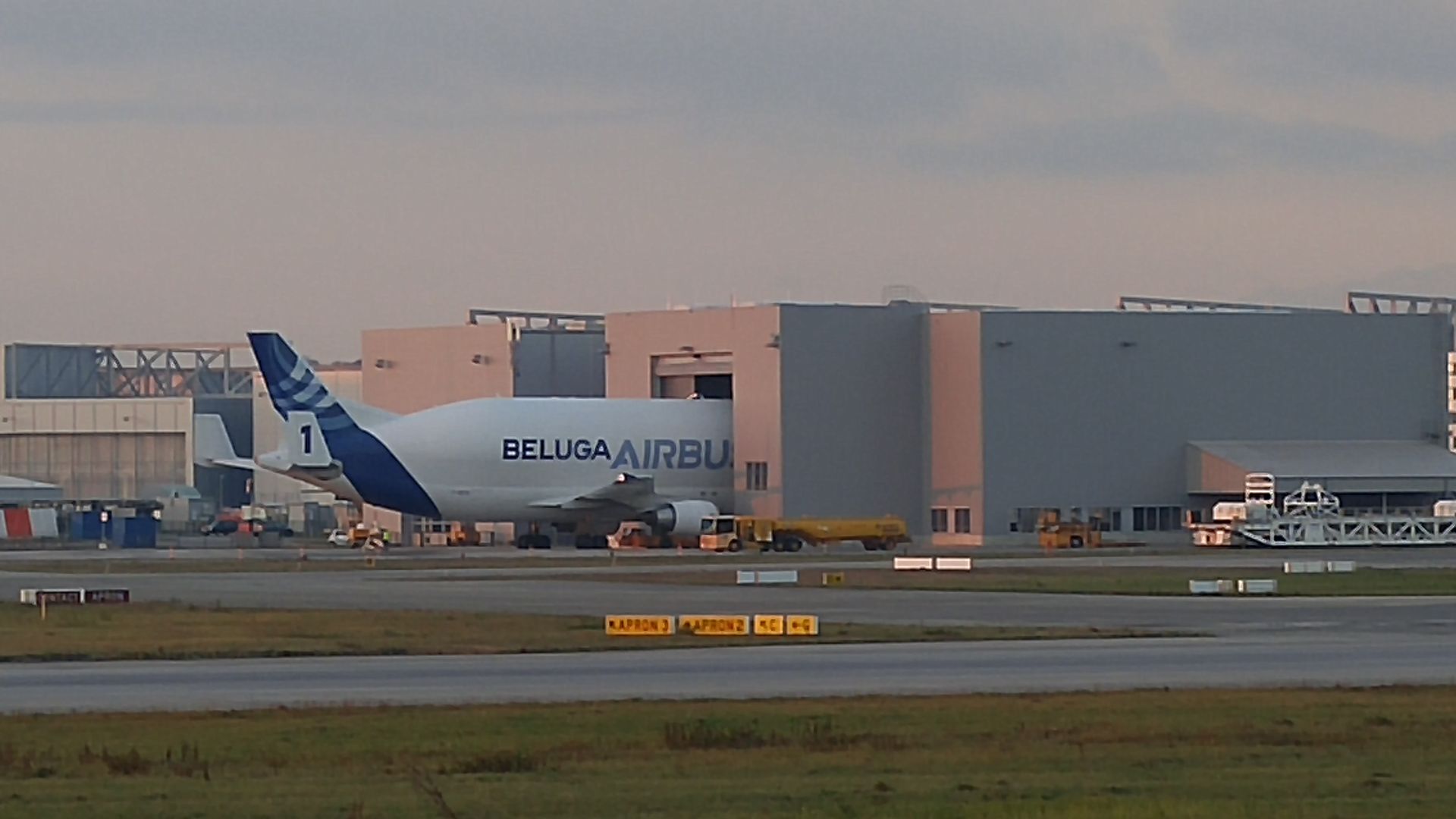 Zeitgleich mit uns landete auch ein überaus hübscher Beluga Airbus, die zwar etwas aussieht wie ein Beluga, aber eigentlich eher hässlich wie ein Nacktmull ist. Naja, immerhin kann er fliegen. Also der Airbus, nicht der Nacktmull.