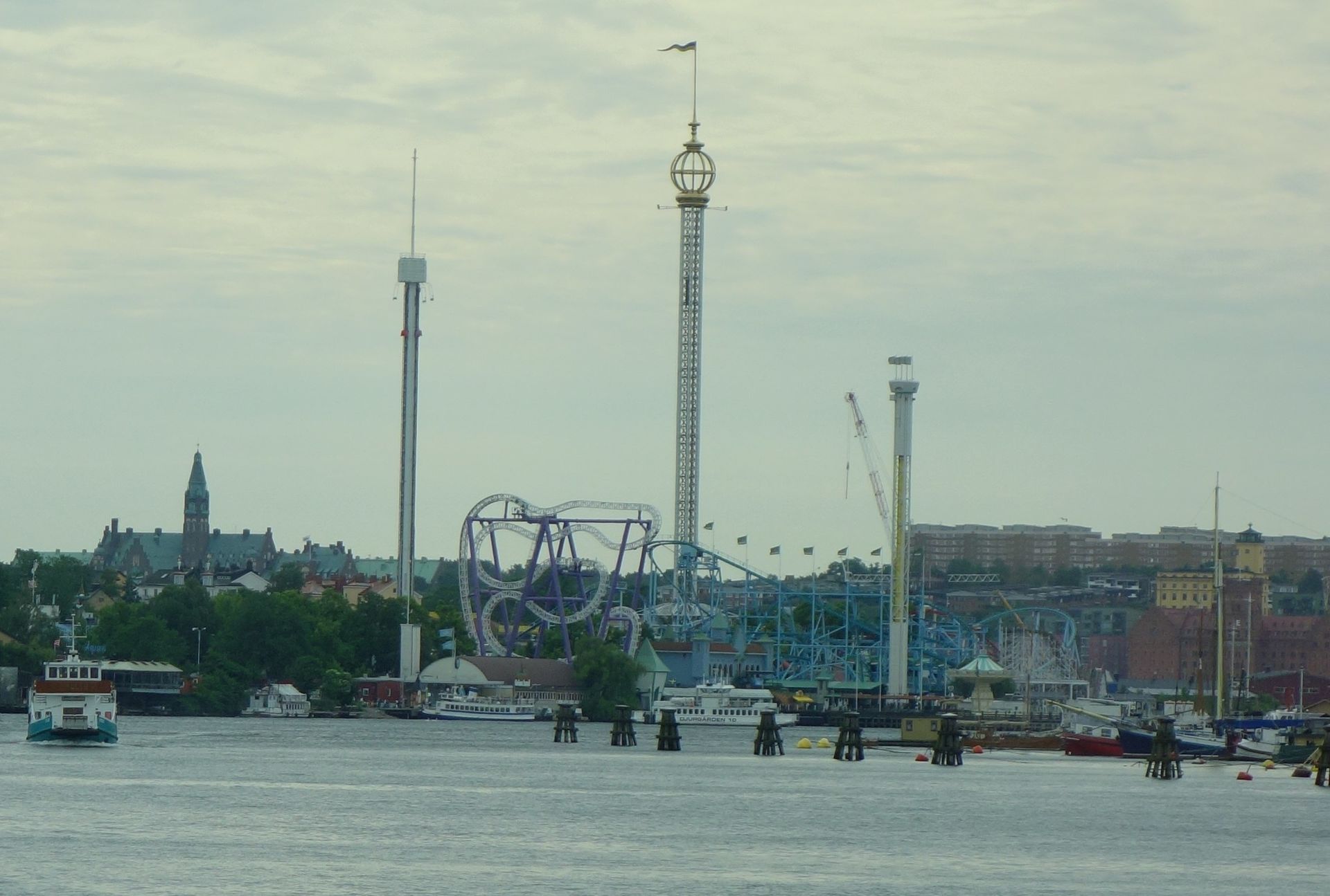 Ja, richtig. Da stehen mehrere Achterbahnen und diverse weitere Fahrgeschäfte quasi mitten im Hafen von Stockholm. Allerdings auf der anderen Seite des Wassers, weshalb wir uns noch weitere knapp sieben Minuten durch den Stadtverkehr quälen mussten, bis wir endlich auf der Halbinsel Valdemarsön ankamen. Wobei der offizielle Name der Insel kaum noch Erwähnung findet, im allgemeinen Sprachgebrauch hat sich die Bezeichnung des Stadtteils Djurgården auch für die Insel selbst durchgesetzt. Bis 1809 war die 279 Hektar große Halbinsel königliches Jagdrevier, und noch heute bildet sie eine "grüne Lunge" inmitten der Stadt mit viel Wald, diversen Freizeiteinrichtungen und mehreren Museen. Und eben dem Freizeitpark, wegen dem wir hier waren. Gröna Lunds Tivoli.