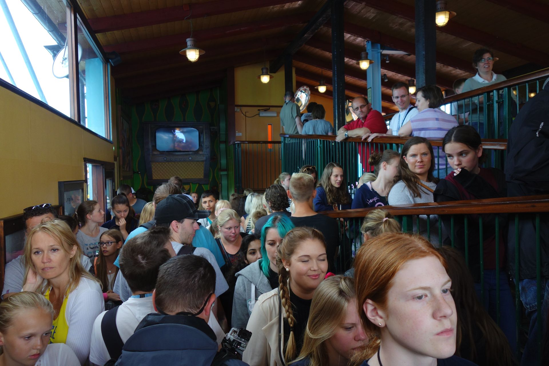 Ja, da geht es tatsächlich zweimal vor und zurück, ehe es die Rampe hinaufgeht. Selbst bei Six Flags hätte man dort wohl nur einen Zick-Zack eingebaut. Eine Einzelperson passt da geradeso durch, beim Weitergehen muss man aber schon aufpassen, dass man nicht mit den Leuten in der Nachbarspur zusammenstößt. Und das, wo man auch noch von einigen Onride-Videos auf dem kleinen Fernseher im Hintergrund abgelenkt wird. Schon irgendwie verrückt.