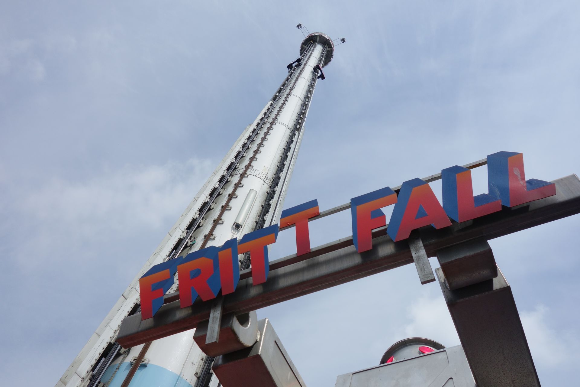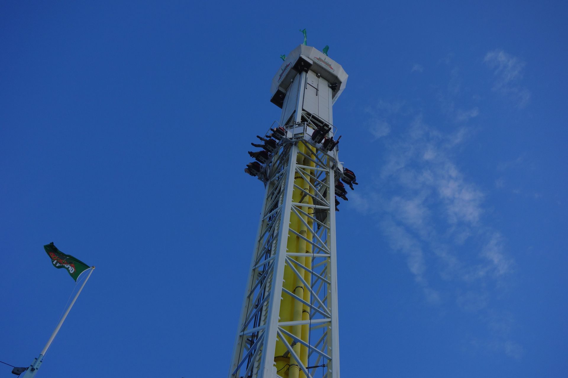 Direkt daneben steht der erste von aktuell drei Türmen. Ein 80 Meter hoher Drop Tower von Intamin.