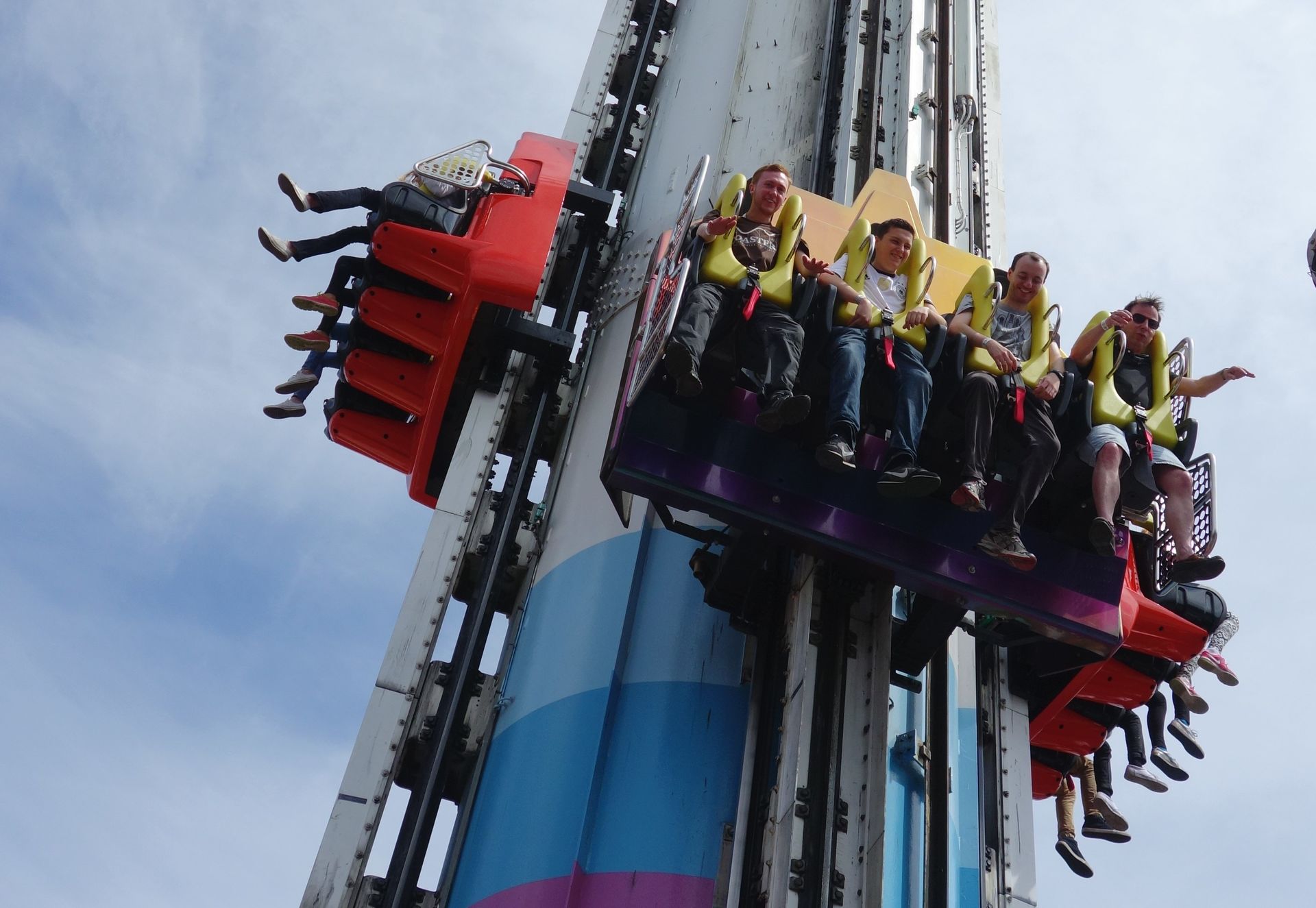 Der Turm selbst stammt bereits aus dem Jahr 1966, damals hing jedoch noch eine gewöhnliche Aussichtskanzel dran. Für die Saison 1998 wurde die dann gegen vier Drop-Tower-Spuren ersetzt, von denen wiederum eine 2004 zur StandUp-Tilt-Spur umgerüstet wurde - natürlich mit separatem Anstellbereich. Während man bei den normalen Gondeln quasi direkt einsteigen konnte, musste man für die Tilt-Variante glaube ich etwa 10 Minuten warten.