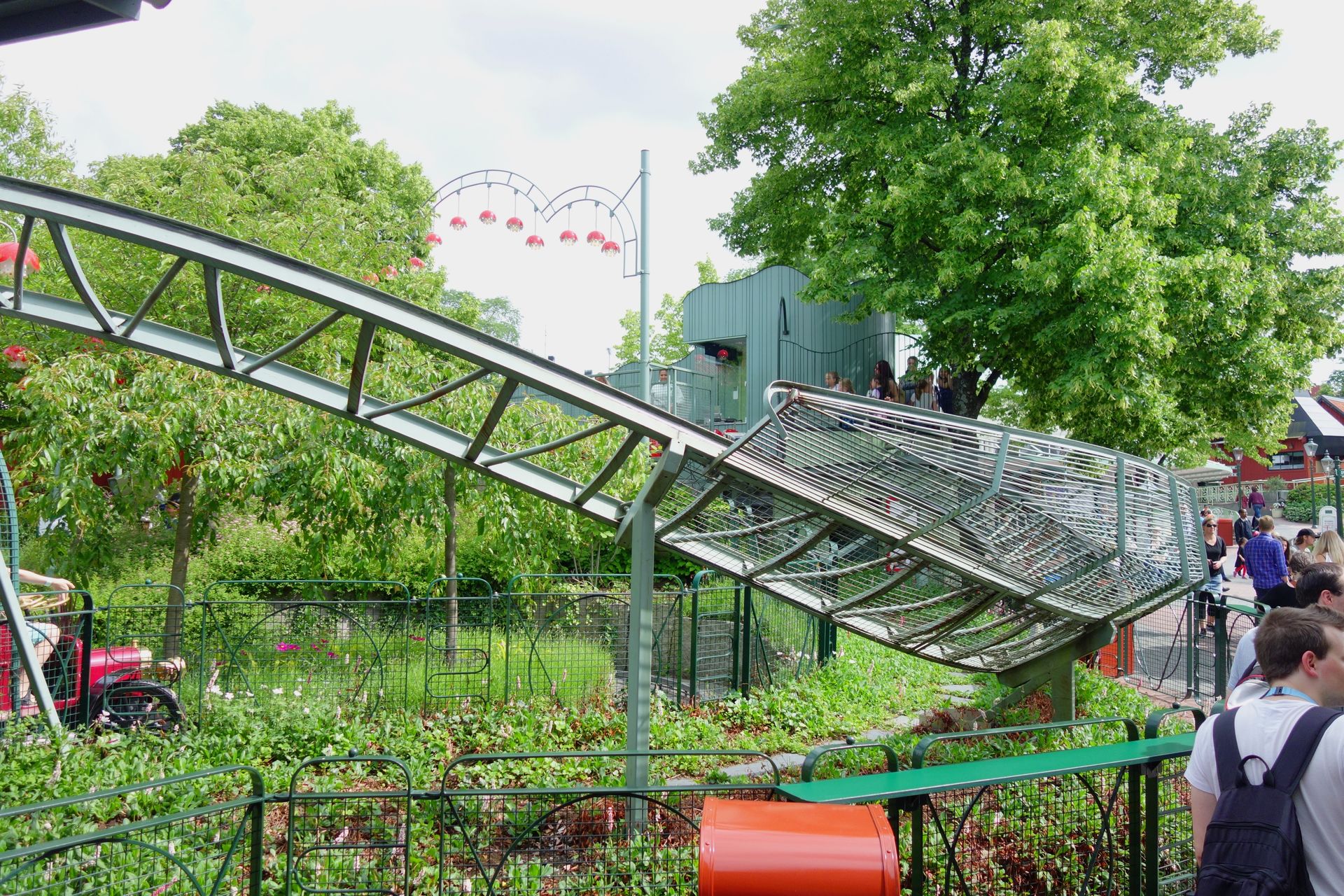 Für mich ist das Lustiga Huset aber wegen einem anderen Bauteil in Erinnerung geblieben. Nämlich dem allseits bekannten Drehtunnel. Das Problem bei diesen Tunneln ist ja in der Regel, dass man einfach nur die Wand am Ausgang anvisieren muss, schon ist die Illusion des drehenden Raumes zerstört. Das Phantasialand hat dem im Hotel Tartüff schon ganz gut entgegen gewirkt, indem man die Wand mitdrehen lässt. Dafür muss man aber wieder umdrehen, sodass dies nur in eine Laufrichtung funktioniert. Hier ist es dagegen absolut perfekt umgesetzt. Zunächst einmal ist es ziemlich dunkel, was das Anvisieren starrer Dinge erschwert. Der Tunnel selbst ist ebenfalls sehr dunkel gehalten, lediglich diverse bunte Punkte kreisen um den Laufsteg. Und zu guter Letzt befindet sich am Ausgang ein Spiegel, sodass sich auch dort alles dreht. Nach wenigen Schritten hing ich taumelnd am Geländer. Der Gleichgewichtssinn hatte absolut keine Chance. So krass habe ich das noch nie erlebt. Unsere Gruppe war dermaßen begeistert von diesem Effekt, dass wir einfach vier oder fünfmal außenrum zurück sind, um nochmal durchzugehen. Das Lustiga Huset darf man bei einem Besuch in Gröna Lund also definitiv nicht auslassen!
