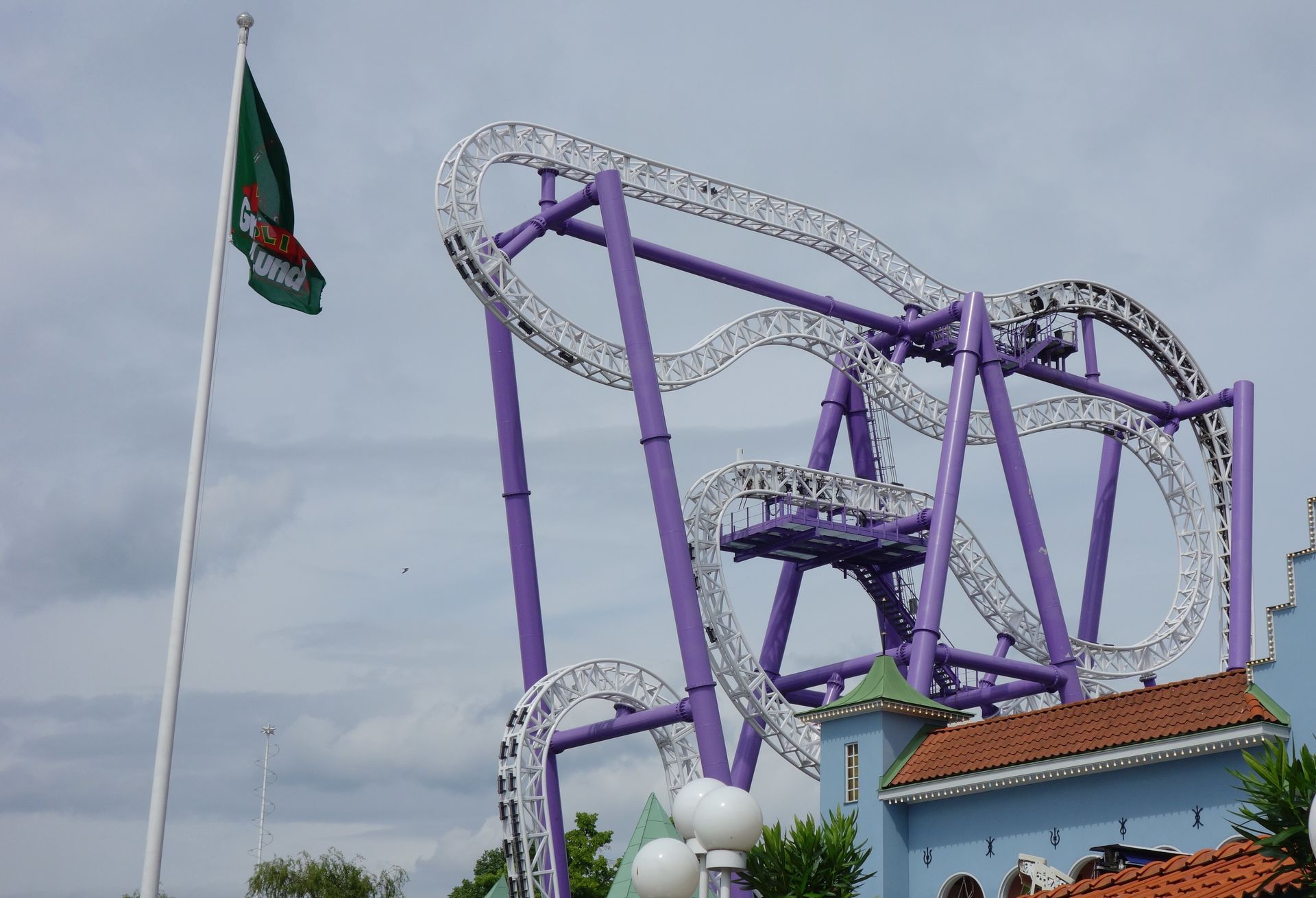 First Drop steiler und weiter hinabführen, inklusive eines Tunnels durch ein Restaurant. Auch die komplexe Stahlstruktur für ein künstliches Bergmassiv als Verkleidung für die Bahn wurde vom japanischen Original übernommen, weil die Bahn aber auch nackt ein voller Erfolg war, wurde dieses hier nie realisiert. Glücklicherweise, denn so hatte man genügend Tragkraft für die mittenrein geplante Vilda Musen übrig.