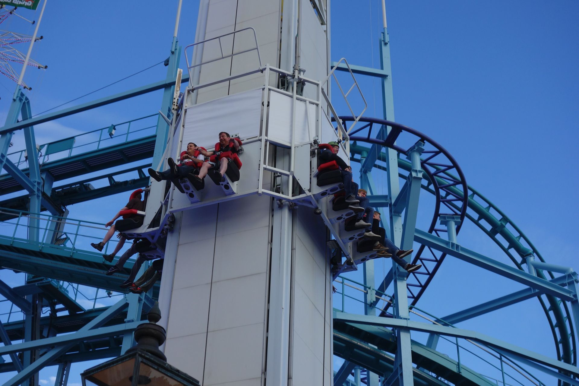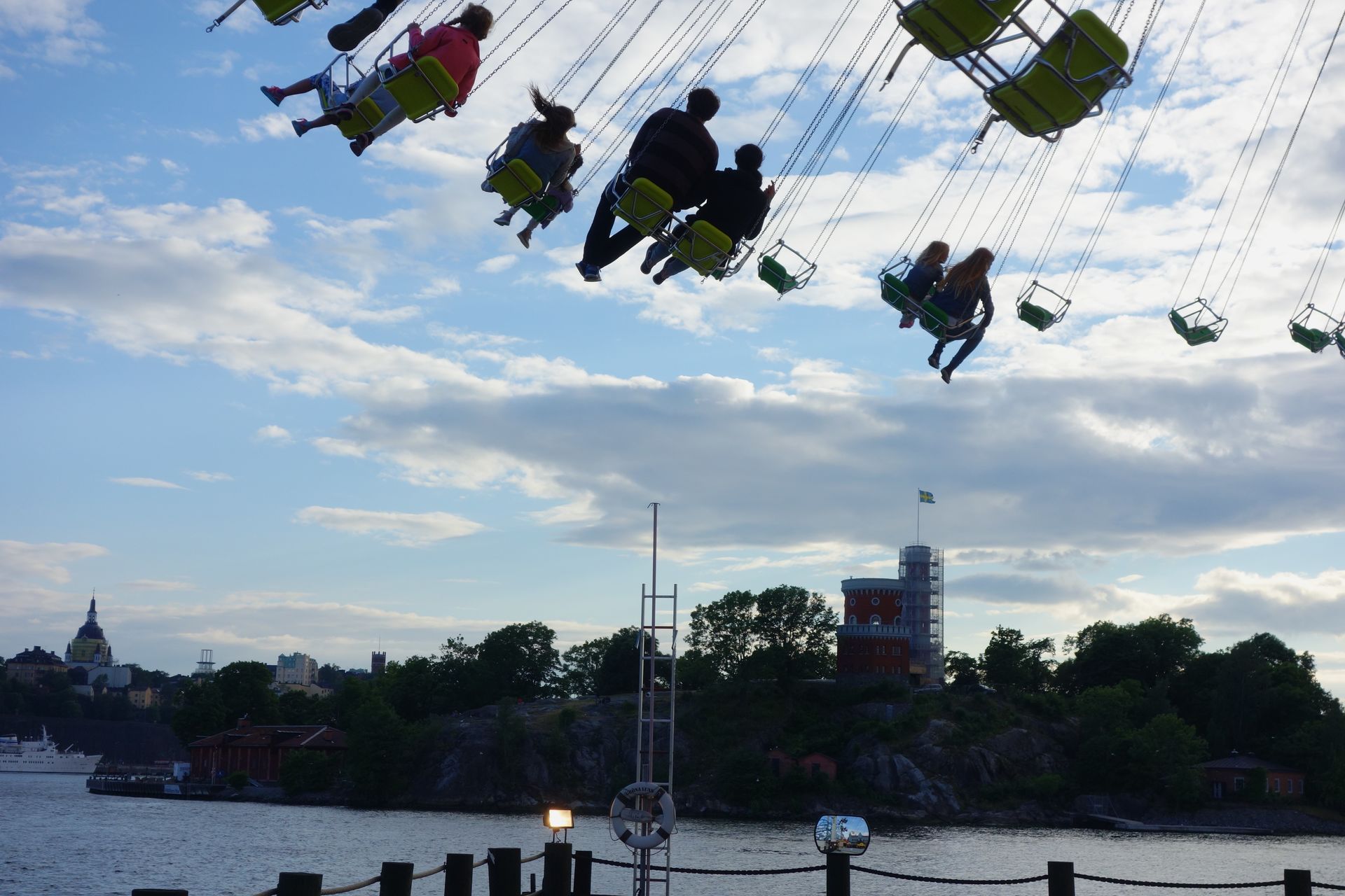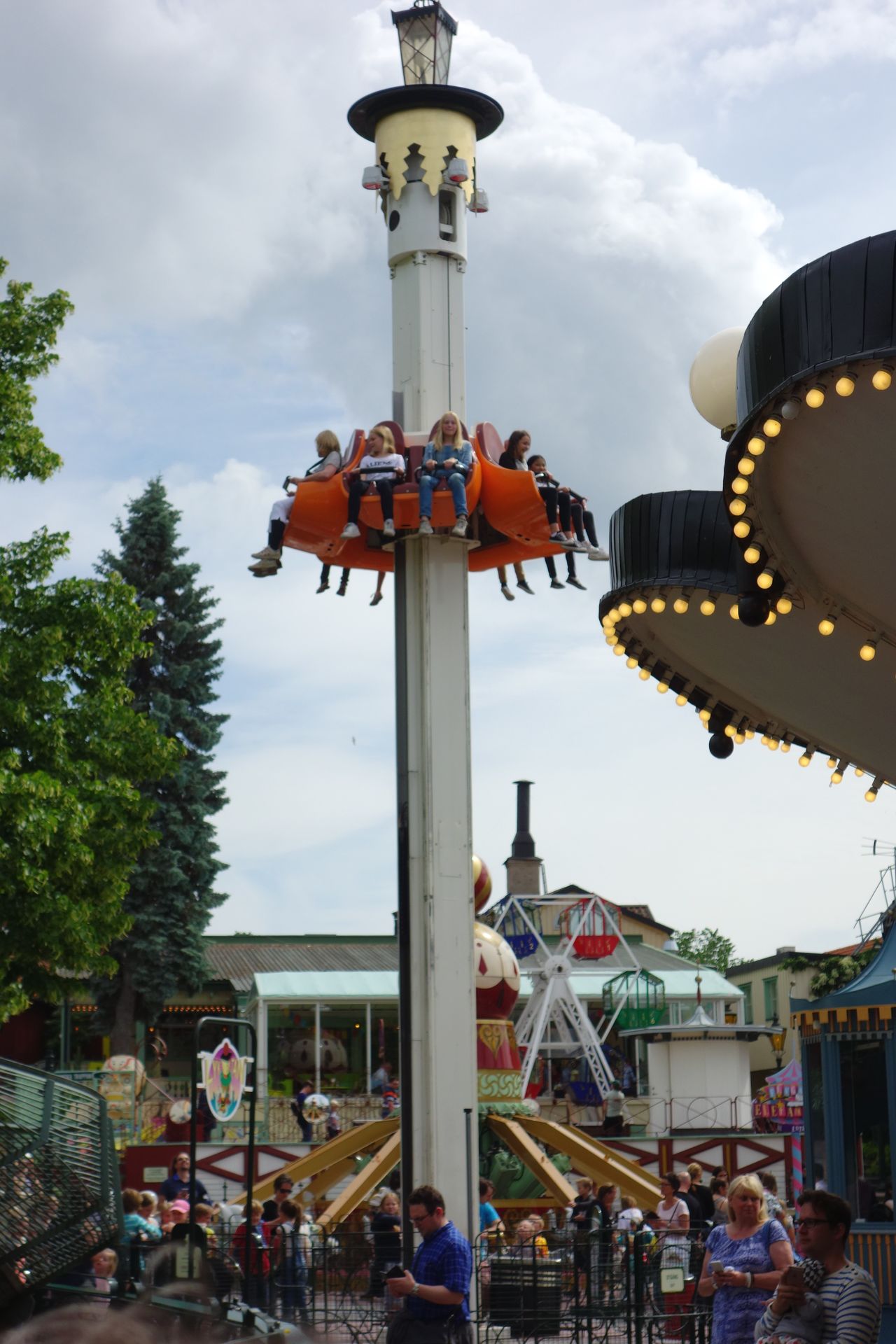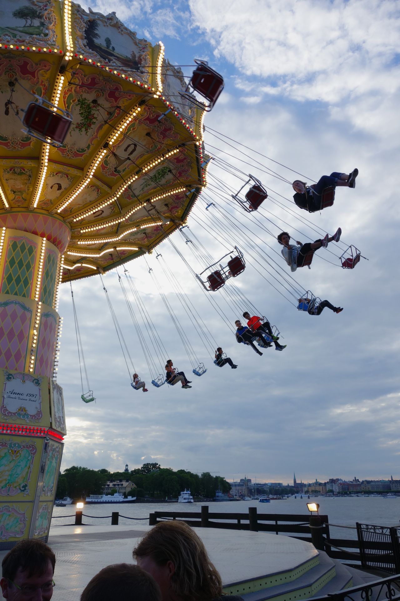 Dieser wurde 2013 eröffnet und löste mit einer Höhe von 121 Metern den drei Jahre zuvor eröffneten Praterturm als höchstes Kettenkarussell der Welt ab. Allerdings hielt der Titel nur etwa einen Monat, bis im Six Flags Over Texas der minimal höhere Texas SkyScreamer eröffnete. Aber Rekord hin oder her, was zählt ist die Fahrt. Und die ist hier einfach atemberaubend. Es gibt schließlich kaum eine freiere Möglichkeit, Stockholm aus dieser Höhe zu bewundern. Also wenn man überhaupt zum Bewundern kommt. Weder Nicolas noch ich sind große Höhenfreunde und so waren wir doch eher damit beschäftigt, uns bei den doch recht starken Windböen an den dünnen Ketten festzuklammern. Dass man einfach so auf den quasi direkt benachbarten Freifallturm herunterschauen(!) kann, hilft bei Höhenangst übrigens auch nicht wirklich. Aber auslassen sollte man den Höhenflug dennoch nicht - das hatte mich in Kopenhagen schon geärgert.