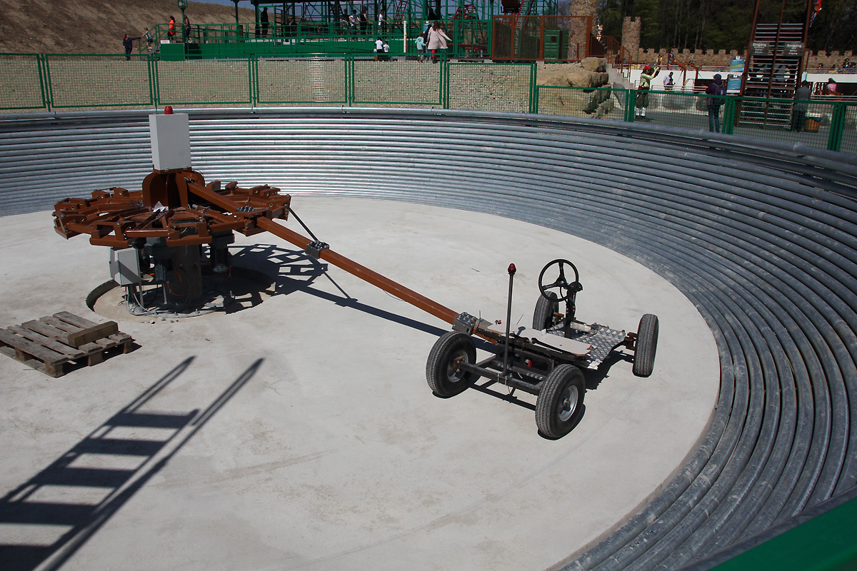 Die Treppe führt ins Zentrum der Anlage, von der dortigen Plattform wird dann der Zustieg erfolgen. Die Höchstgeschwindigkeit (bei maximalem Radius) beträgt 29,8 km/h.