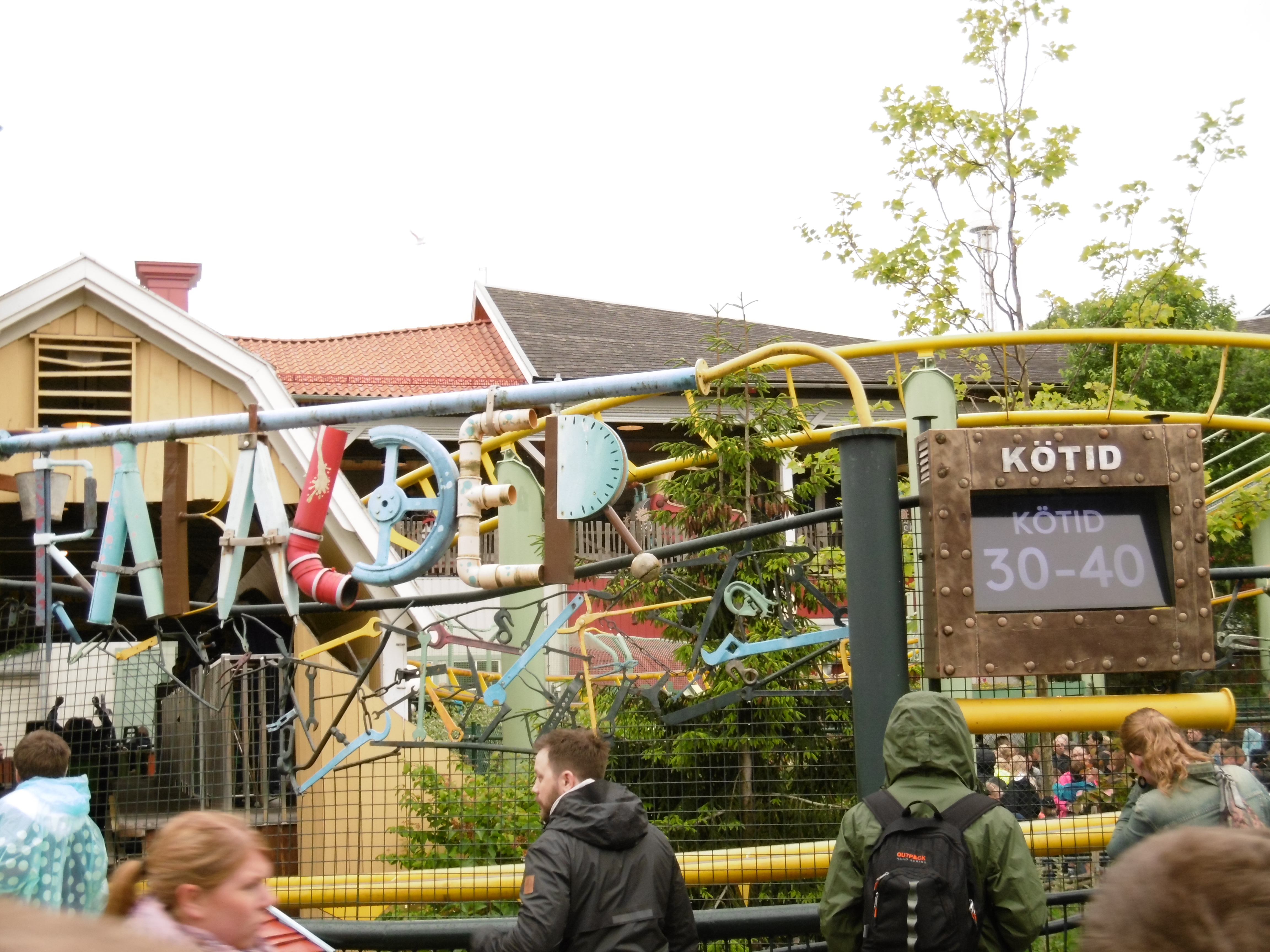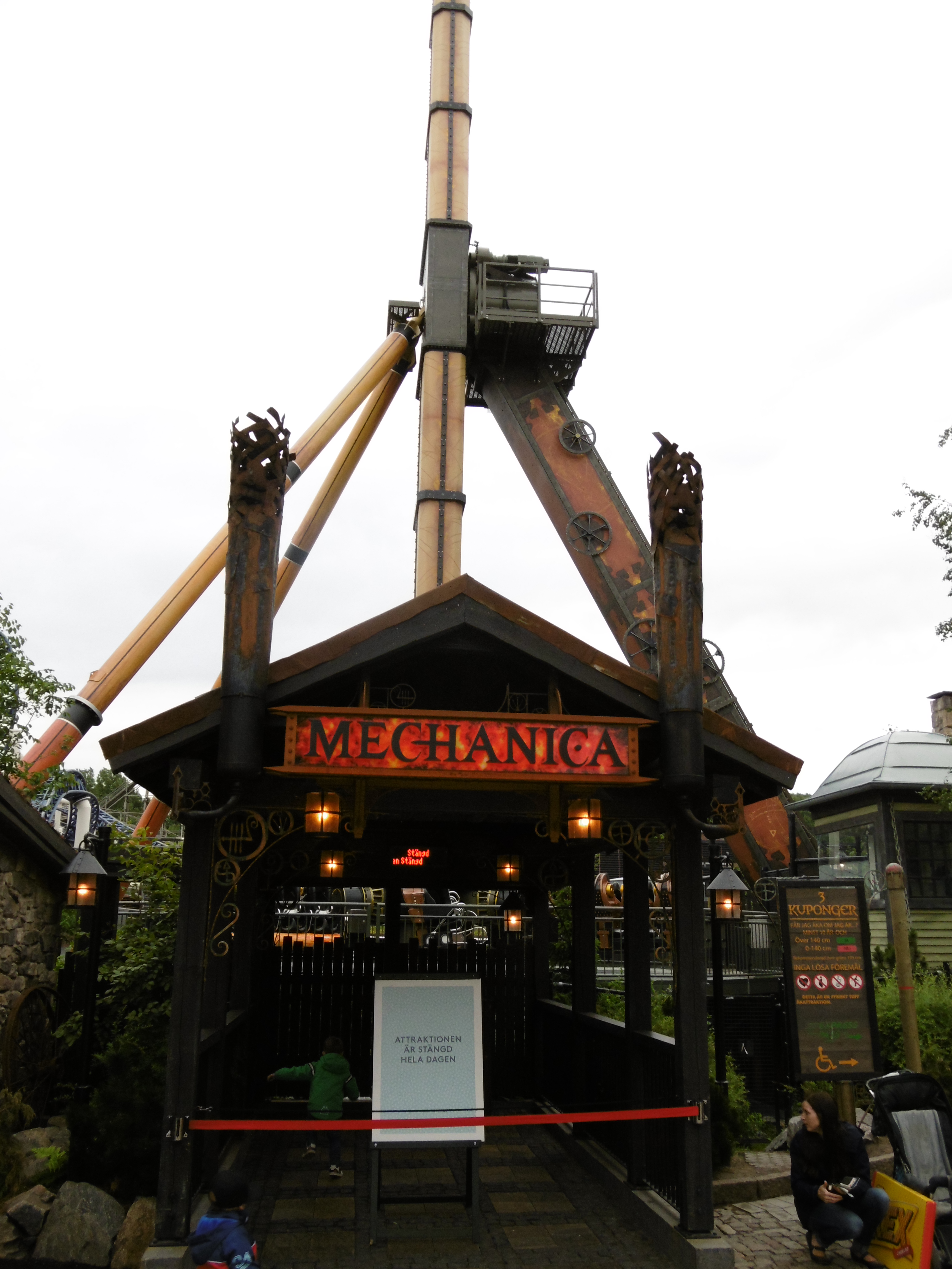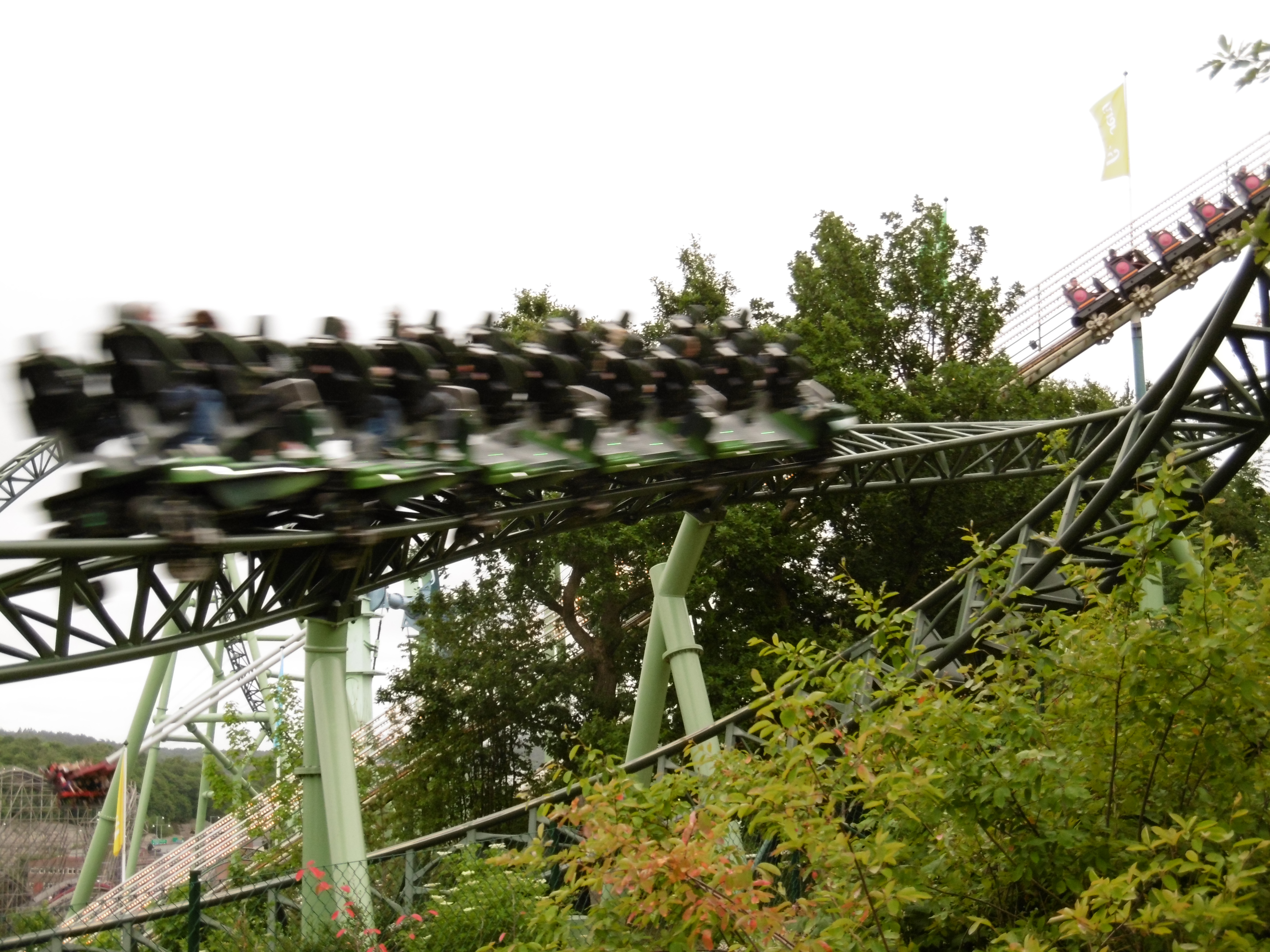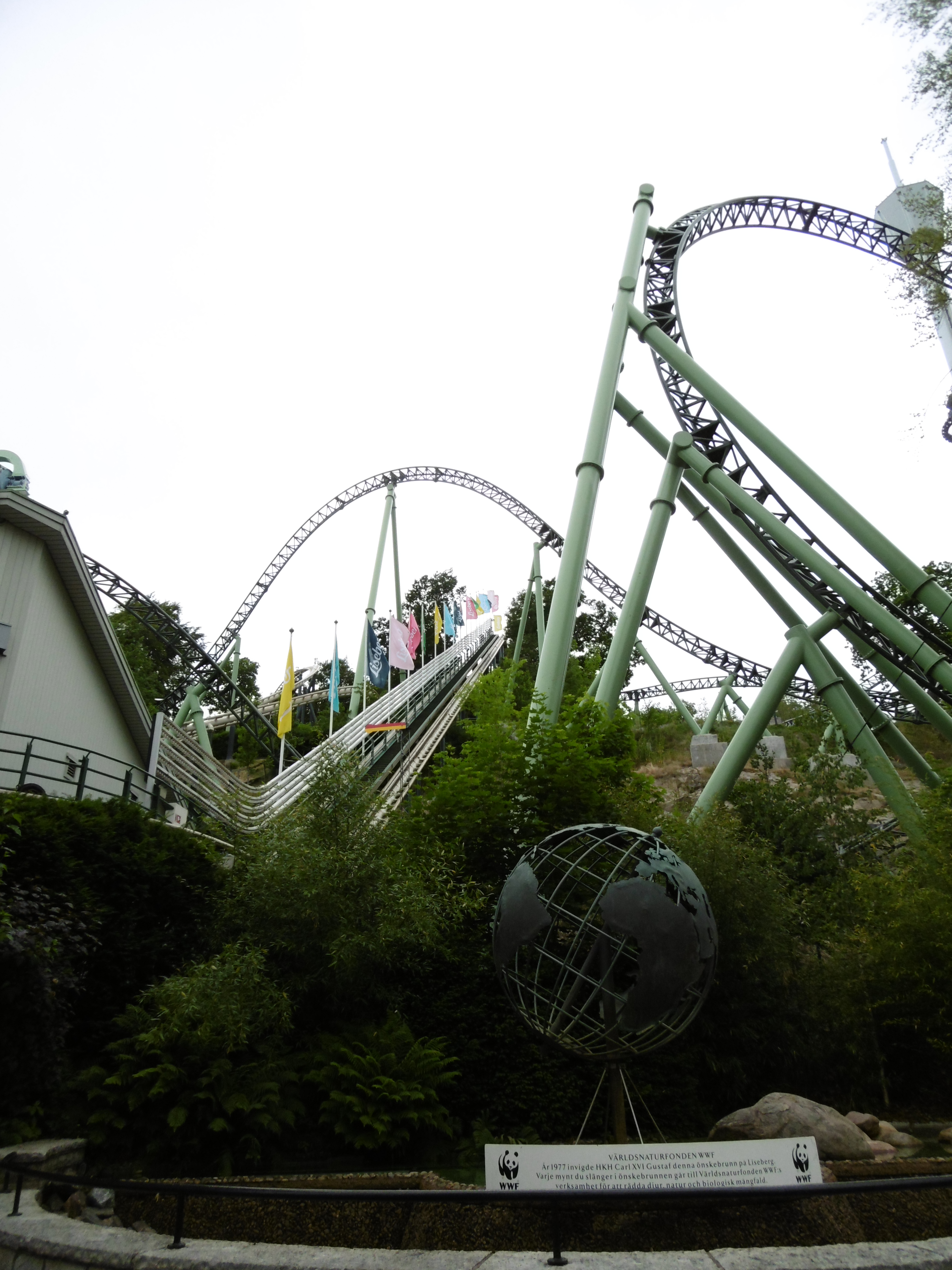 Nun war es 18 Uhr und eine Fahrt auf der schwedischen grünen Hölle stand an. Auch wenn wir noch eine ERT am Abend hatten, wollten wir kein Risiko eingehen, nicht dass die Bahn einen technischen Defekt hat und wir auf eine Fahrt damit verzichten müssen. Die nächsten Minuten lassen sich näherungsweise mit einer f(x) = –sin(x) Funktion beschreiben. Auf dem Weg nach oben fiel mir auf der Rolltreppe auf, dass mir jemand meine Kamera-Tasche gestohlen hat. Zum Glück habe ich meine Wertsachen immer an mir in verschlossenen Taschen und habe meine Kamera in der Hand gehalten. Trotzdem ging meine nach der Uppswinget überragende Laune rasant nach unten. Nachdem wir vor dem Eingangsschild von