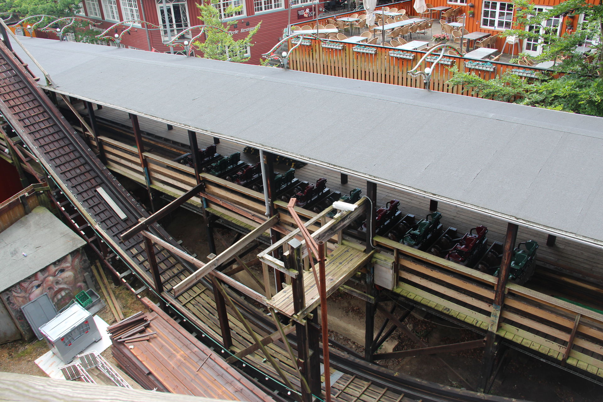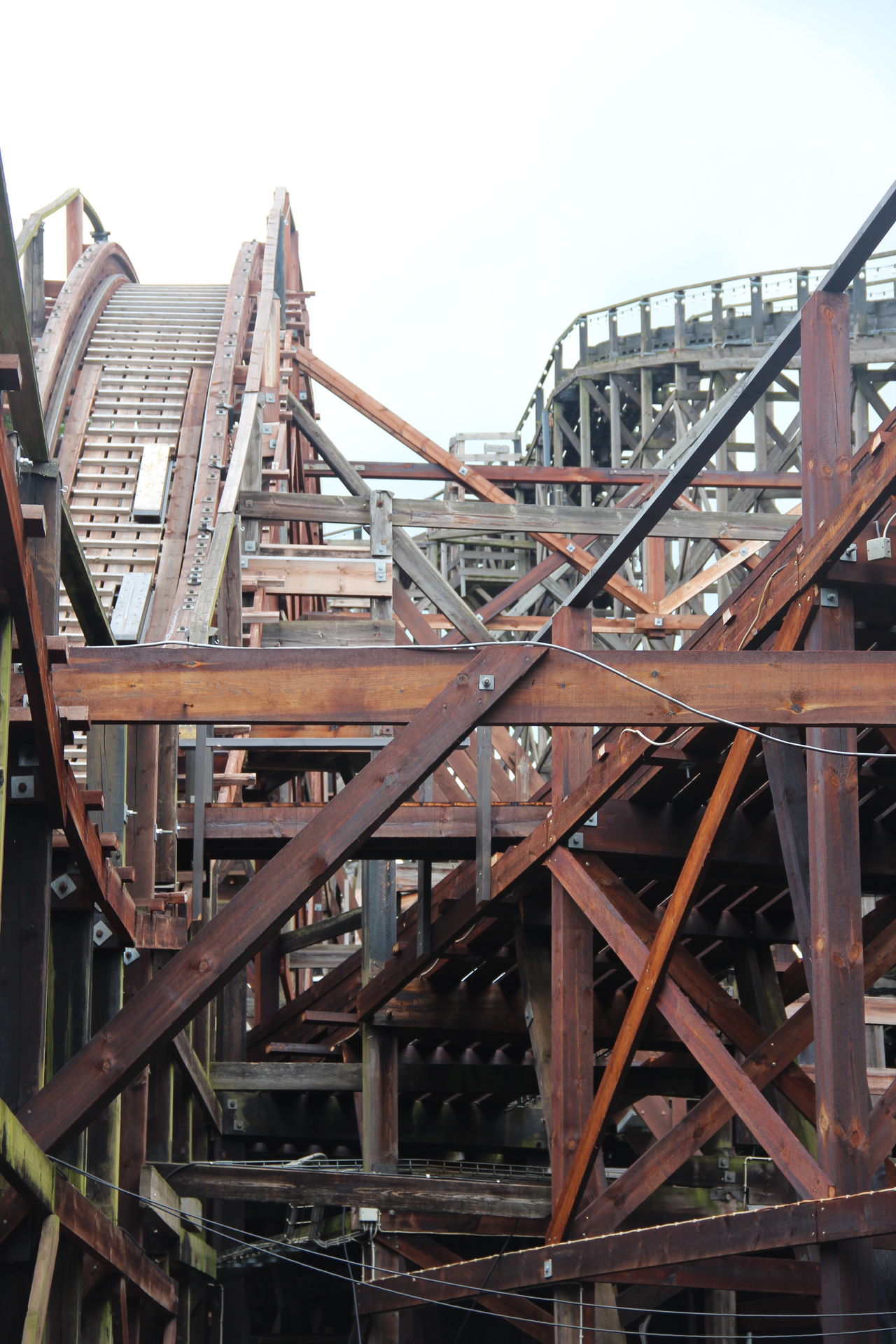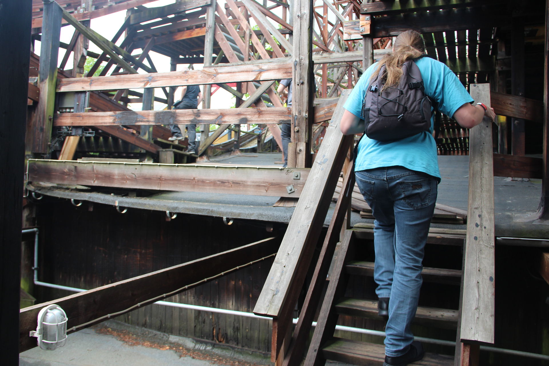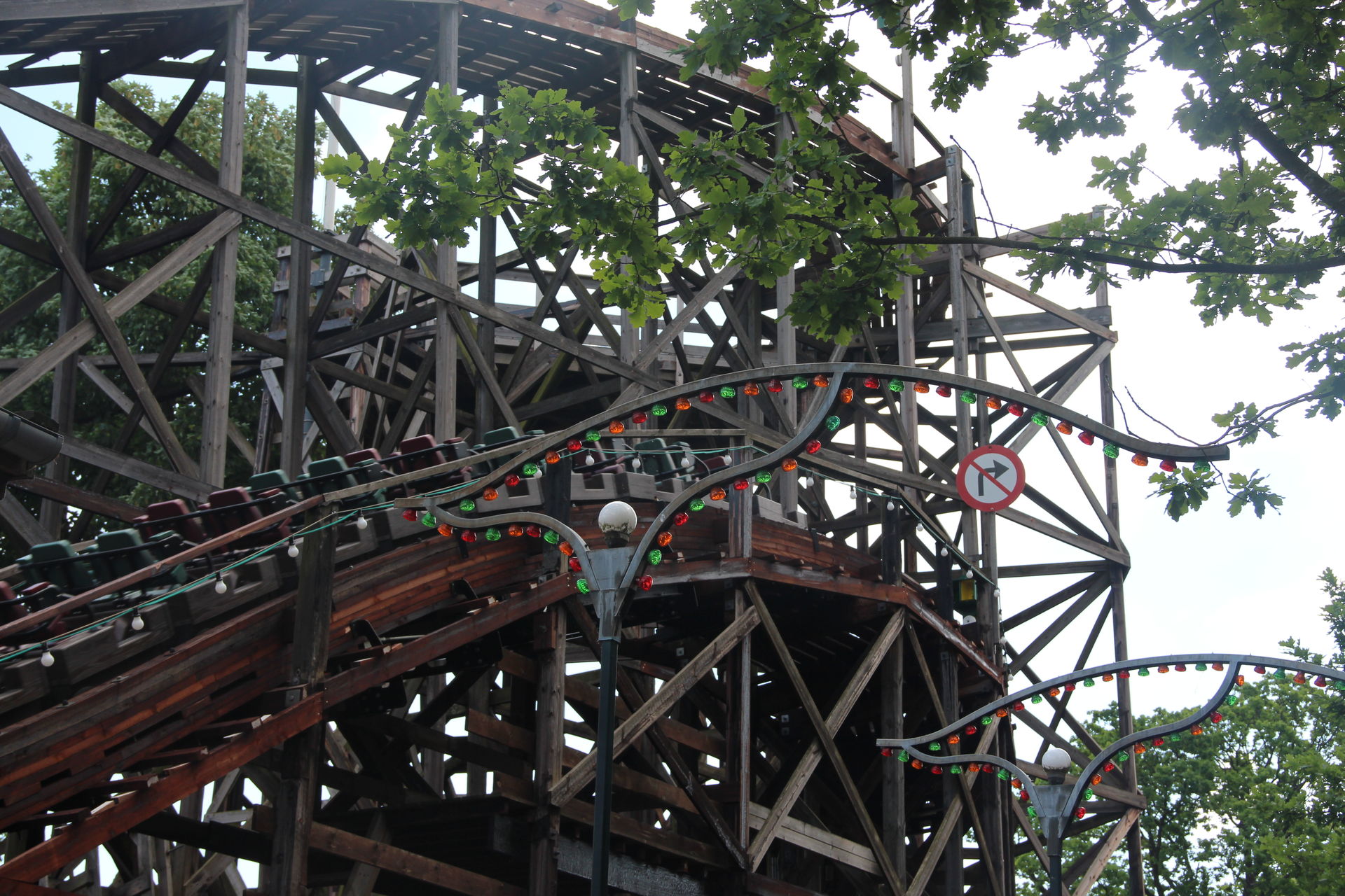 Auch ein Blick nach oben lohnt sich, schießlich steht man nicht oft im Innenhof einer so alten Holzachterbahn.