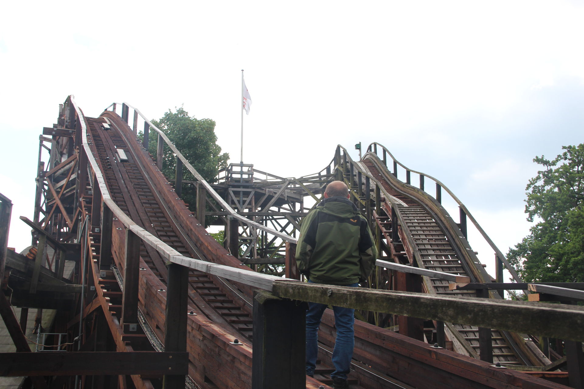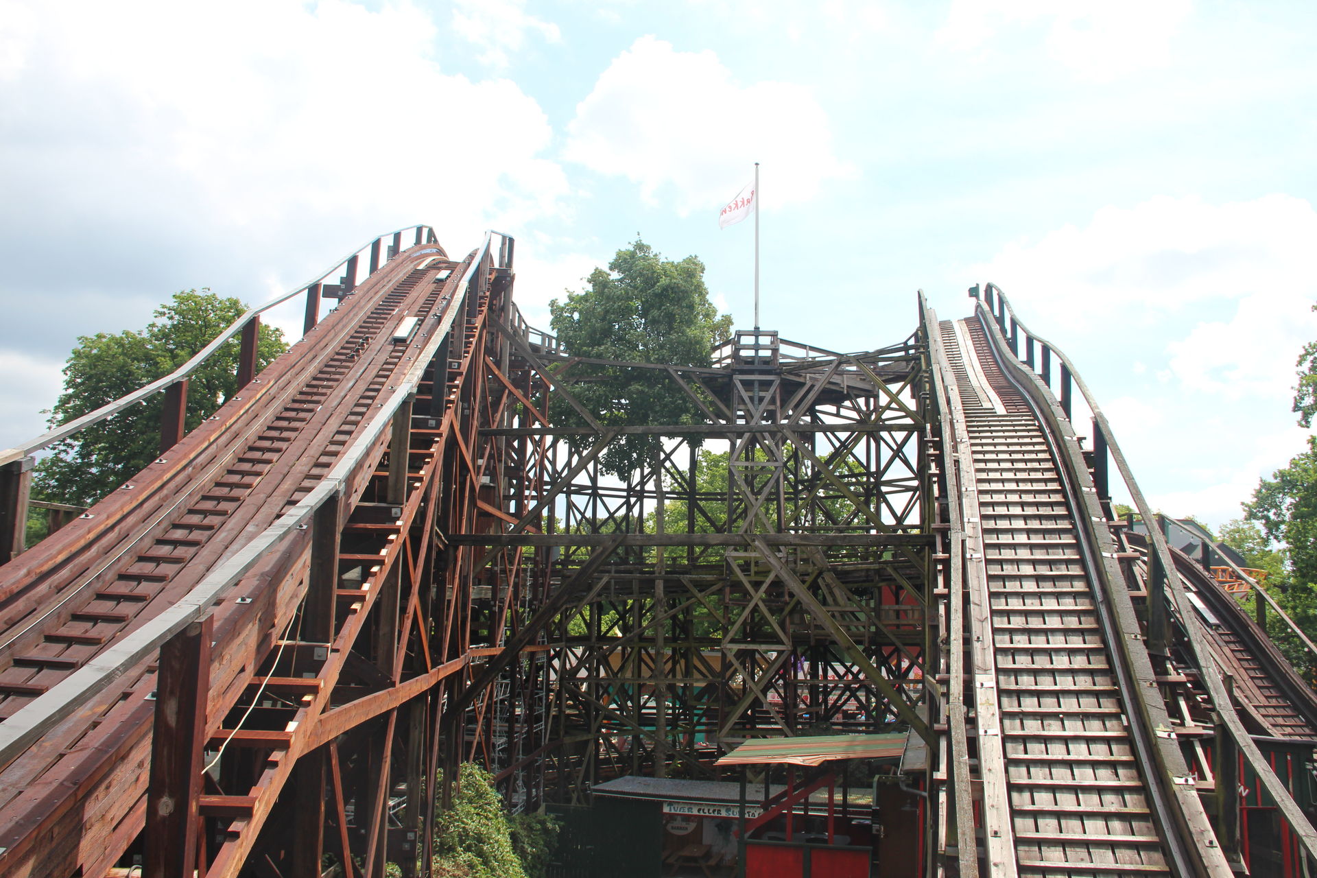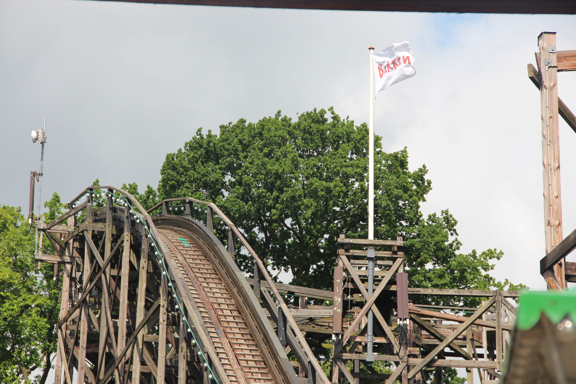 Auch ein Blick nach oben lohnt sich, schießlich steht man nicht oft im Innenhof einer so alten Holzachterbahn.