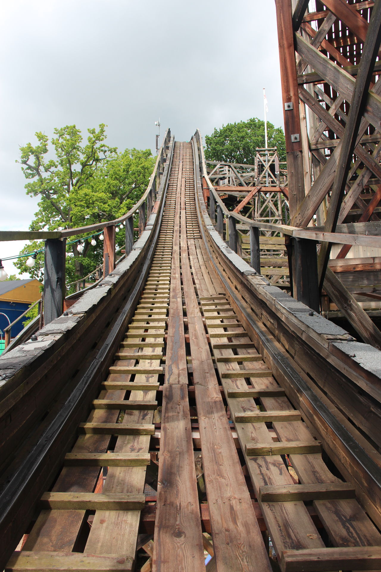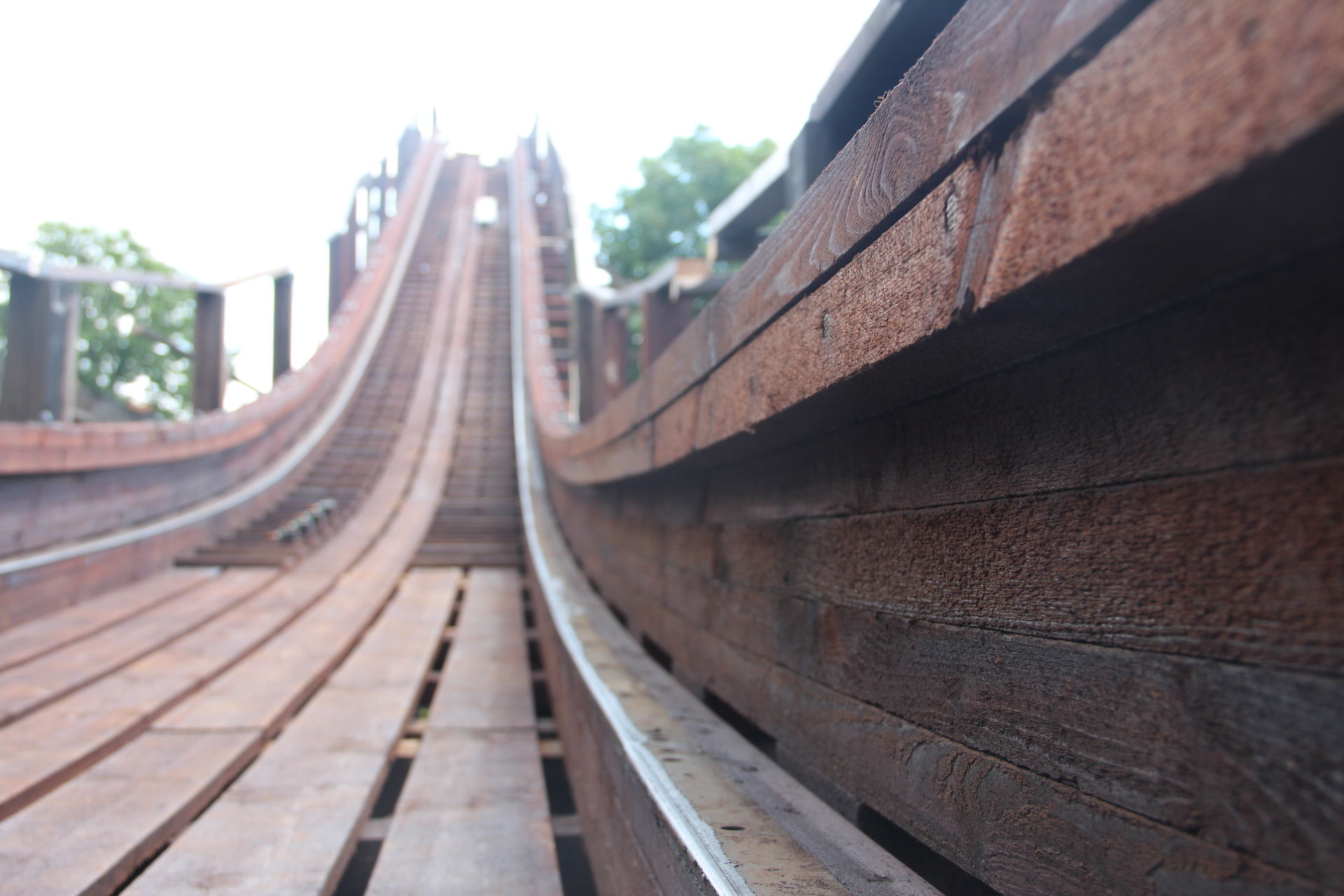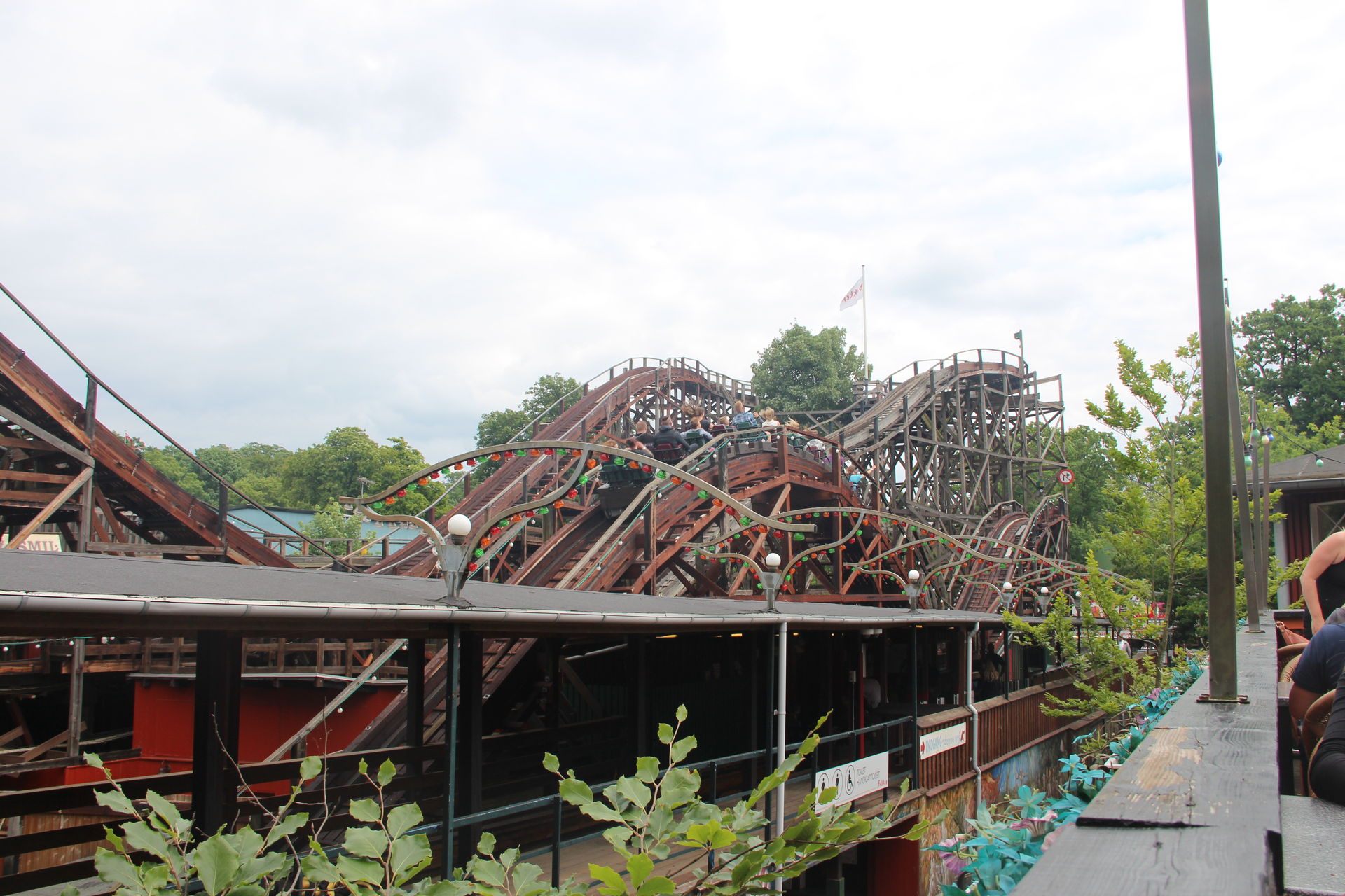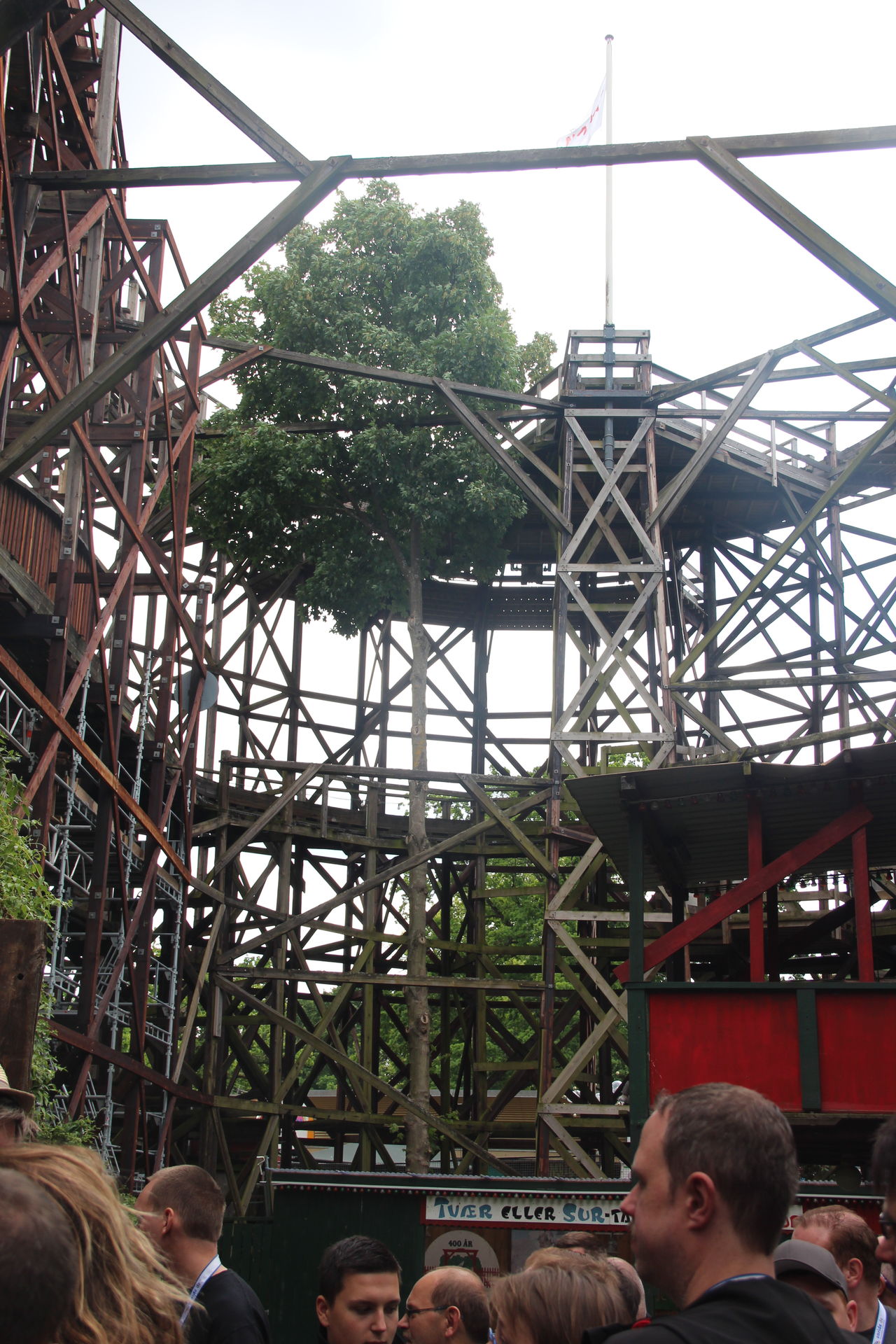 Auch ein Blick nach oben lohnt sich, schießlich steht man nicht oft im Innenhof einer so alten Holzachterbahn.
