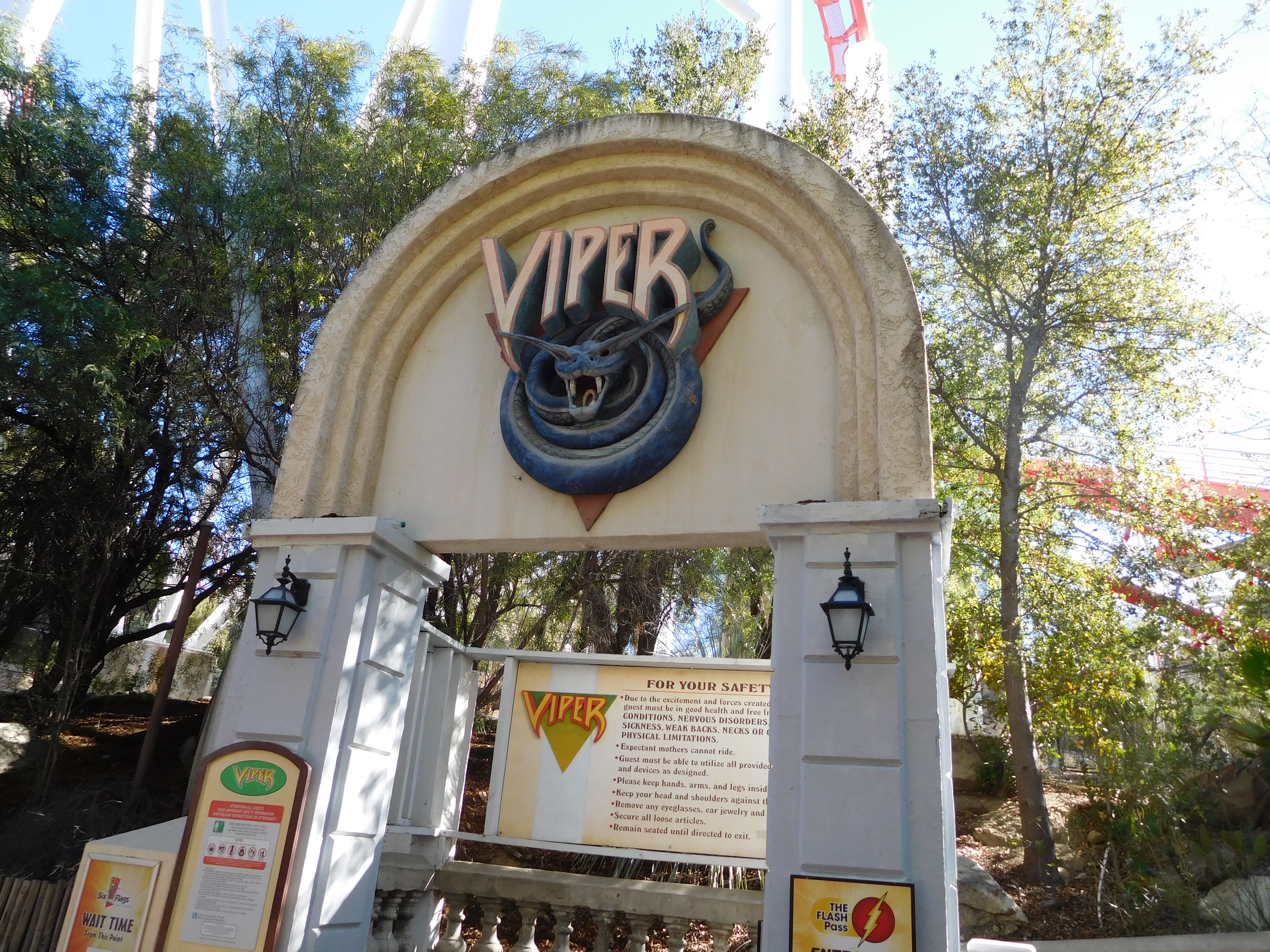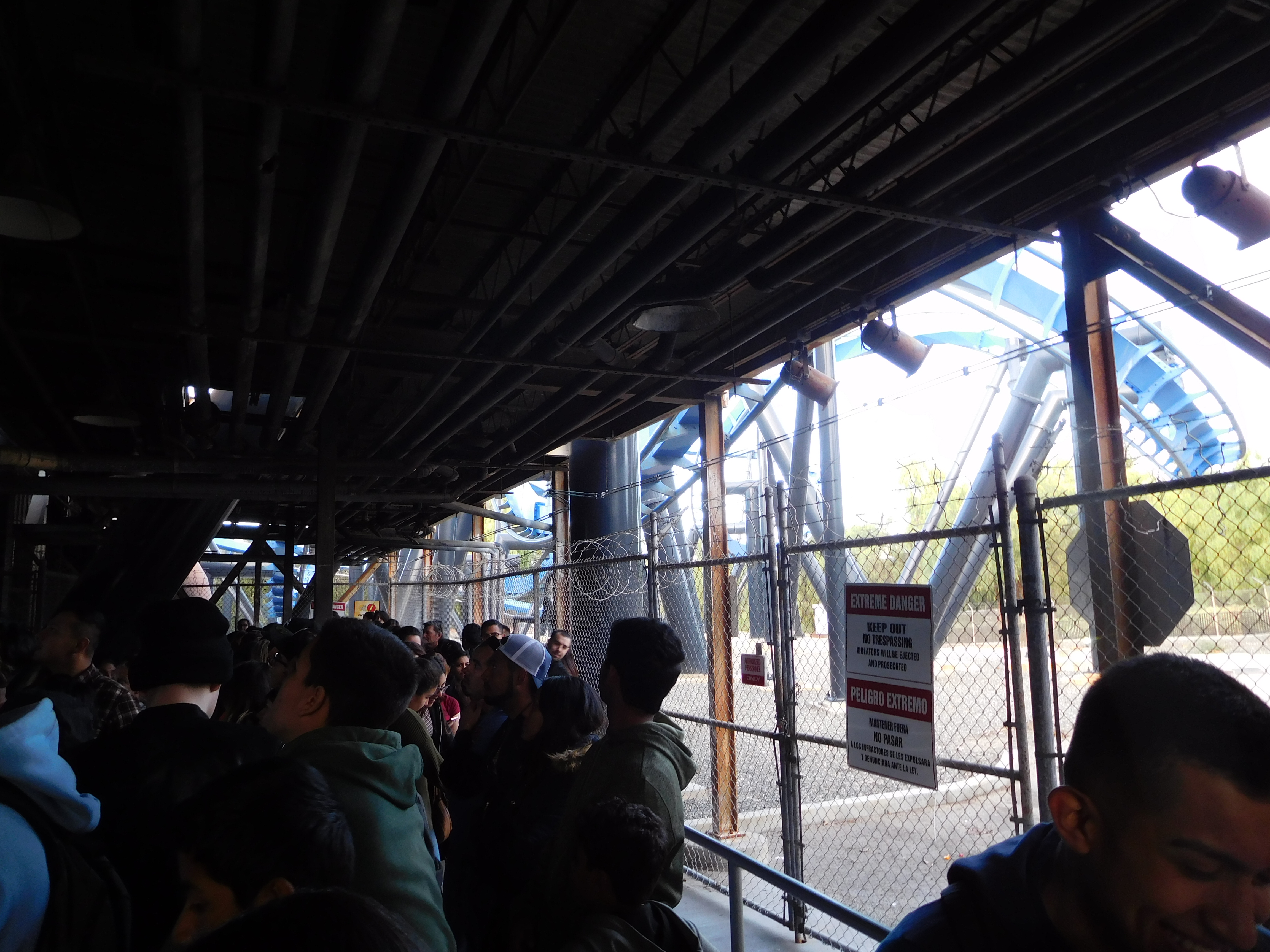 Vor mir war eine Frau mit ihren Kindern, die mir erzählte, dass sie den Tag zuvor auch schon im SF Magic Mountain war. Auf meine Frage, wie voll es war meinte sie, dass an den meisten Großattraktionen eine Stunde zu warten war und Twisted Colossus die Vollste mit anderthalb Stunden war. Attraktionen wie Viper hätten aber nur eine Viertelstunde Wartezeit gehabt. Naja, mal schauen, wir hofften natürlich, dass es trotz des erneut guten Wetters etwas leerer sein würde.