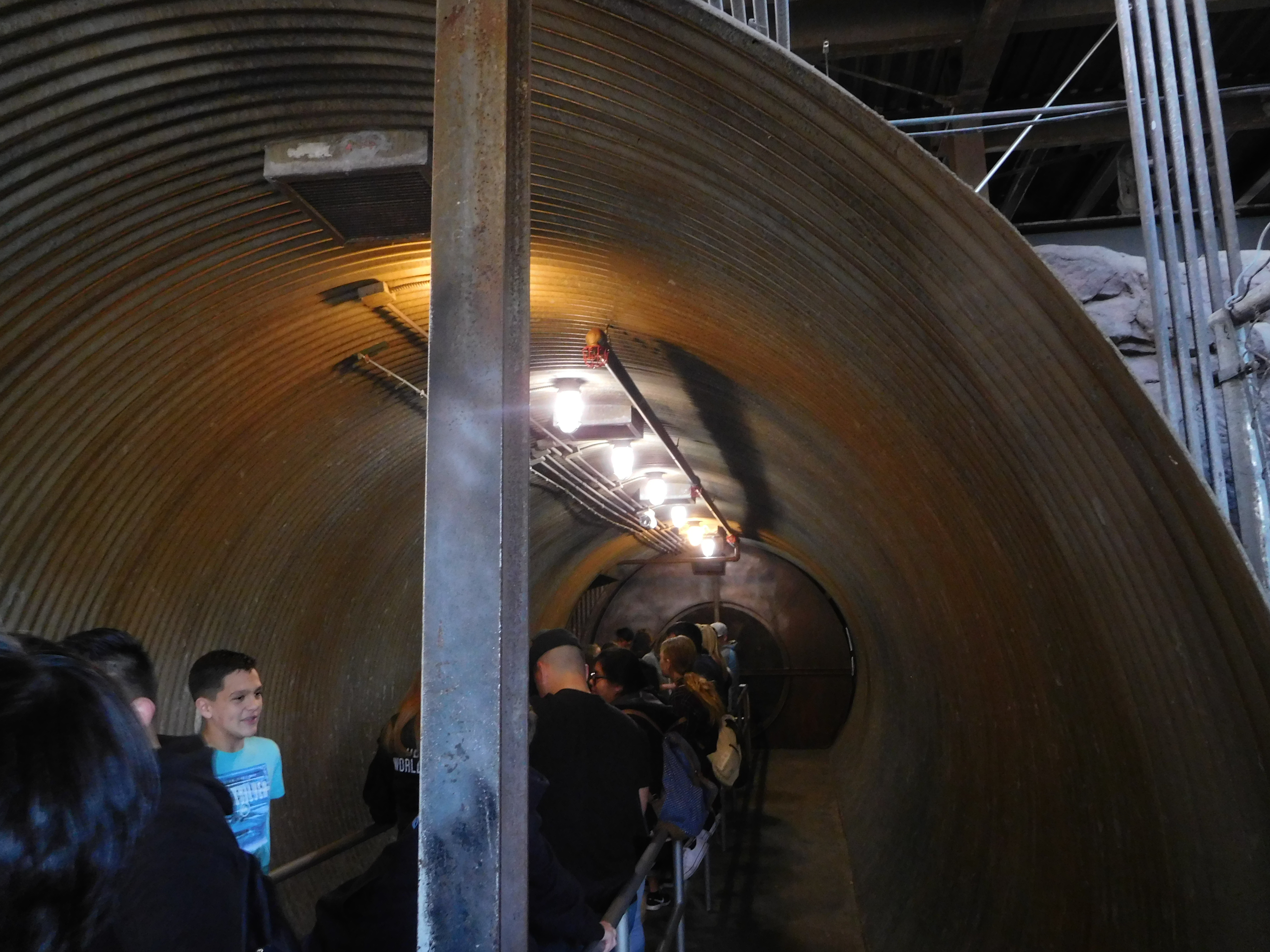 Dann gibt es noch einen Innenbereich der Warteschlange, den man sogar als recht ordentlich thematisiert beschreiben kann. Ein kleines bisschen kann die Atmosphäre einer Apokalypse erzeugt werden.