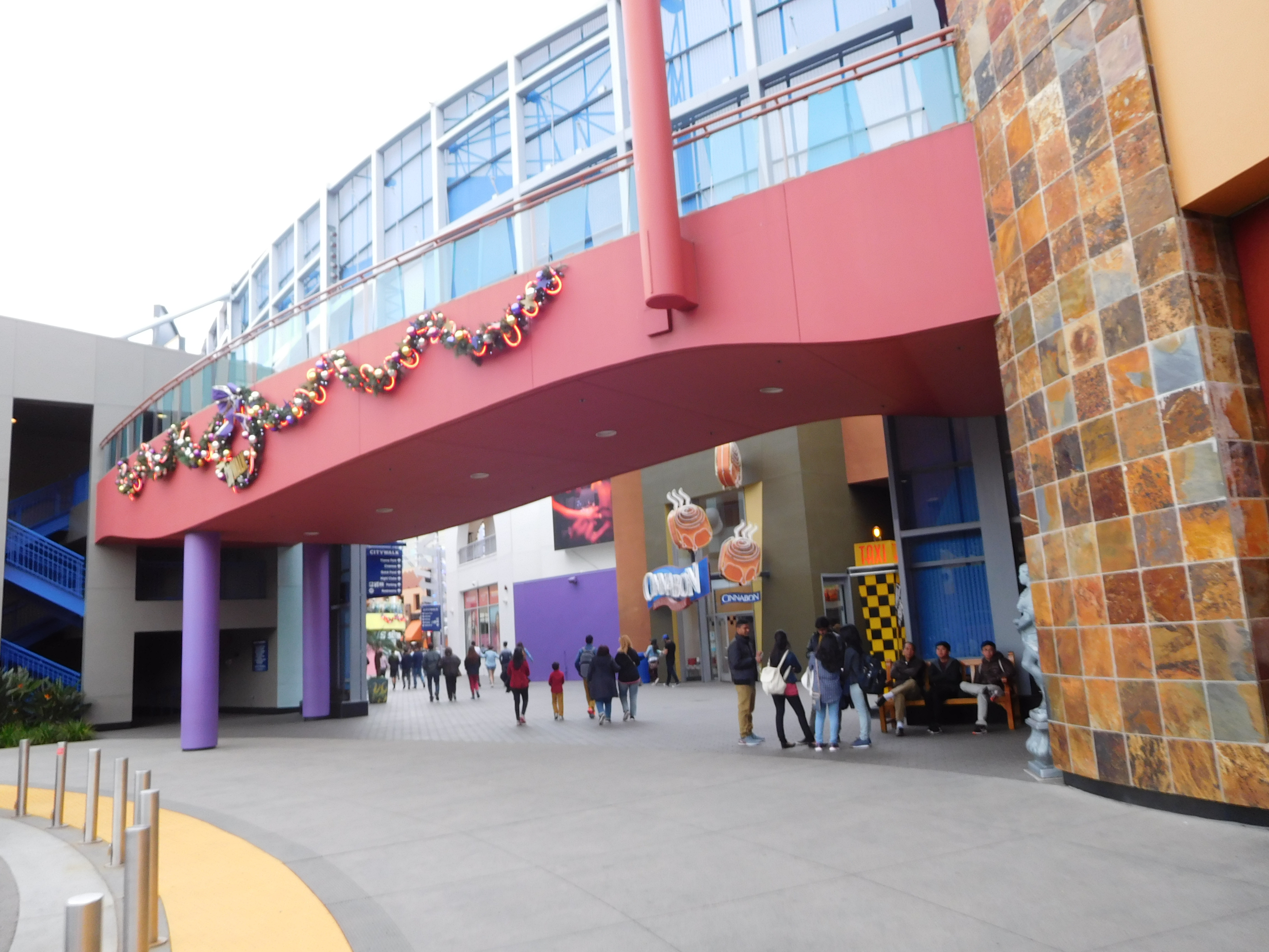 So extrem weit war es dann auch gar nicht. In der Nähe unseres Parkplatzes gab es einen Fahrstuhl, in dem man dann auch die passende Ebene für Universal wählen konnte. Ein bisschen Fußmarsch war es dann noch zum Park, doch so kam man noch durch eine ganz nette Fußgängerzone.
