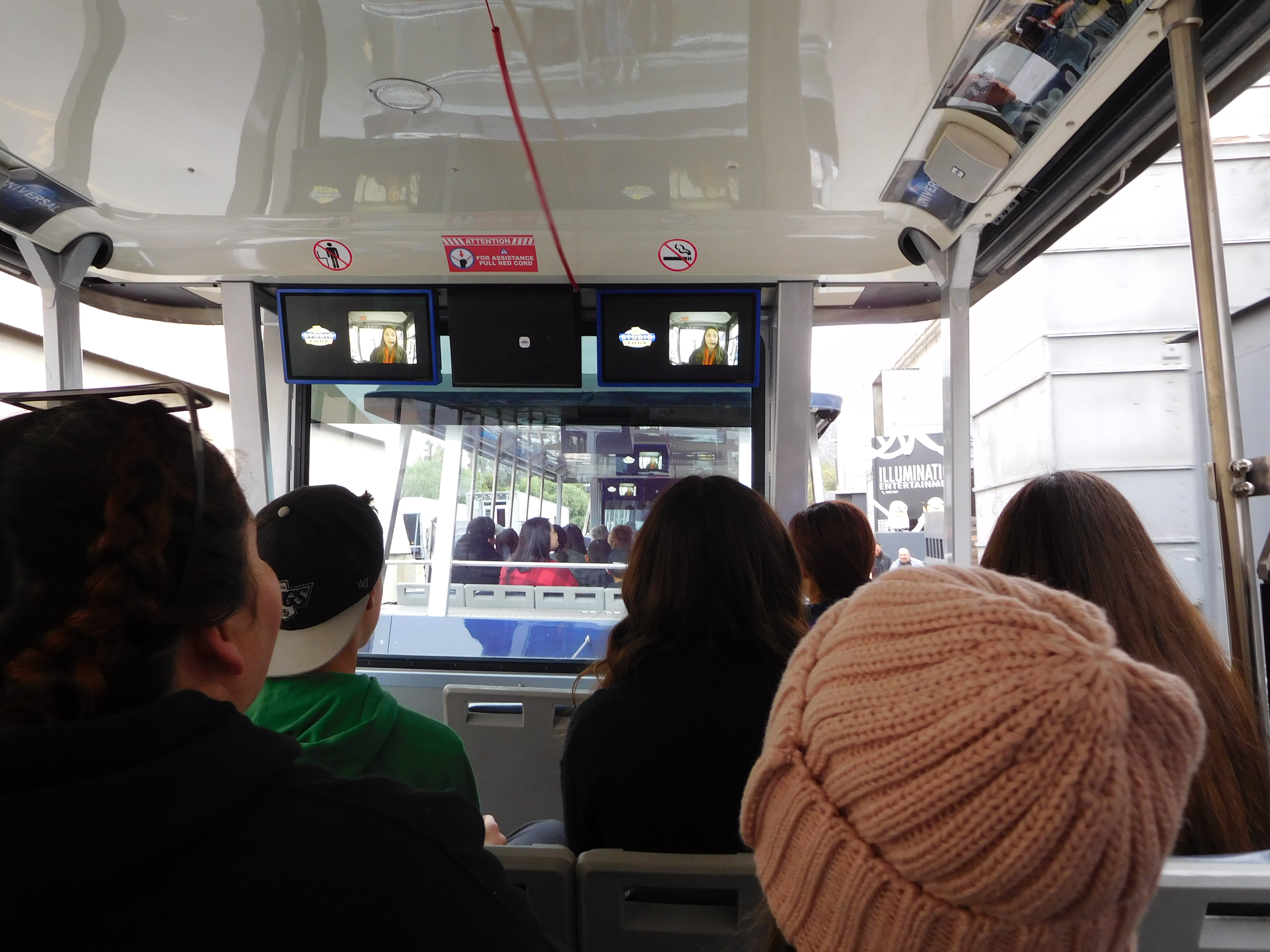 Sind alle Türen geschlossen, geht es los. Auf zwei Monitoren sahen wir unsere weibliche "Reiseleitung", die im vordersten Wagen saß. Sie erklärte immer etwas zu den Kulissen, an denen man vorbeifährt und mehrmals werden auch Ausschnitte aus den dazugehörigen Filmen gezeigt.