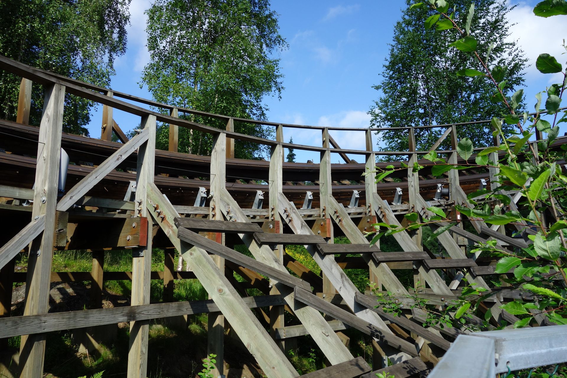 Aus dem Stützwerk des Airtimehügels auftauchend biegt man in einer Steilkurve nach rechts ab.