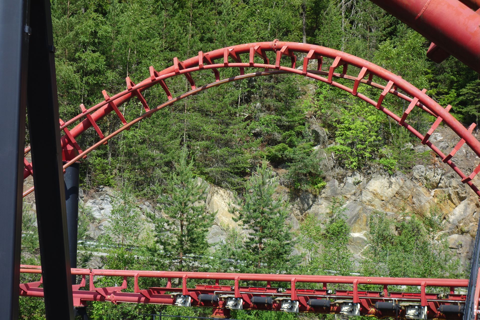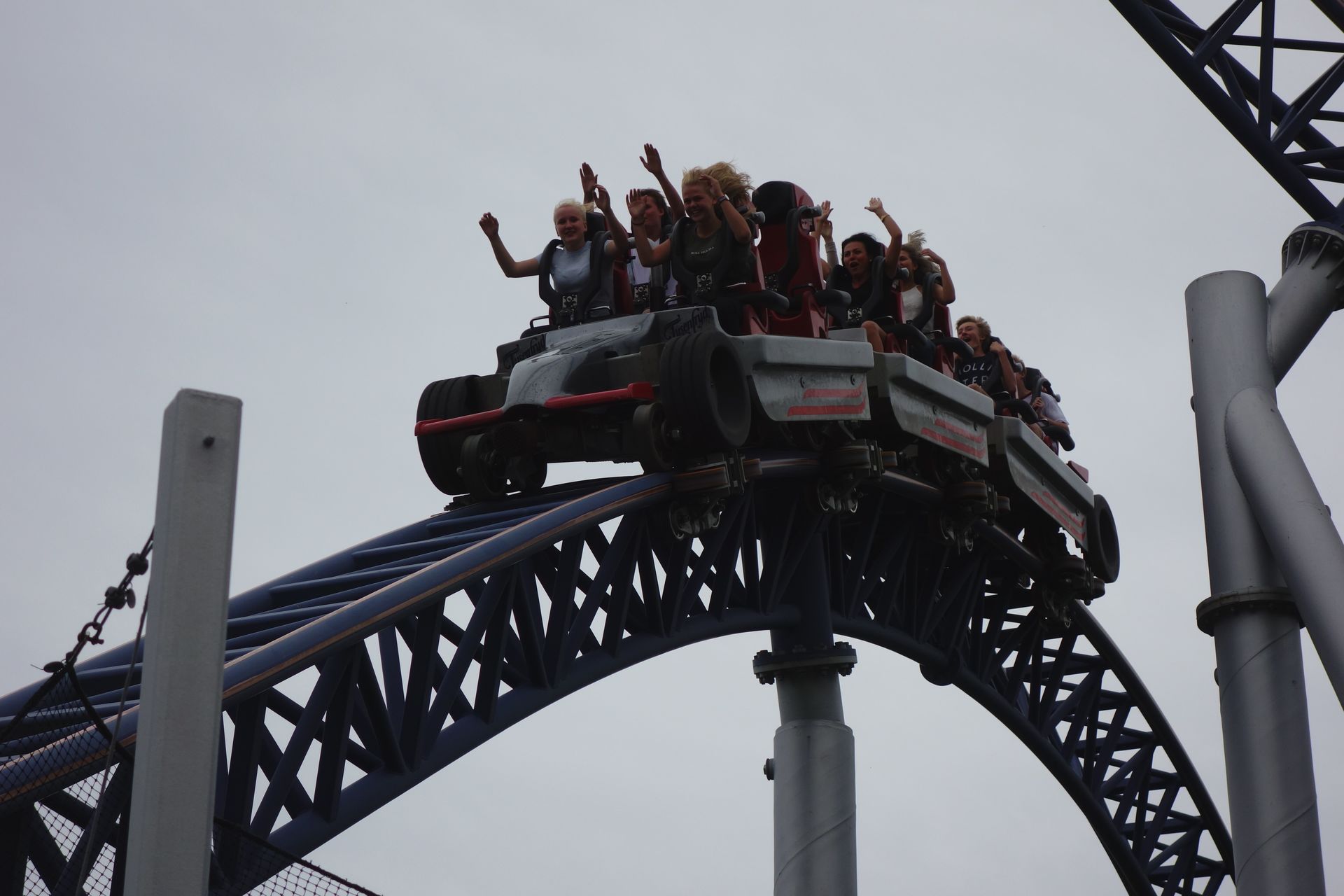 Ob man bei einer Höchstgeschwindigkeit von 90 km/h wirklich von Speed sprechen kann, weiß ich nicht. Aber ein Monster ist diese Bahn nun wirklich nicht. Sie fährt sich zwar butterweich und gleitet unglaublich sanft durch das Layout, aber auch die auftretenden Kräfte sind entsprechend eher gering. Der Launch ist für einen Hydraulikabschuss fast schon unverschämt lasch, der Airtimehügel sorgt lediglich für einen leichten Schwebezustand und die Umschwünge sind so sanft, dass selbst die harten Schulterbügel nicht stören. Einzig der Norwegian