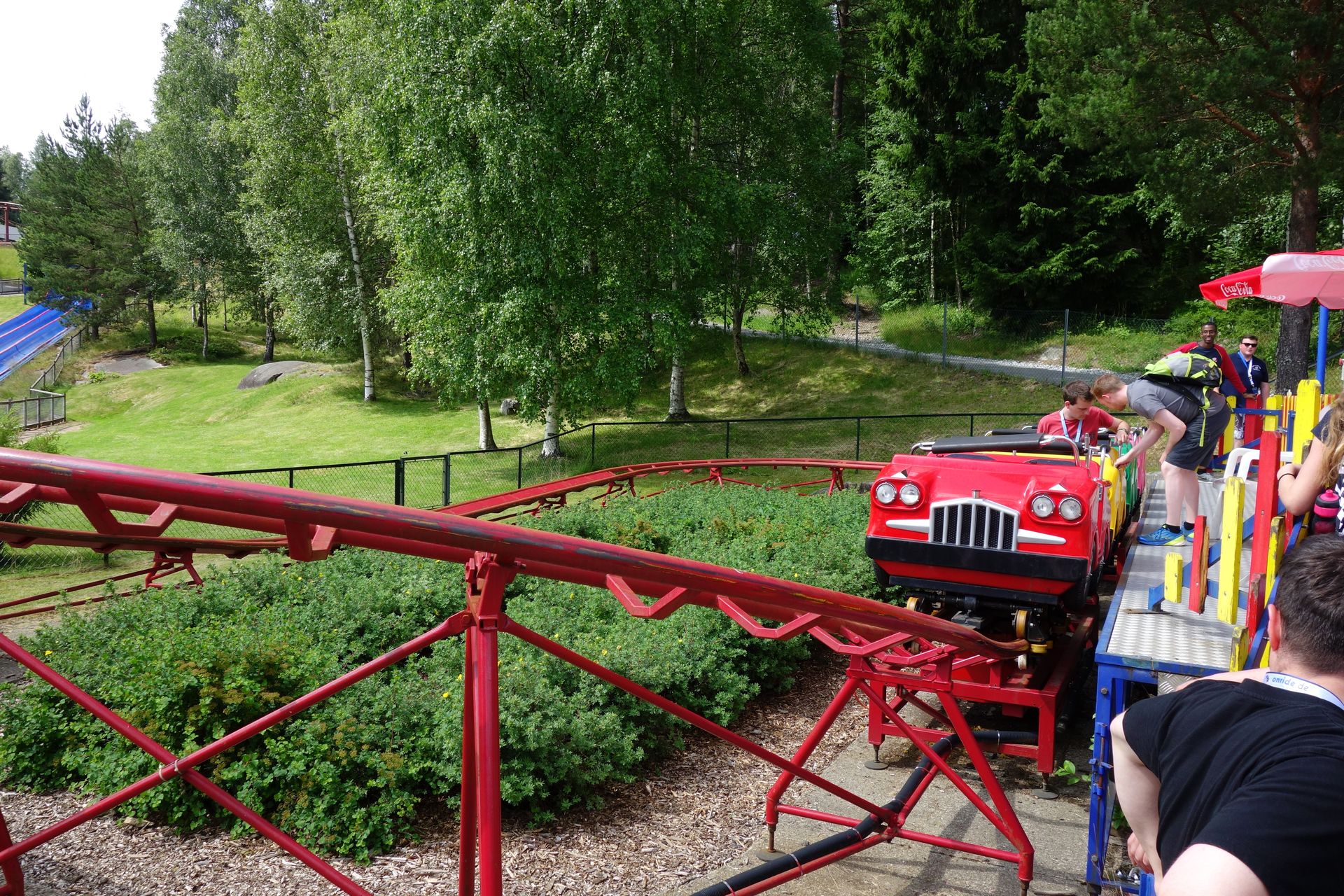 Obwohl es sich auch hier um ein Standardmodell handelt, gibt es eine kleine Besonderheit. Die meisten dieser Bahnen besitzen nur einen Zug und fahren oftmals auch gleich zwei Runden am Stück. Diese Anlage besitzt aber tatsächlich einen zweiten Zug zur Kapazitätssteigerung, der sogar im Einsatz war - obwohl es zu unserem Besuchszeitpunkt gerademal eine Handvoll Mitfahrer gab.