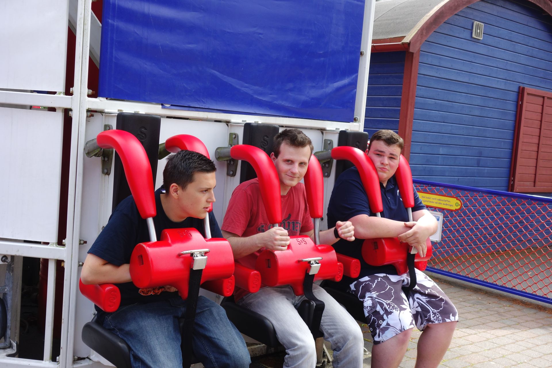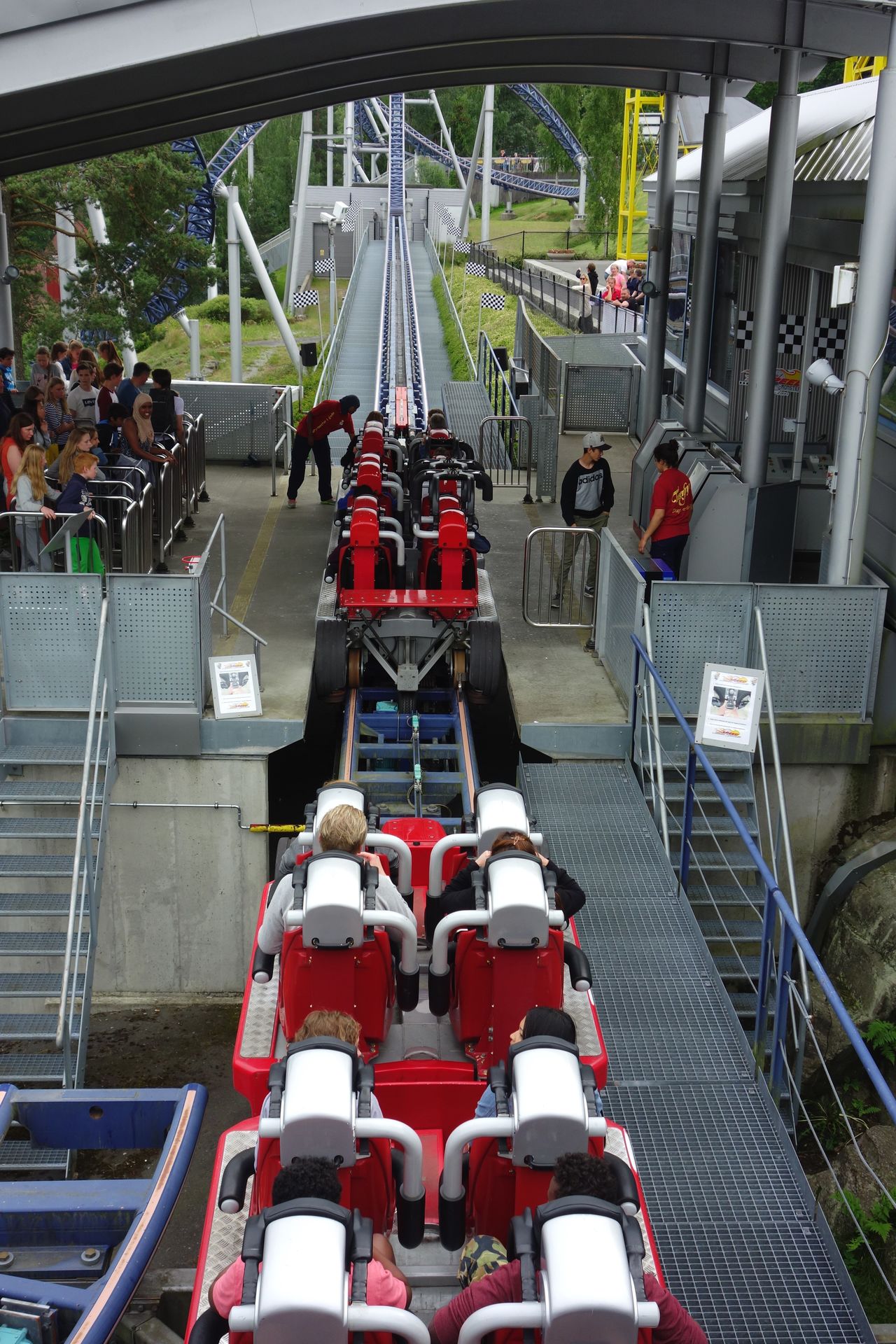 Auch hier war die Abfertigung der reinste Horror. Die Bügel mussten jeweils Wagen für Wagen per Fußhebel vom Operator entriegelt werden, was für sich ja schon eine gewisse Zeit in Anspruch nimmt. Und die Fahrgäste müssen ja auch noch die Station verlassen. Die Fahrgäste für die nächste Fahrt wurden teilweise aber erst danach in die Station eingelassen. Dann wurde etwas gewartet, bis sie sich an den Gates verteilt hatten, und ggf. nochmals nachgefüllt. Gates öffnen, einsteigen, Bügel kontrollieren. Alles mit einem Tempo, dass selbst der lasche Launch des Speed Monsters wieder richtig rasant wirkte...