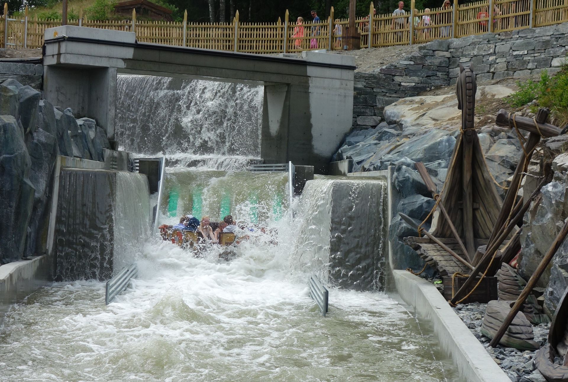 Bei so einer Wildwasserbahn mit Doppelladestation von Arrow kann man glücklicherweise nicht viel falsch machen, sodass die Wartezeit einigermaßen im Rahmen war. Und hier durfte Eike dann sogar die GoPro-Halterung nutzen. Wobei er damit letztlich auch nicht ganz zufrieden war, da diese doch ziemlich wackelte. So wahnsinnig spannend ist die Bahn aber auch nicht, man fährt den Berg hinauf, dort dümpelt man ein wenig durch den Wald und schließlich geht es mit der einzigen Abfahrt wieder zurück zur Station. Interessanterweise wurde ich während des Drops durch aufgewirbelte Wassertropfen nasser als beim eigentlichen Splash. Freude 13: Spray statt Splash.