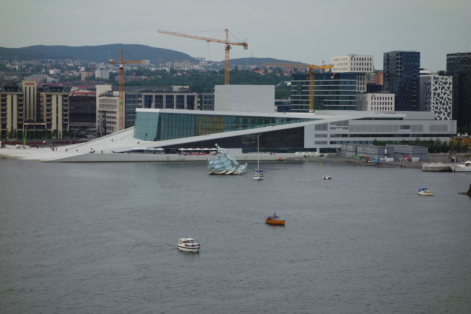 Ans Hafenbecken grenzt auch die 2008 eröffnete neue Oper. Die Skulptur davor wurde von Caspar David Friedrichs Eismeer inspiriert.