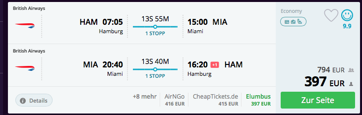 - Flüge über "Cheap Tickets" (gefunden auf Momondo) gebucht: Wir fliegen um 7:05 Uhr von Hamburg mit British Airways nach London Heathrow (BA963), haben da 2:55 Stunden Aufenthalt und fliegen dann mit Iberia (IB4635) weiter nach Miami, wo wir um 15:00 Uhr landen. Zurück ganz ähnlich: Am Freitag von Miami um 20:40 Uhr mit Iberia nach London Heathrow, dort etwas Aufenthalt und dann mit British Airways nach Hamburg, wo wir am Samstag um 16:20 Uhr landen. Pro Person kostet das 400 Euro.