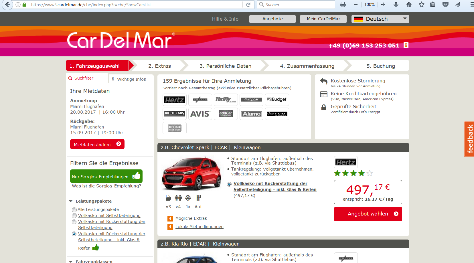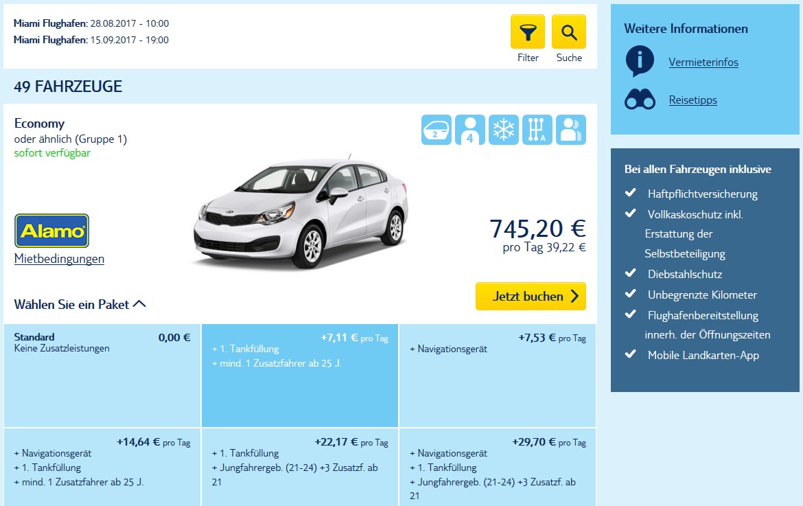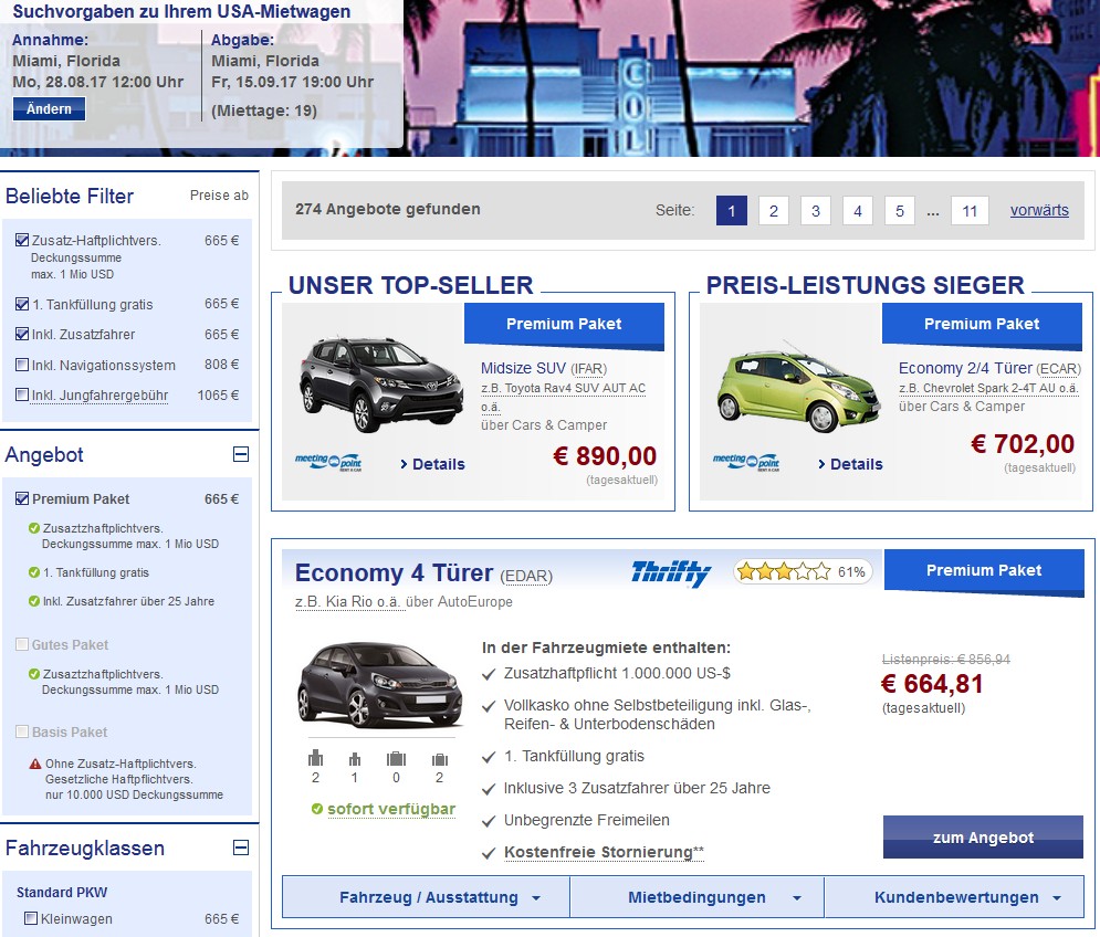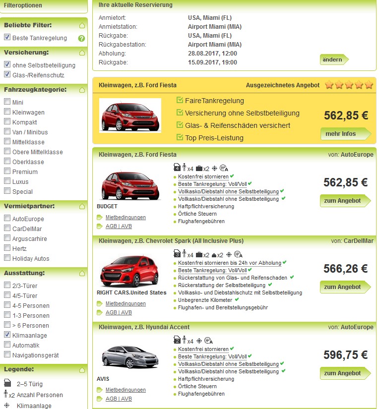 In Runde 2 geht es um den Mietwagen, der auch noch unabhängig von der Route ist. Anmietung und Abgabe wäre bei uns am Flughafen Miami. Wir brauchen auch nichts großes für zwei Personen. Das Gepäck (2 Reisekoffer + 2 x Handgepäck) sollte man selbst im Kleinwagen im Kofferraum und auf der Rücksitzbank vernünftig unterbringen können. Ein mobiles Navi werden wir wohl aus Deutschland mitbringen, daher ist das einzige Ausstattungsextra, das nach momentanen Überlegungen im Auto vorhanden sein sollte, eine Klimaanlage.