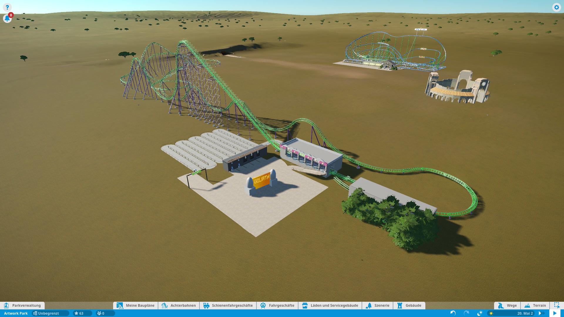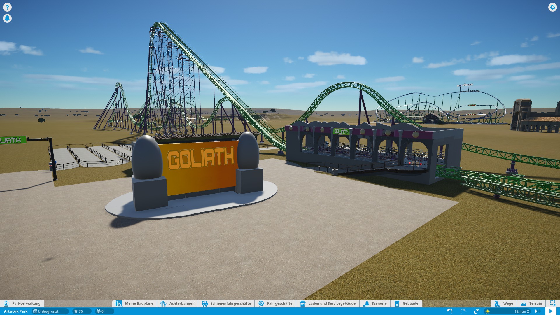 Weiter geht es mit Goliath. Auch hier fehlt es im eigentlichen Spiel an einigem. Auch hier könnte man wieder einiges selber bauen. Auch hier zeigt sich wieder der Zeitfresser. Egal, die Bahn macht sich gut im Park, von daher: Alles gut.