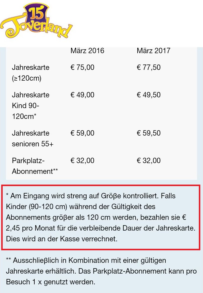 Witziges Modell, was das Toverland da anbietet, wird jedoch ohne Grauzonen schwer durchsetzbar sein und in der Praxis werden wohl öfter Augen zugedrückt, als das jetzt schriftlich vielleicht rüberkommt.