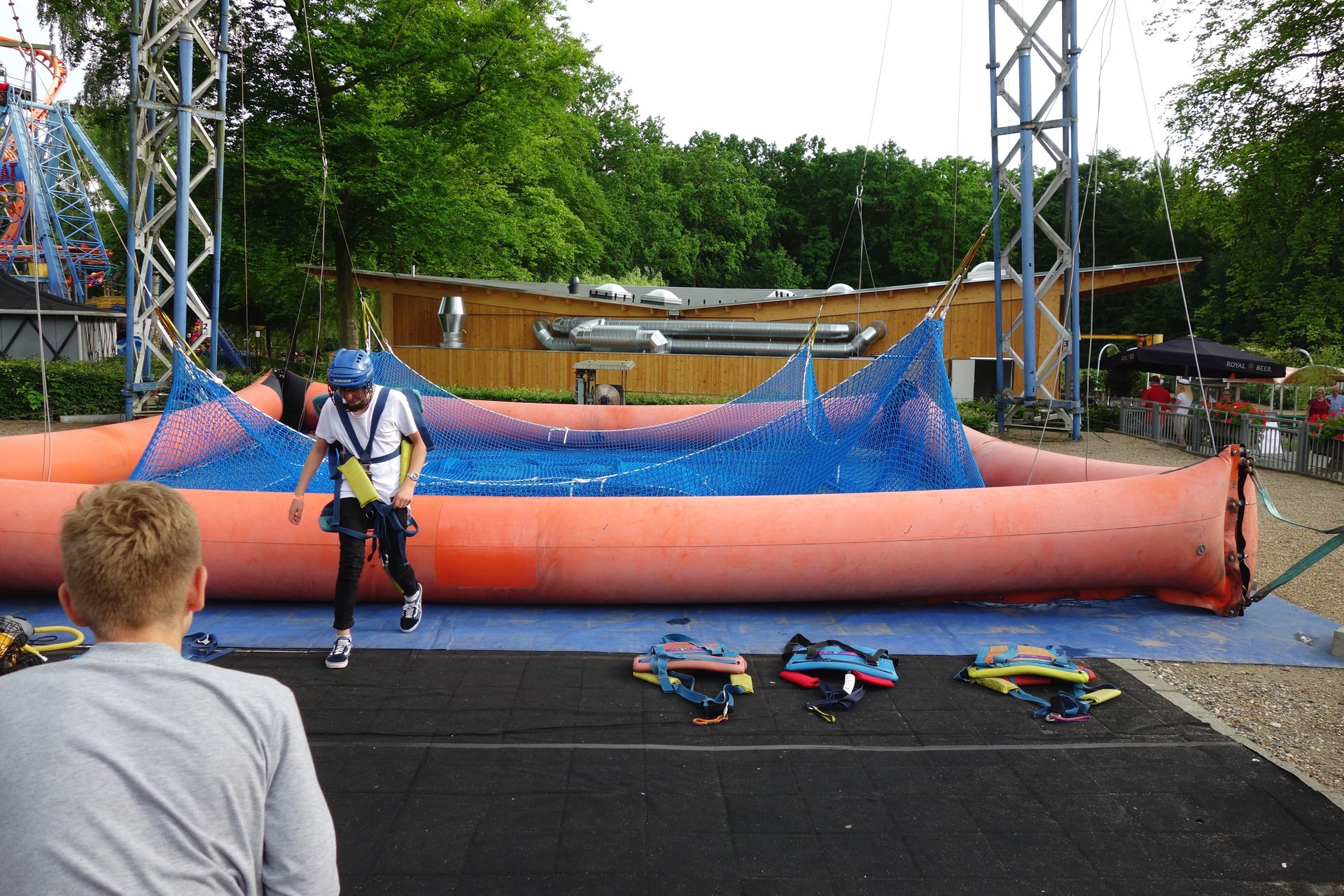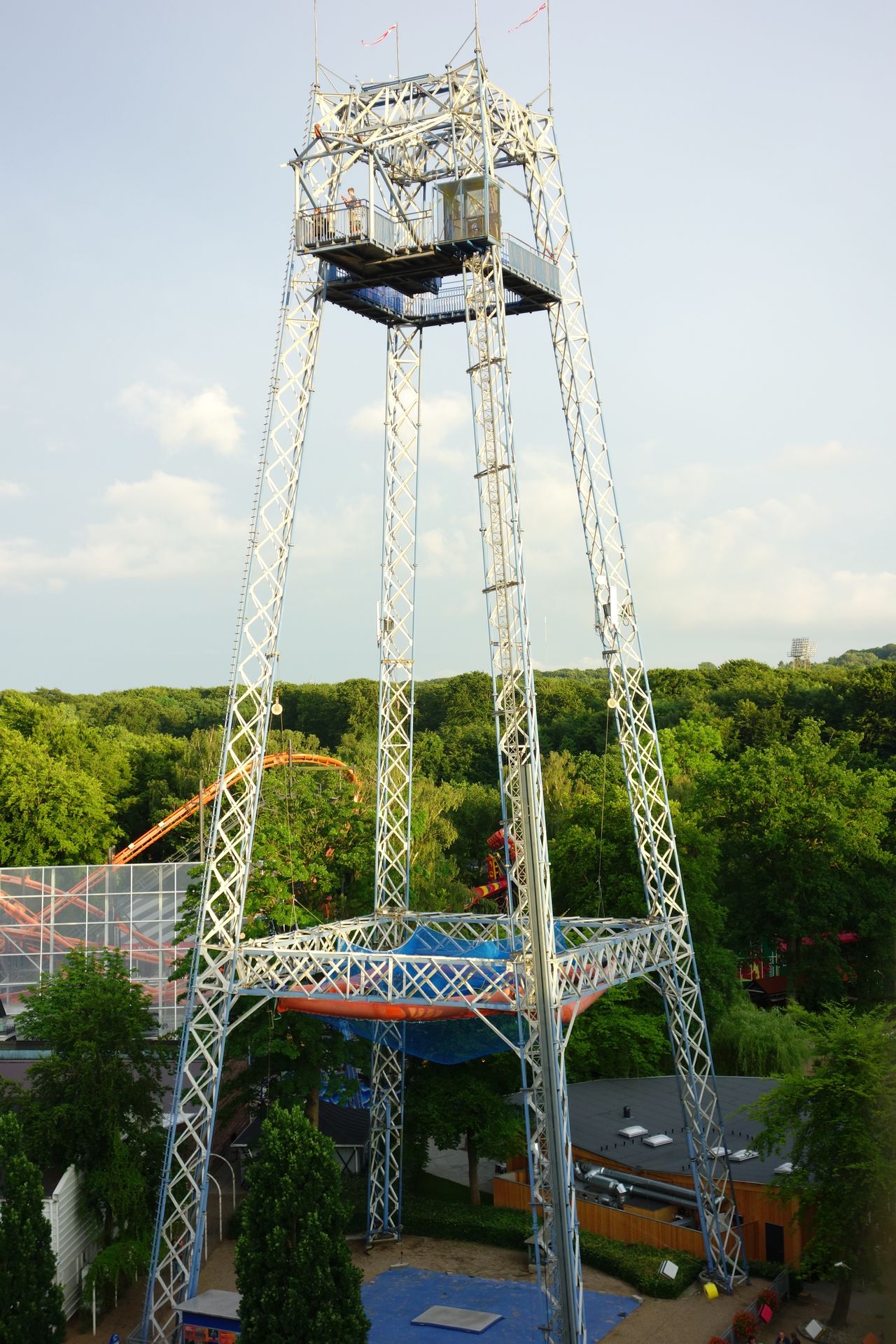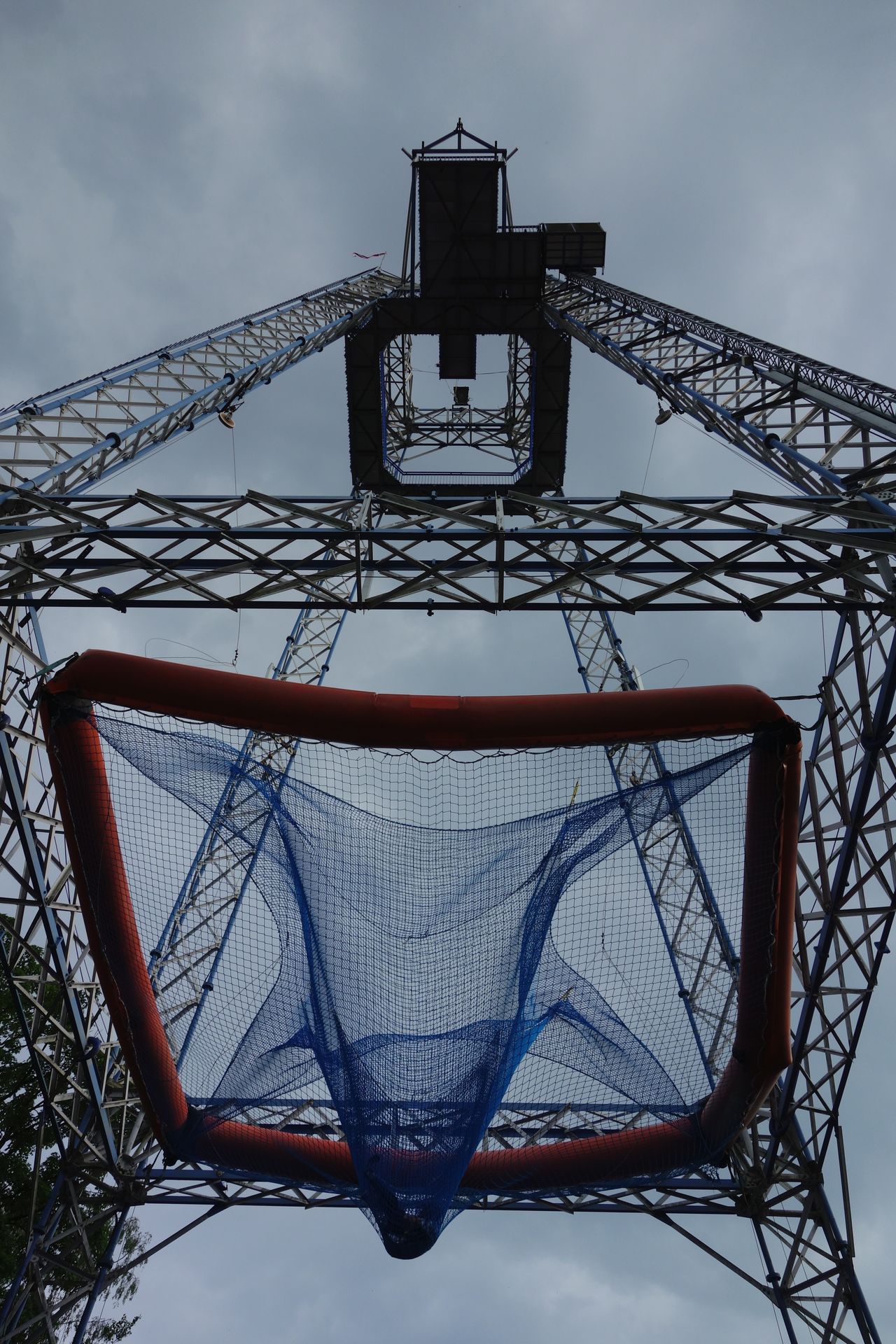 Dort konnten auch wir dann zunächst die Aussicht genießen, nacheinander mussten wir uns dann allerdings dazu überwinden, uns in den Haken einzuklinken, in die Mitte gefahren zu werden und schließlich ausgeklinkt zu werden. Ohne Seil oder sonstige Sicherung rast man dann also gen Erdboden und landet im sogenannten SCAD, dem Suspended Catch Air Device. Ein Netz, welches den Fall nach 30 Metern sanft bremst und schließlich auf den Boden der Tatsachen abgesenkt wird. Erfunden wurde das alles übrigens in Deutschland, von Montic in Hamburg. Entsprechend liegt auch eine Prüfung des TÜV Produkt Service München vor. Der erste SCAD-Sprung fand 1997 vor dem Schloss Neuschwanstein statt, dort hing das Netz an einem Helikopter. Die Anlage im Tivoli Friheden war 2001 die erste feste Installation in Europa.