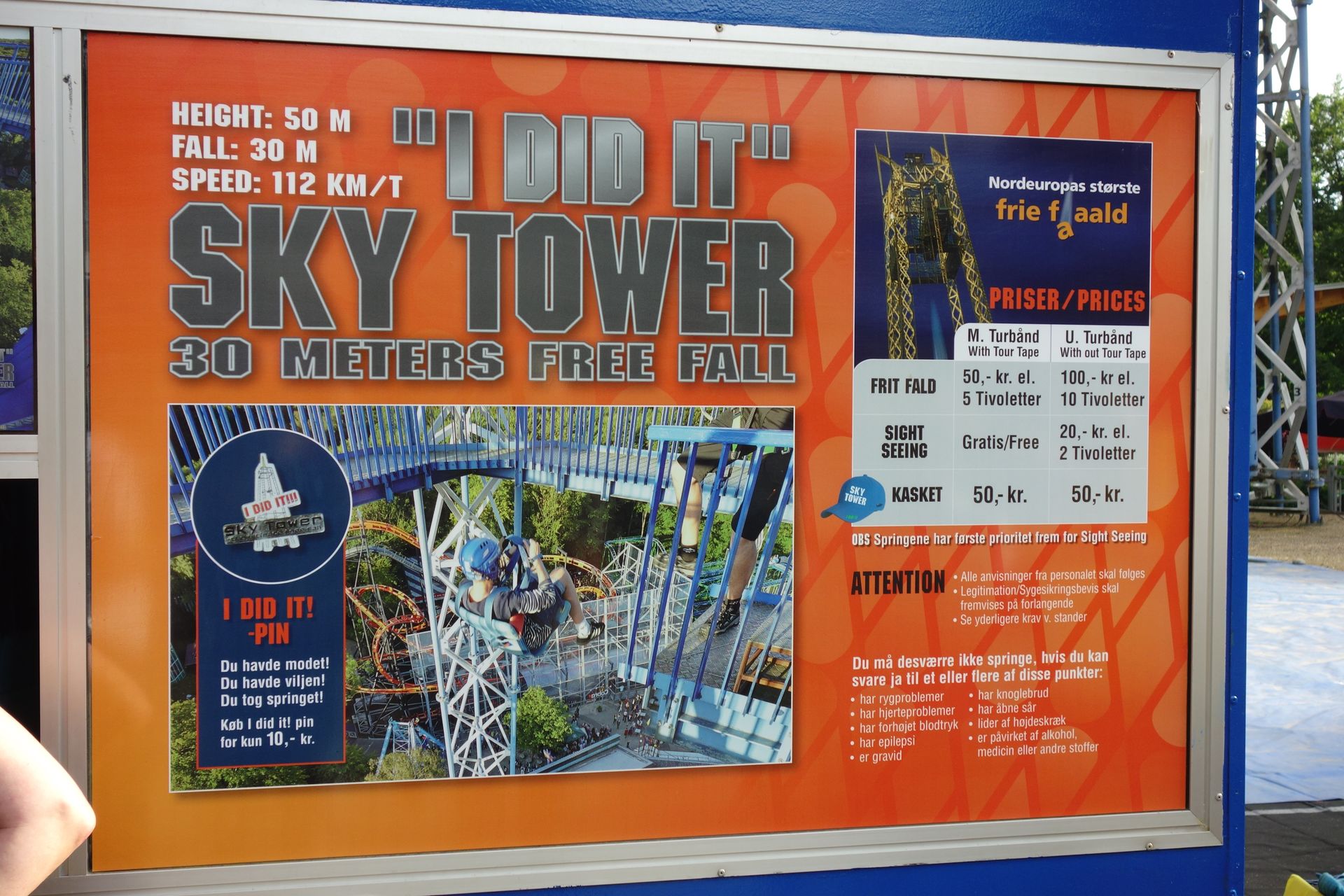 Wie man der Preisliste entnehmen kann, könnte man mit dem Wristband jederzeit einfach so per Aufzug nach oben fahren und von dort die Aussicht genießen. Dann geht es allerdings auch wieder per Aufzug nach unten. Wer den freien Fall erleben möchte, muss zunächst nochmals 50 Kronen extra zahlen. Das war uns die Sache aber definitiv wert, und so entrichteten wir unseren Obolus und wurden ebenfalls schnell vorbereitet.