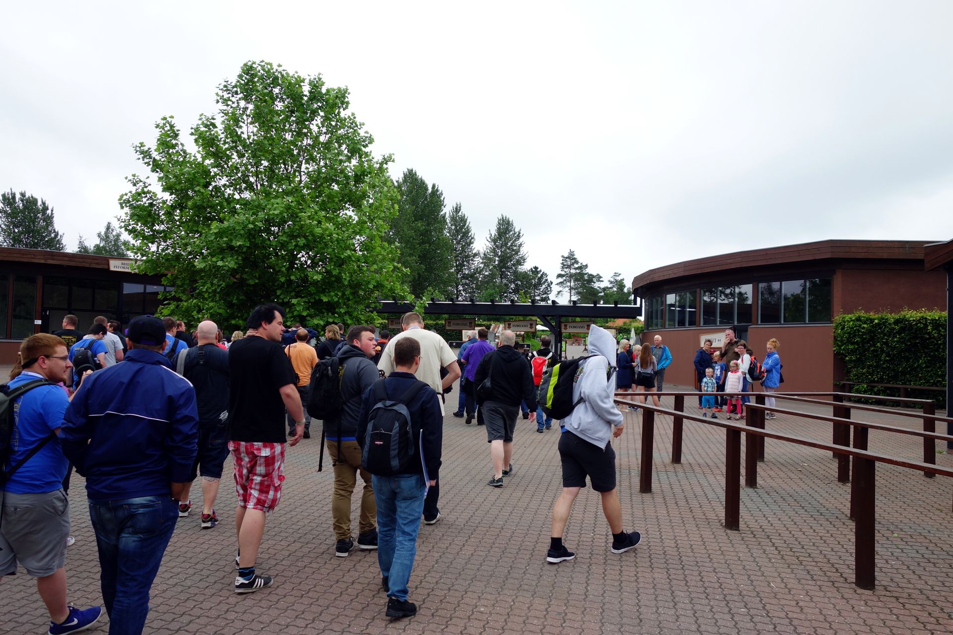 Für viele war dies das beste Essen der Tour. Ich sehe das leider etwas anders. Schlecht war es definitiv nicht, es gab eine große Auswahl frisch gegrillten Fleisches oder auch Burger samt Beilagen. Sehr lecker, bloß waren alle Stücke, die ich mir genommen hatte, nicht mehr allzu warm, als ich meinen Sitzplatz erreicht hatte. Die Schlangen am Buffet und an der Getränkestation waren wohl einfach zu lang und zu langsam. Vom Weg hinauf zu unseren Tischen ganz zu schweigen. Auch war die gesamte Atmosphäre nicht wirklich mein Fall. Eine große Halle mit umlaufender Galerie als zweiter Ebene. Ziemlich voll und damit unheimlich laut. Da hatten wir in den anderen Parks deutlich angenehmere Locations und kaltes Essen hatte ich sonst auch nirgendwo auf dem Teller. Lecker war es ohne Zweifel, aber insgesamt habe ich persönlich beispielsweise in Kolmården einfach besser gegessen. Aber immerhin hatten wir einen perfekten Zeitpunkt für das Essen ausgewählt, denn während wir drinnen waren, hatte es draußen wohl einen kurzen Regenschauer gegeben...
