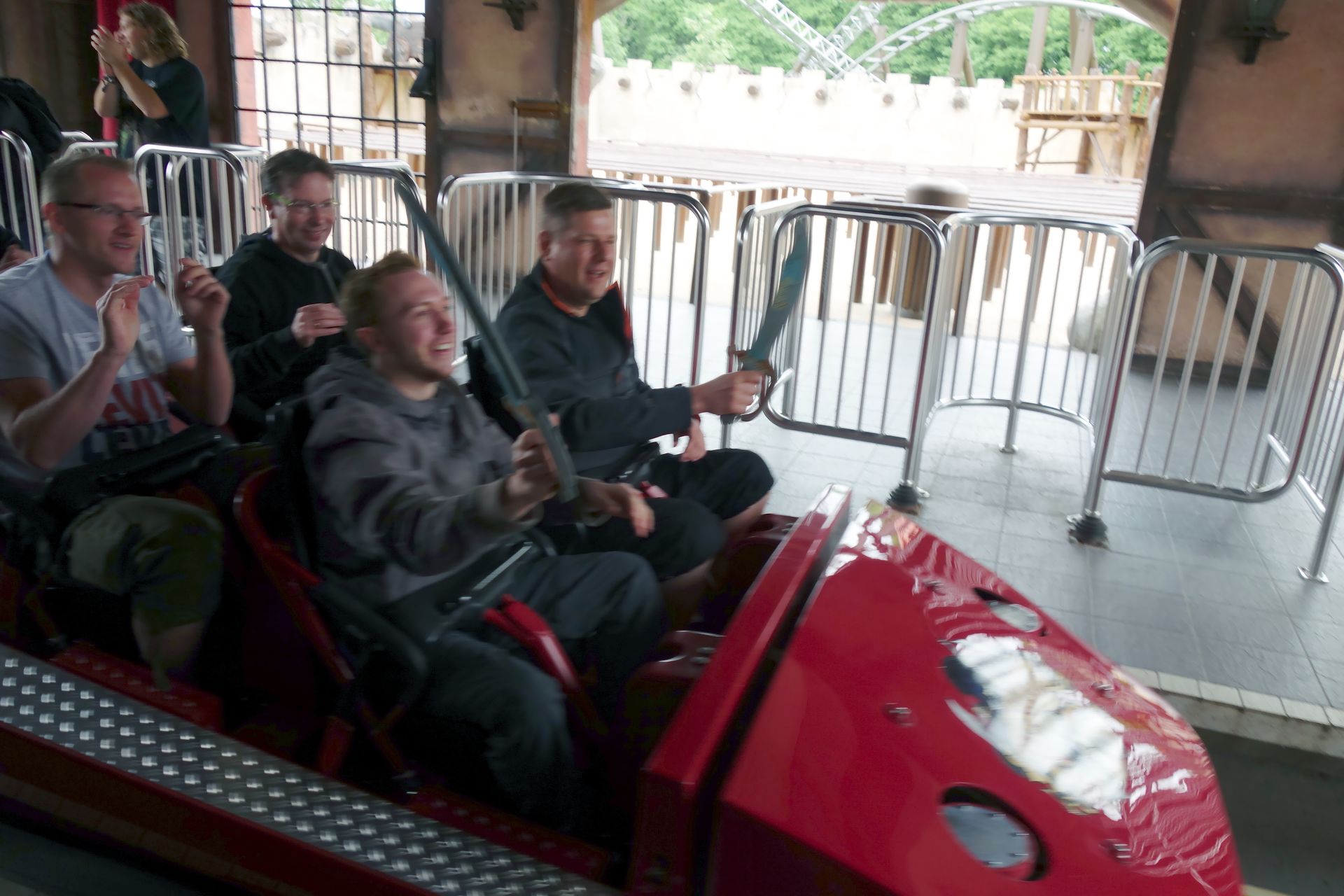 ) GoPro-Halterung ausgestattet war, konnten wir im anderen Zug auch eigentlich immer sitzen bleiben beziehungsweise untereinander die Plätze tauschen. Doch als ob die ERT an sich nicht schon geil genug gewesen wäre, drückten die Ride-Ops nach einigen Runden der First Row einen Schaumstoff-Säbel in die Hand. Für das "Sword-Game" sollte dieser ab dem