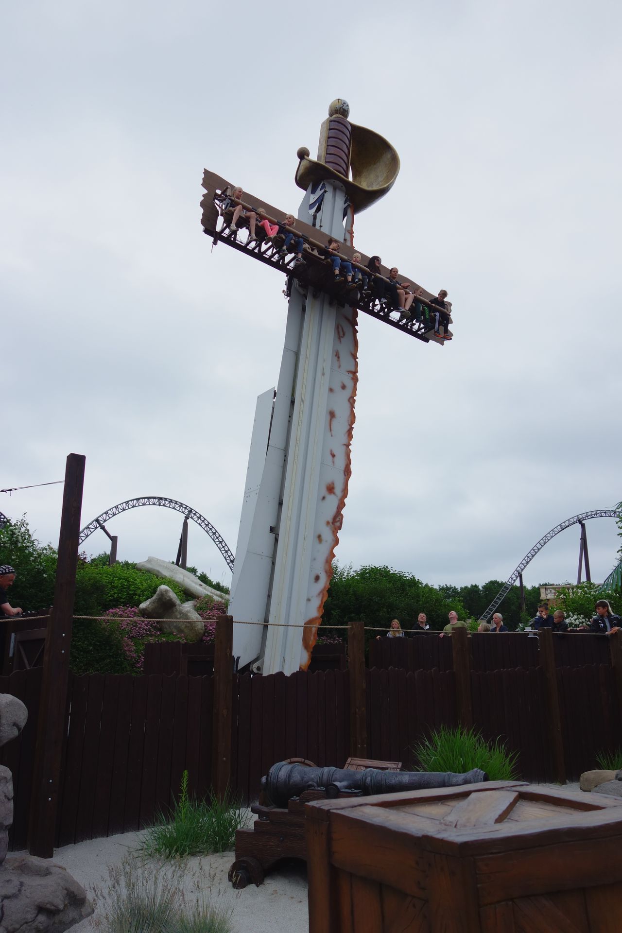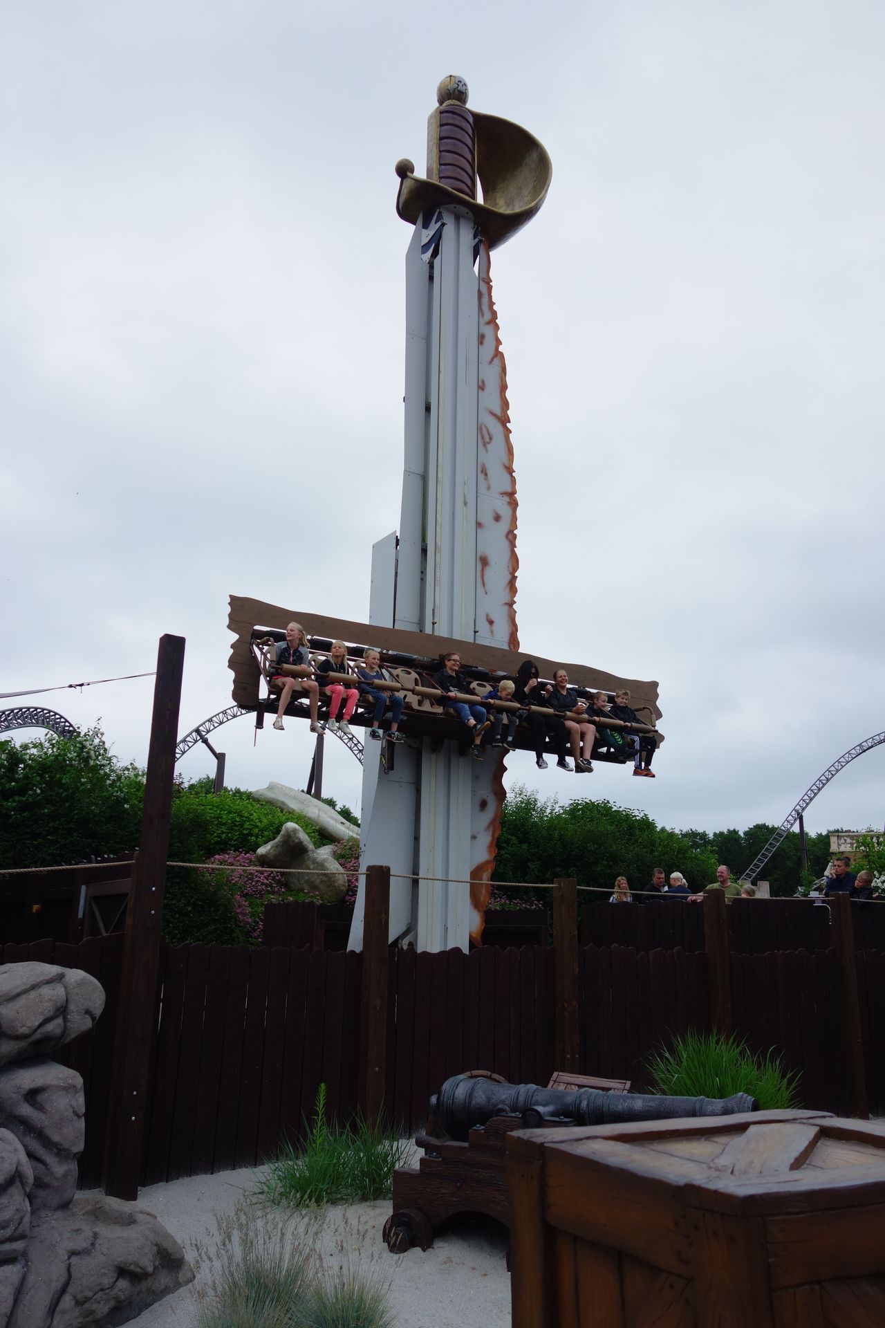 Der 2010 eröffnete Tower sieht nicht nur klasse aus, auch die Fahrt ist in Ordnung. Auch wenn sie einen richtigen Freifallturm leider nicht ersetzen kann. Übrigens waren die Mitarbeiter auch hier wieder (fast) überall super drauf. Das zeigte sich ja schon morgens bei der ERT, und auch hier nochmal, wo der Ride-Op mit dem zur "Piraten-Uniform" gehörenden Schaumstoffsäbel an den Hälsen der durch den Bügel wehrlosen Besucher vorbeiging. Er schien voll in seiner Rolle als Pirat aufzugehen.
