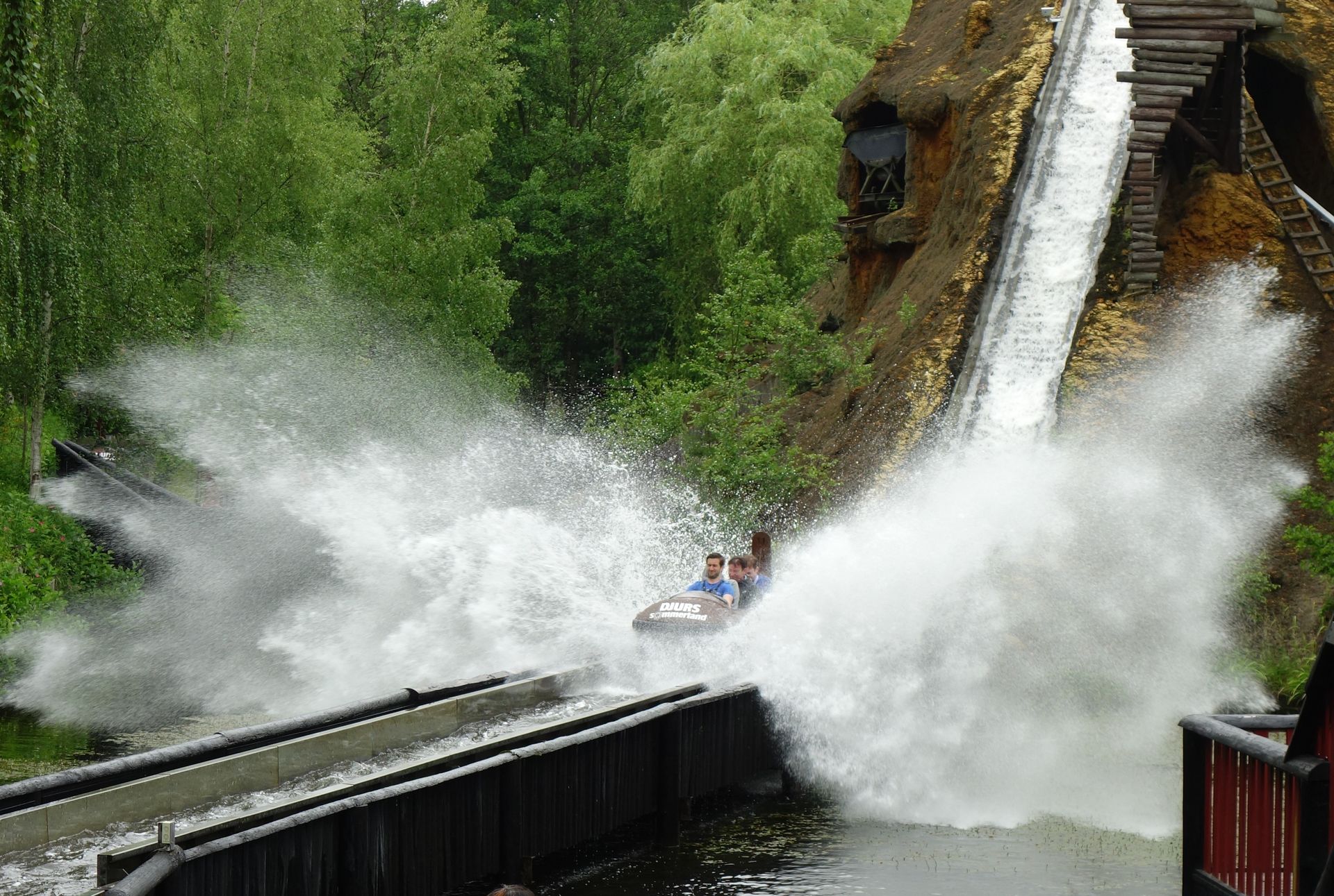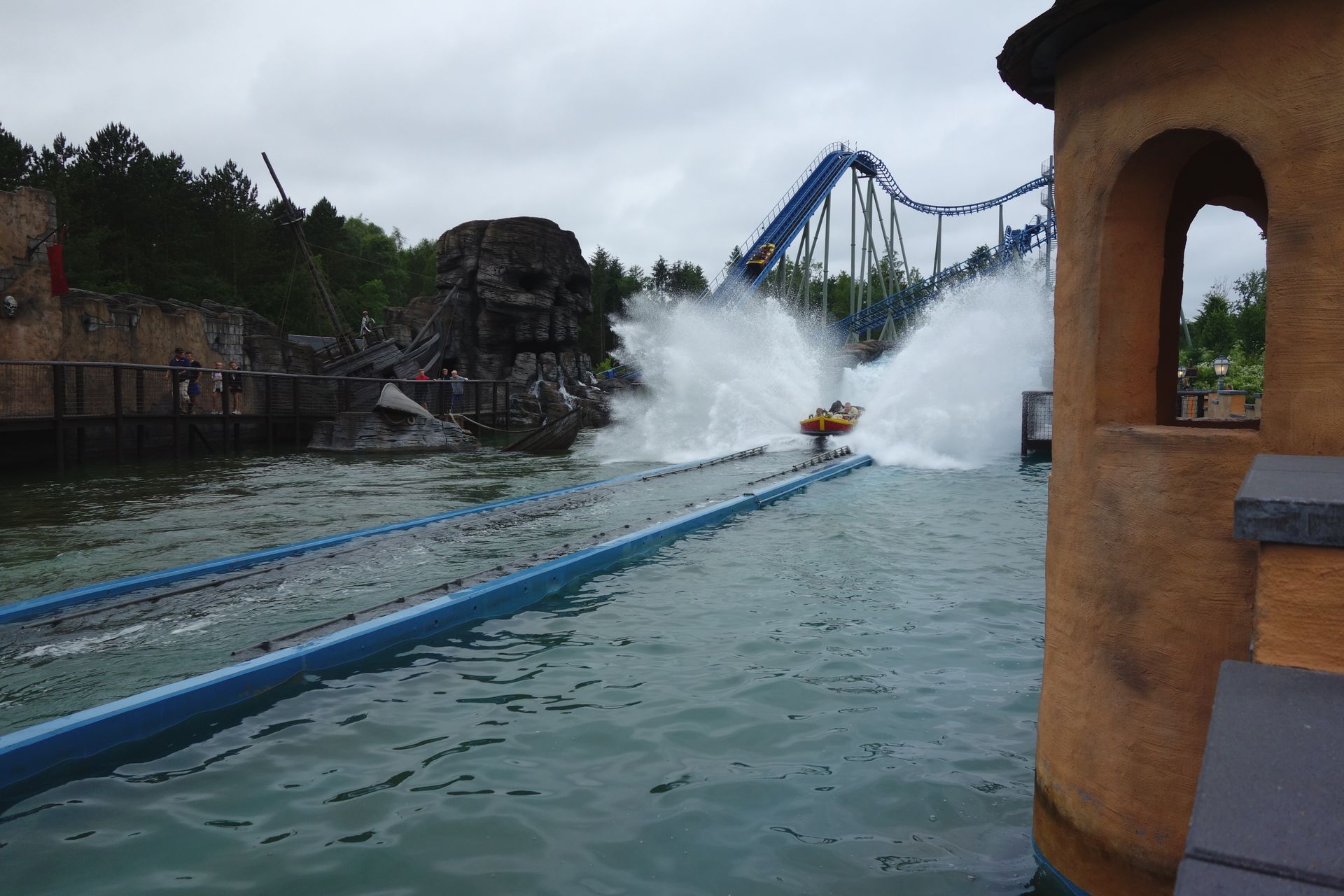 Blockbremse. Bis dahin stimmt das Layout mit Poseidon überein - wenn auch spiegelverkehrt. Statt der geschwungenen Abfahrt aus Rust, geht es hier nun klassisch gerade hinab und über den obligatorischen Hügel samt seitlicher Wasserfälle hinein ins kühle Nass. Ein zweiter Lift samt Drop fehlt obendrein komplett, ist für den Fahrspaß aber auch nicht nötig. Die Fahreigenschaften sind auf jeden Fall deutlich besser als bei dem 11 Jahre älteren Modell in Rust.