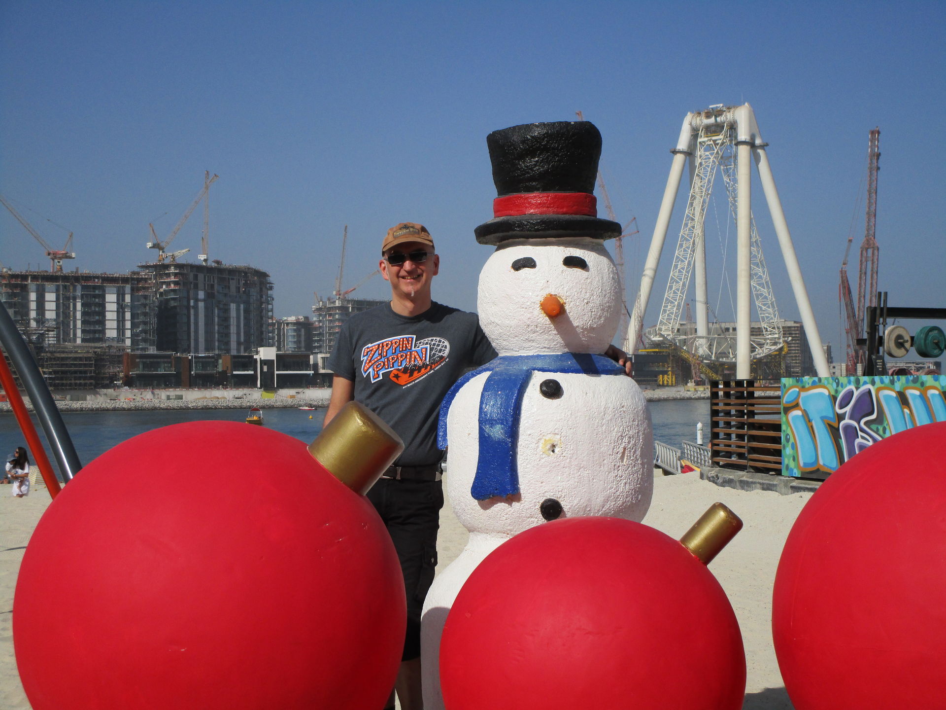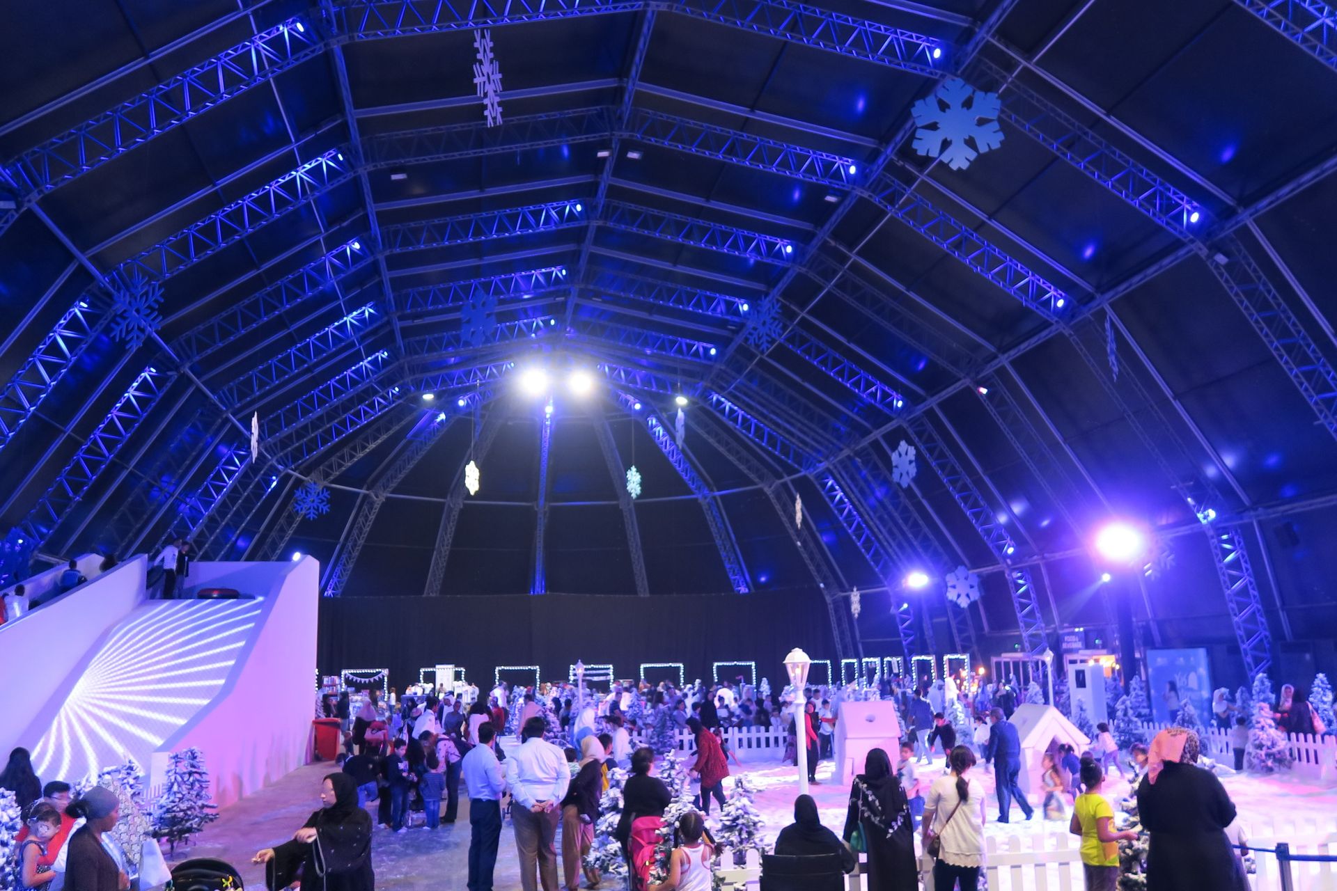 Bei immer noch 30° C im Schatten kann man hier Schlitten fahren, eine Schneeballschlacht machen, Schlittschuhlaufen, es werden Eisskulpturen geschnitzt und in geregelten Abständen schneit es sogar aus Schaumkanonen; ein grandioser Effekt, der vor allem jetzt in der Dämmerung täuschend echt aussieht.
