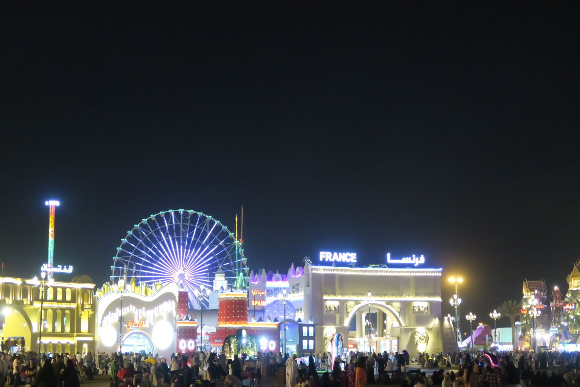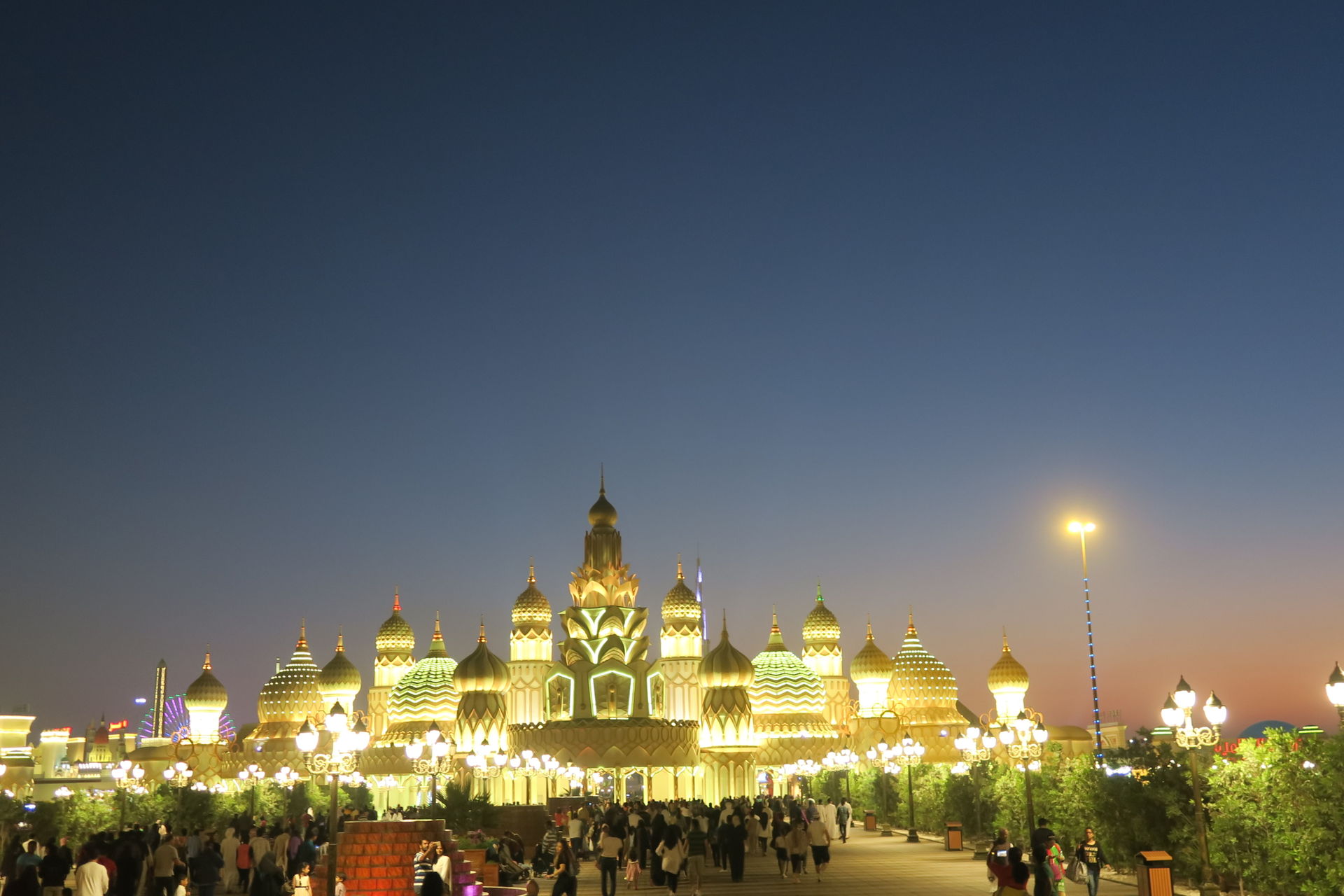 Ganz Global Village sieht aus wie ein beleuchteter Weihnachtsbaum. Nicht nur während der Feiertage.