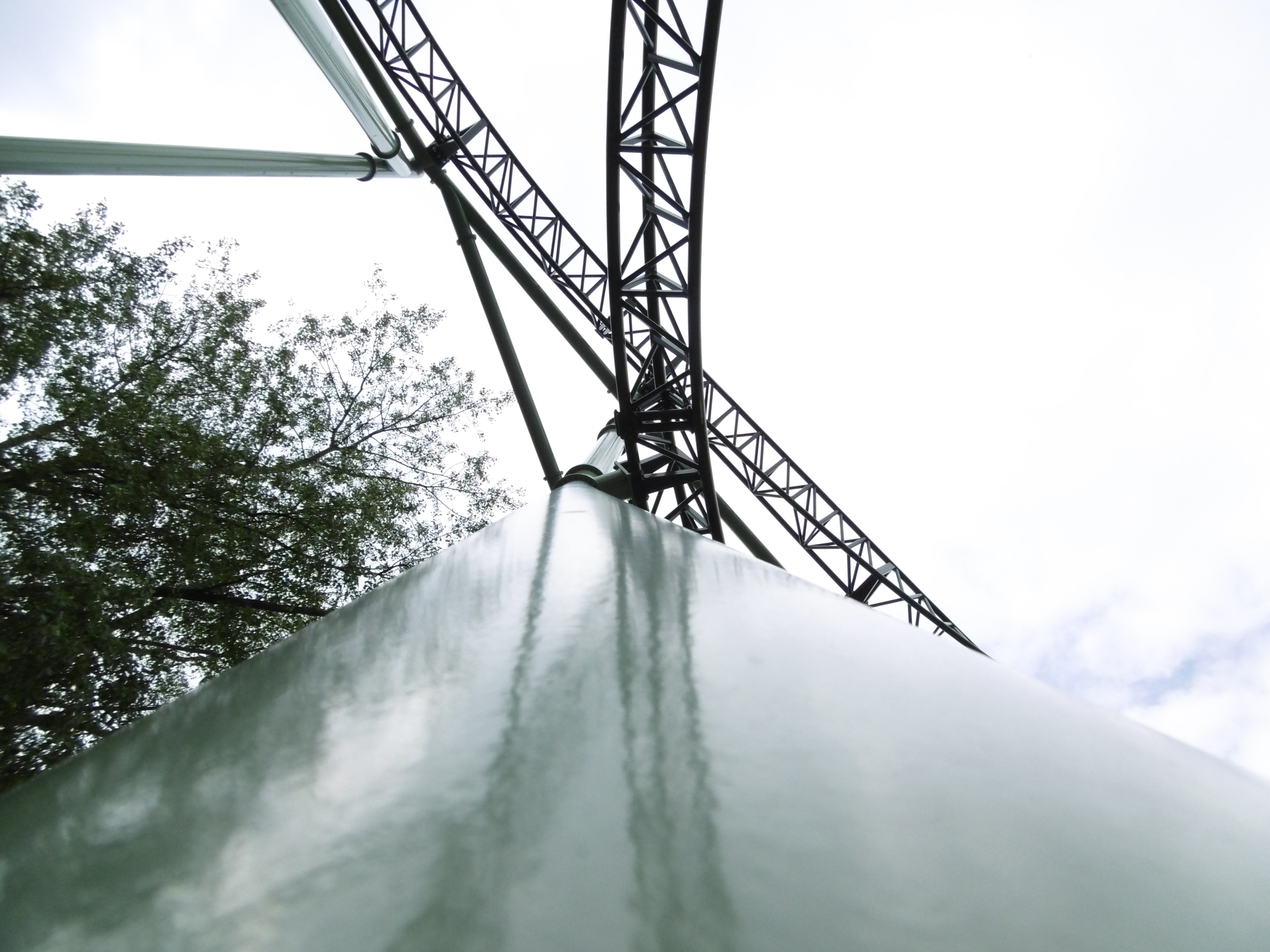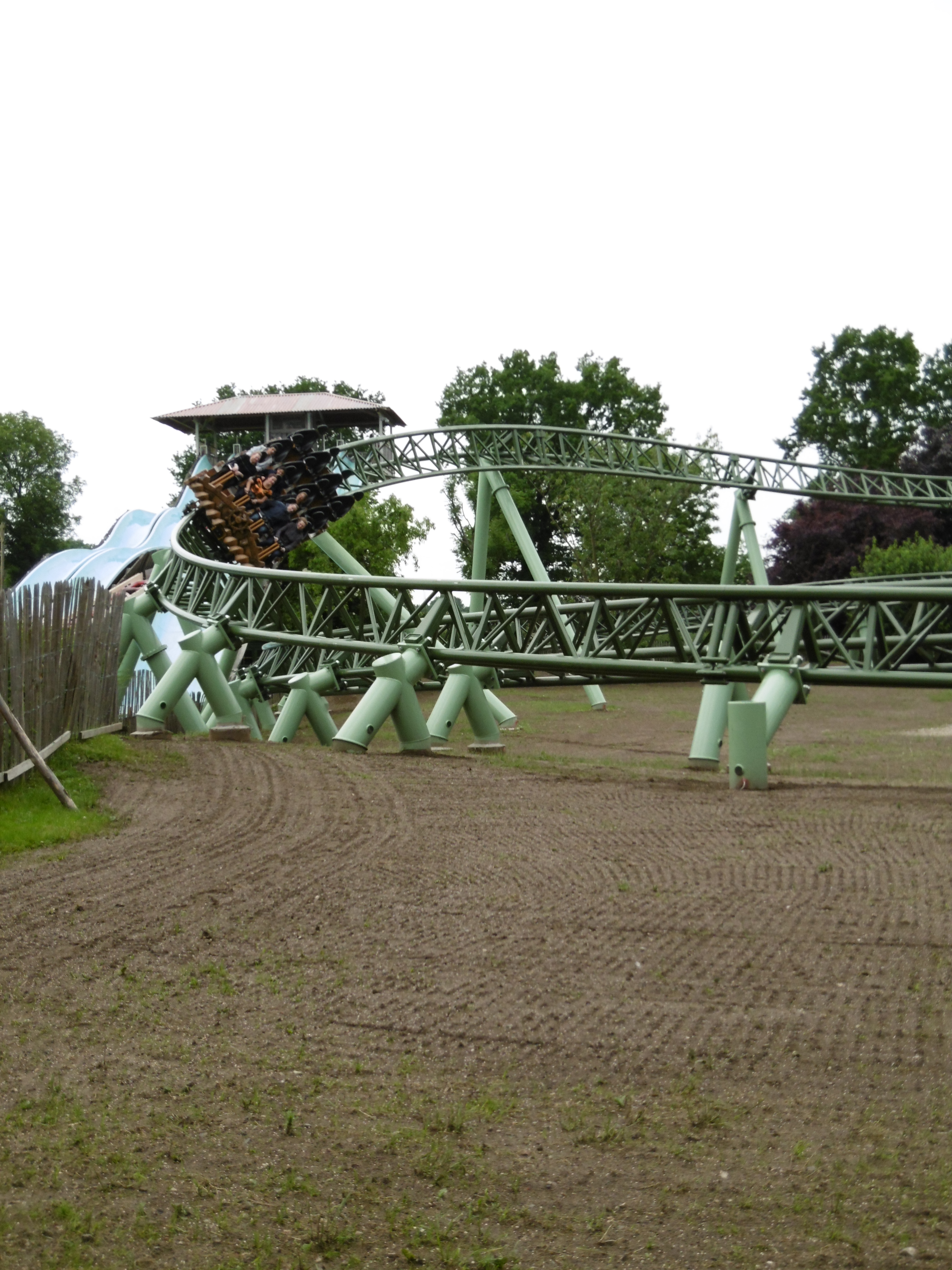 Nach jeder Fahrt arbeiteten wir uns immer dann weiter nach hinten. Aufgrund einer fehlenden Warteschlange konnten wir dies ungehindert tun und mussten nur die – als Ewigkeit empfundene – Wartezeit bis zur Abfahrt abwarten. Nach zwei Runden waren wir dann im letzten Wagen angelangt. Mit einem wiedermal sehr weit offenen Bügel ging es dann erneut auf 26 Meter Höhe. Nach einer langen Linkskurve geht es dann wieder hinab in den Wald aus Bäumen und Stützen. Schon hier zeigt sich ein angenehmes Schweben im Sitz und ich mache mir das erste Mal Gedanken darüber, ob ich den Bügel nicht ein bisschen weiter schließen sollte. Doch ich widersetzte mich diesem Drang, da ich das Gefühl zu sehr liebe und es ging mit einigem Druck ab in den