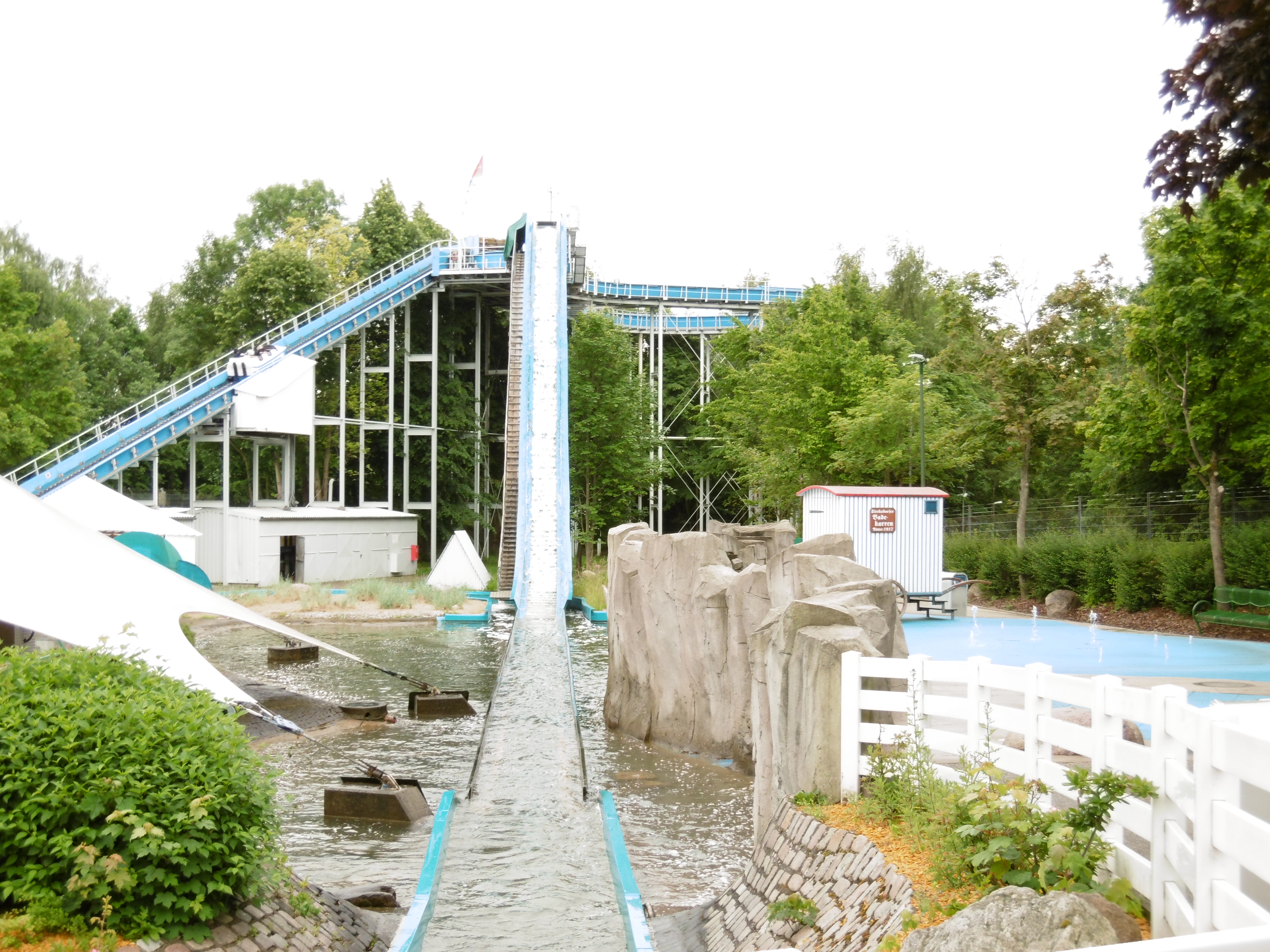 Die Sprungschanze mag von außen ziemlich unspektakulär wirken, aber sie bewirkt wunder. Zur Erinnerung: Eine Rückhaltesicherung wie bei anderen Attraktionen dieser Art fehlt. Es ist schon ein komisches Gefühl gewesen, wenn mitten in der Abfahrt und der Angst vor einer Mörderwelle auf einmal der Hintern den Bodenkontakt verliert. Zum Glück konnte ich mich zu einer Fahrt überwinden, spätestens nach diesem Fahrerlebnis hatte es sich sehr gelohnt in die nun dreißig Jahre alte Bahn zu steigen.